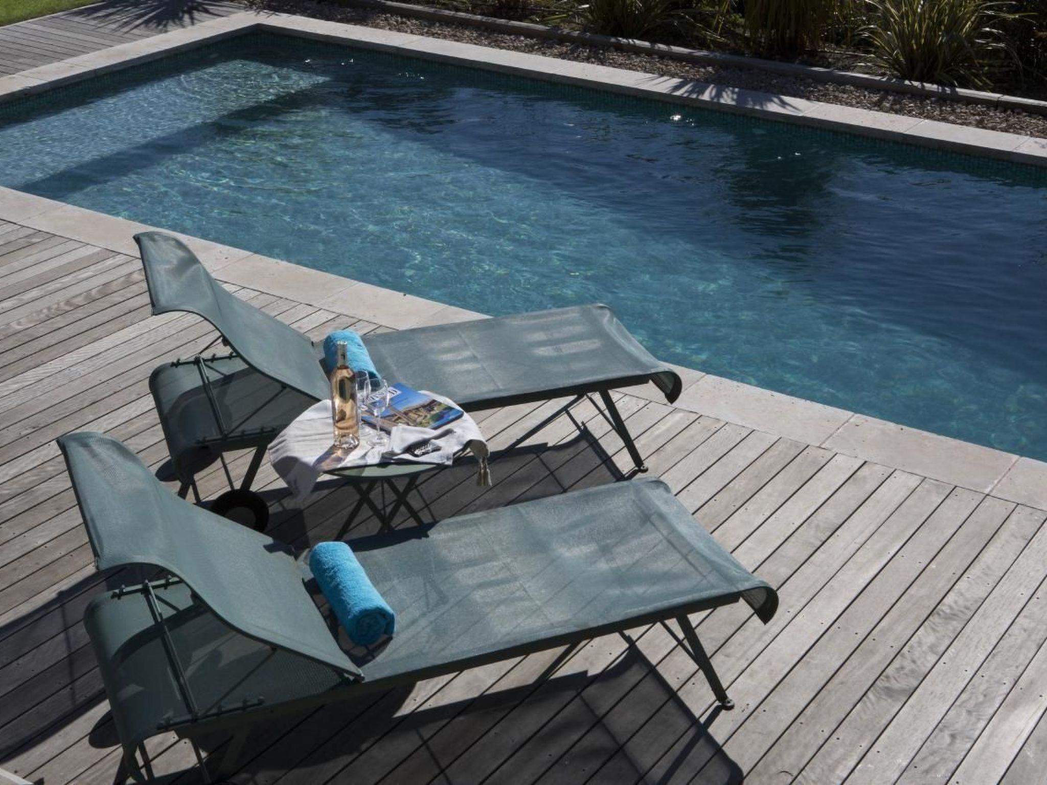 The exterior of the property is equally impressive, with two French windows leading to a large terrace overlooking a well-tended landscaped garden and private swimming pool, all beautifully lit at night. It's the perfect place to relax in the Provencal sunshine, cool off or host al fresco dinners in a private and enchanting setting.