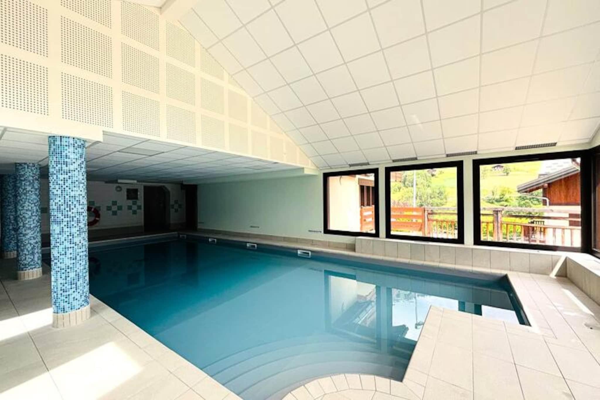 In the serene embrace of the French Alps, this charming apartment in the Les Chalets des Evettes residence offers a perfect retreat for mountain enthusiasts. With breathtaking views of Mont Blanc from your private balcony, the property combines the tranquility of alpine living with the convenience of direct access to the Espace Diamant ski slopes. Whether you're here for winter sports or summer adventures, this location promises unforgettable experiences year-round. The cozy three-room apartment, ideal for 4 to 6 guests, features a fully equipped kitchen, a comfortable lounge with a sofa bed, and two inviting bedrooms. The southwest-facing balcony is perfect for soaking in the sun or enjoying a quiet moment with the majestic Mont Blanc as your backdrop. Modern amenities like a heated indoor swimming pool, ski locker, and private parking ensure a comfortable and hassle-free stay. The residence is also pet-friendly, making it an excellent choice for families or groups traveling with furry companions. Beyond the residence, the vibrant village of Flumet, just 3 km away, offers a delightful blend of alpine charm and modern amenities. In winter, the Espace Diamant ski area, with its 192 km of slopes, caters to skiers of all levels. In summer, the region transforms into a haven for hikers and mountain bikers, with trails leading to panoramic views of the Aravis mountain range. Nearby attractions like the Flumet lake, artistic mini-golf, and various sports facilities provide endless entertainment for all ages. Whether you're seeking thrilling outdoor activities, peaceful alpine vistas, or a cozy home base for exploring iconic destinations like Megève, Chamonix, and Annecy, this apartment is your gateway to the best of the French Alps. Let the magic of Mont Blanc inspire your next adventure.