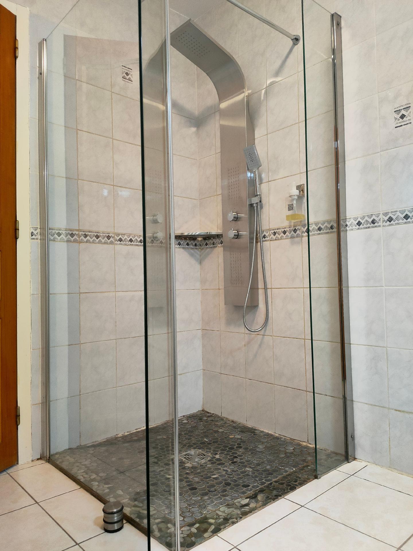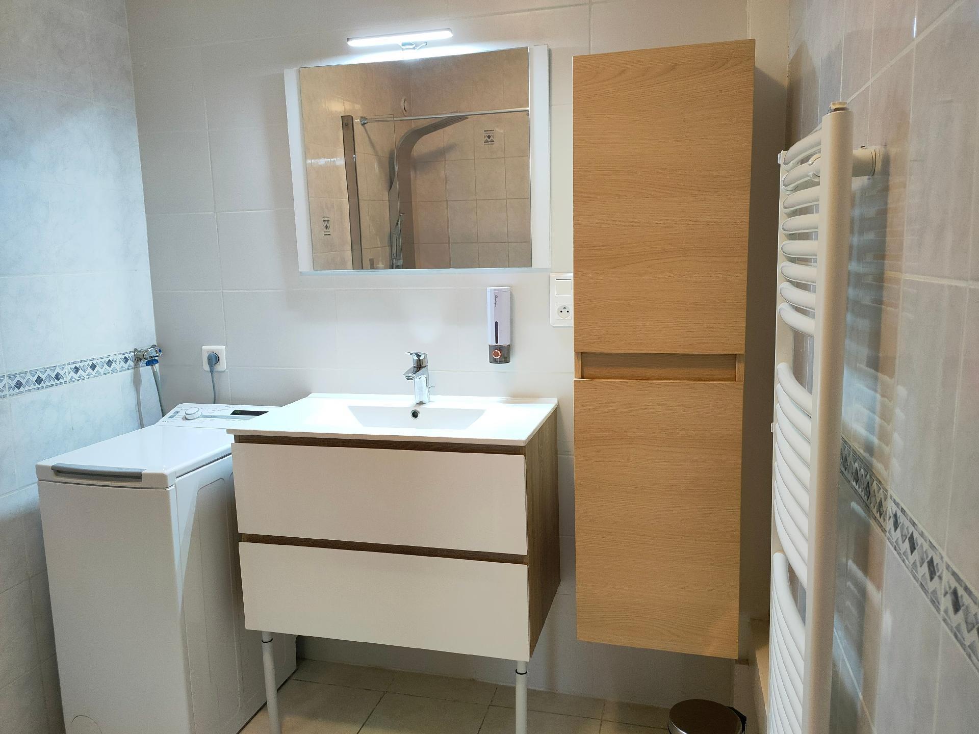~ Bathroom: Italian shower, single washbasin, washing machine, heated towel rail.