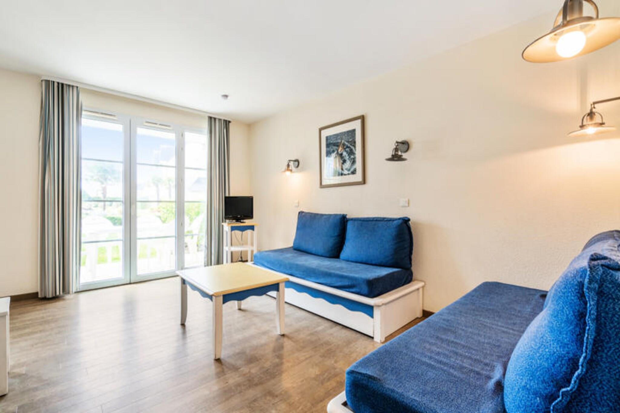 For a perfect weekend or vacation in Brittany, enjoy a charming apartment just steps from the beach. This pet-friendly accommodation includes a living area with two banquette beds, one of which has a pull-out bed, ideal for up to 5 guests. The two bedrooms offer a double bed and bunk beds, while the apartment features two bathrooms, one with a shower and WC, and the other with a bathtub. A parking space is provided within the residence for your convenience. Located near Fouesnant, the property offers easy access to a variety of attractions, cafes, and local markets. Spend your days exploring the picturesque coastline, enjoying the nearby beach, or discovering charming nearby villages. The area is perfect for those looking to immerse themselves in the beauty of Brittany while staying close to local amenities. This apartment comes with a fully equipped kitchen that opens into the living area, allowing guests to prepare their own meals. The dining table comfortably seats up to seven people, making it ideal for family meals. The spacious terrace provides a great outdoor space to relax, and the residence also features an outdoor pool, available from April to September.