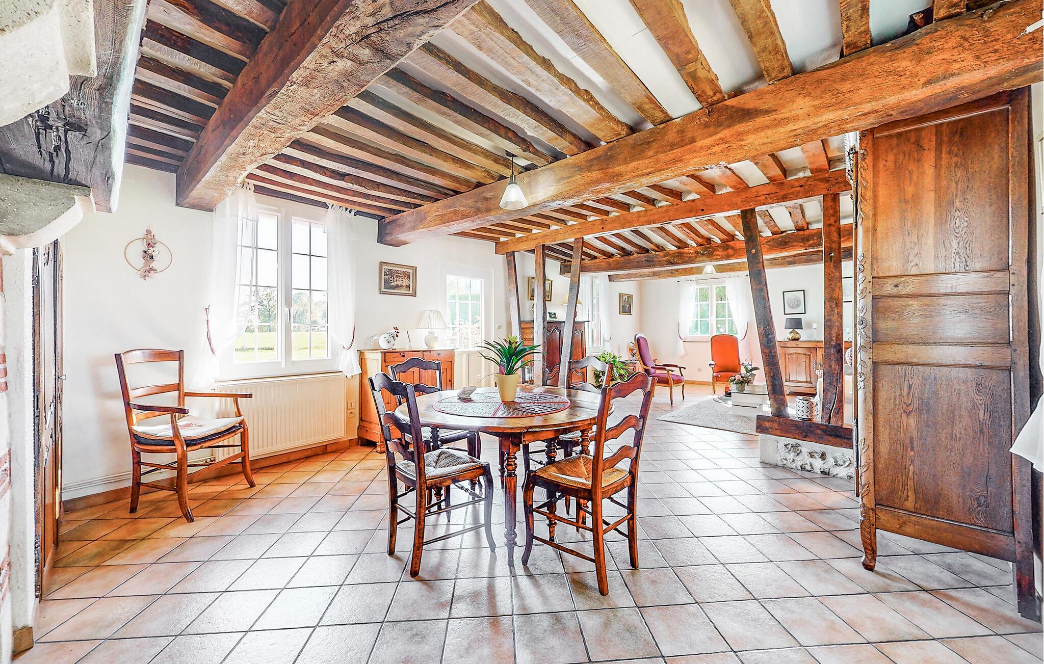 Eingebettet in einen weitläufigen Garten, ist dieses Haus eine Oase der Ruhe und Authentizität. Die Innenräume beeindrucken mit freiliegenden Holzbalken, warmen Holzmöbeln und einer einladenden Atmosphäre, die Geschichte und Komfort harmonisch vereint. Der großzügige Wohnbereich lädt zu geselligen Stunden ein, während die traditionelle Architektur den Charme der Normandie in jedem Detail widerspiegelt. Hier fühlen Sie sich sofort wie zuhause, umgeben von Natur und ländlicher Gelassenheit.
