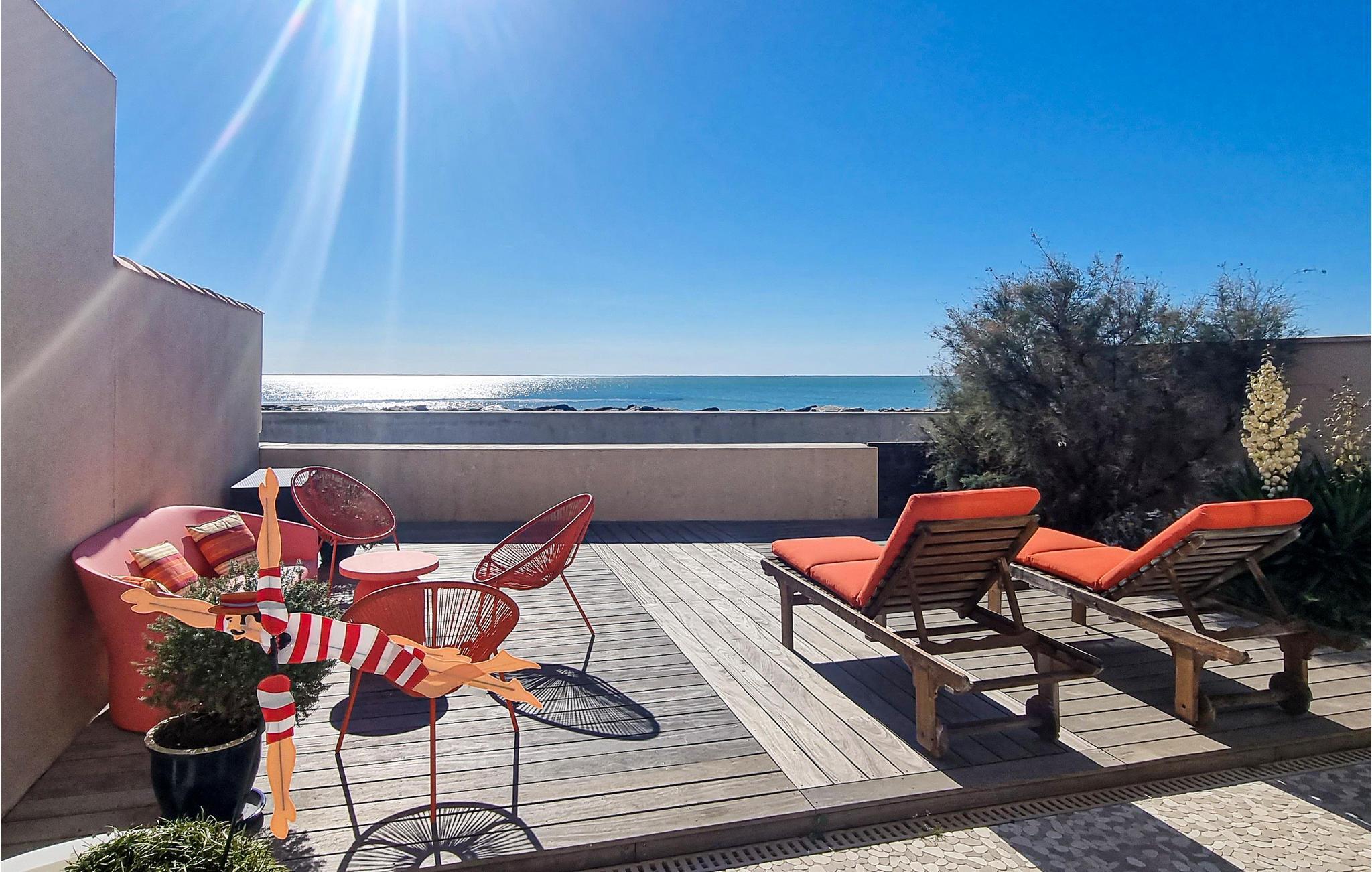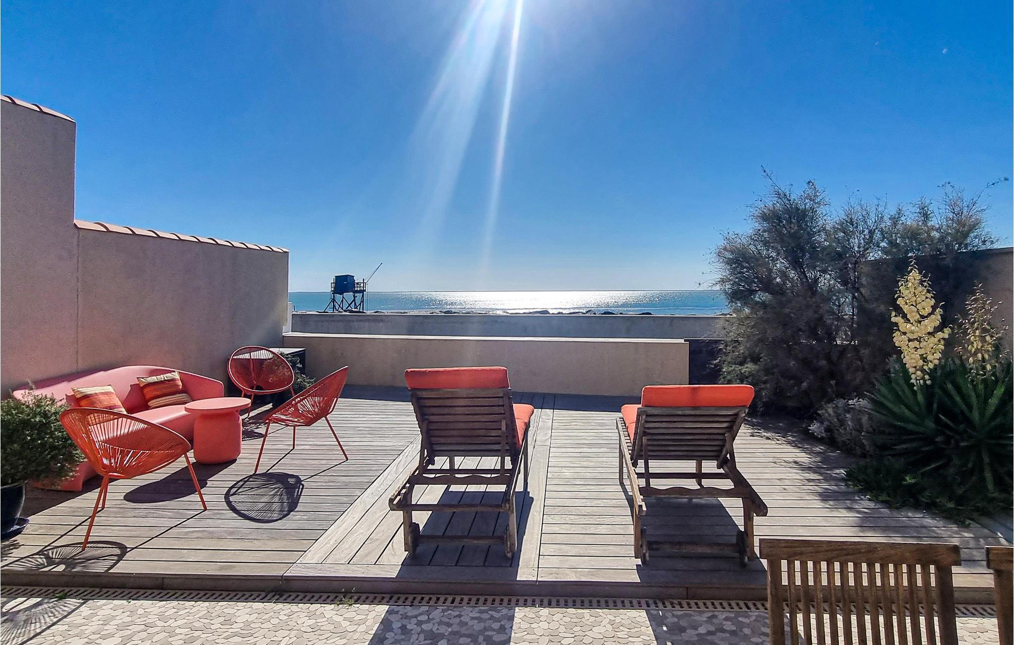 Die geräumige Terrasse, ist ein schöner Ort, wo Sie gemeinsam auf den Outdoor-Möbeln und Liegestühlen relaxen können und auf der Plancha Ihr Essen zubereiten können, während Sie unter der Markise sitzen.