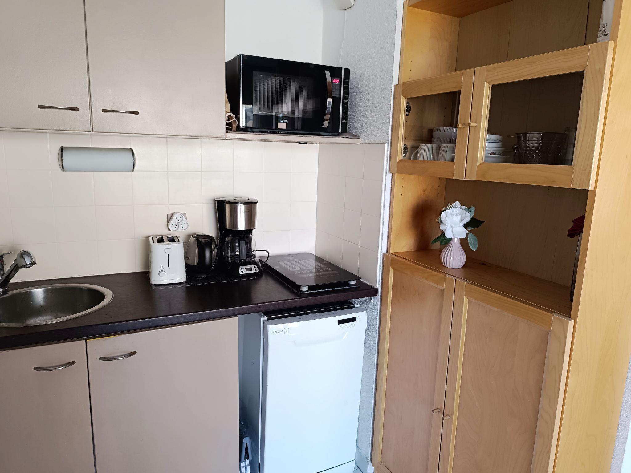2-room apartment 27 m2 on 3rd floor. Object suitable for 2 adults + 2 children. Living/dining room with 1 double sofabed (1 x 140 cm, length 200 cm), TV, flat screen, electric heating and air conditioning. Exit to the terrace, west facing position. 1 room with 1 french bed (1 x 140 cm, length 190 cm). Kitchenette (dishwasher, 2 induction hot plates, kettle, electric coffee machine). Shower, sep. WC. Electric heating. Terrace 7 m2. Terrace furniture. Facilities: washing machine. Internet (WiFi, free). Parking space n 18 (roofed), height 190 cm, width 205 cm. Please note: non-smokers only. 1 small pet/ dog allowed. TV only FR. Smoke alarm. Offer by a private individual according to Art. 155, IV of CGI.
