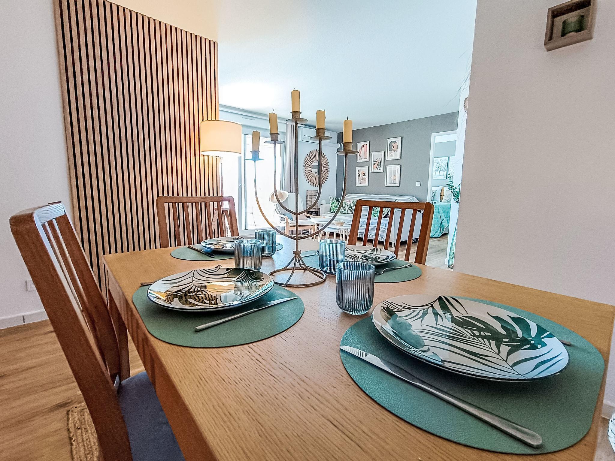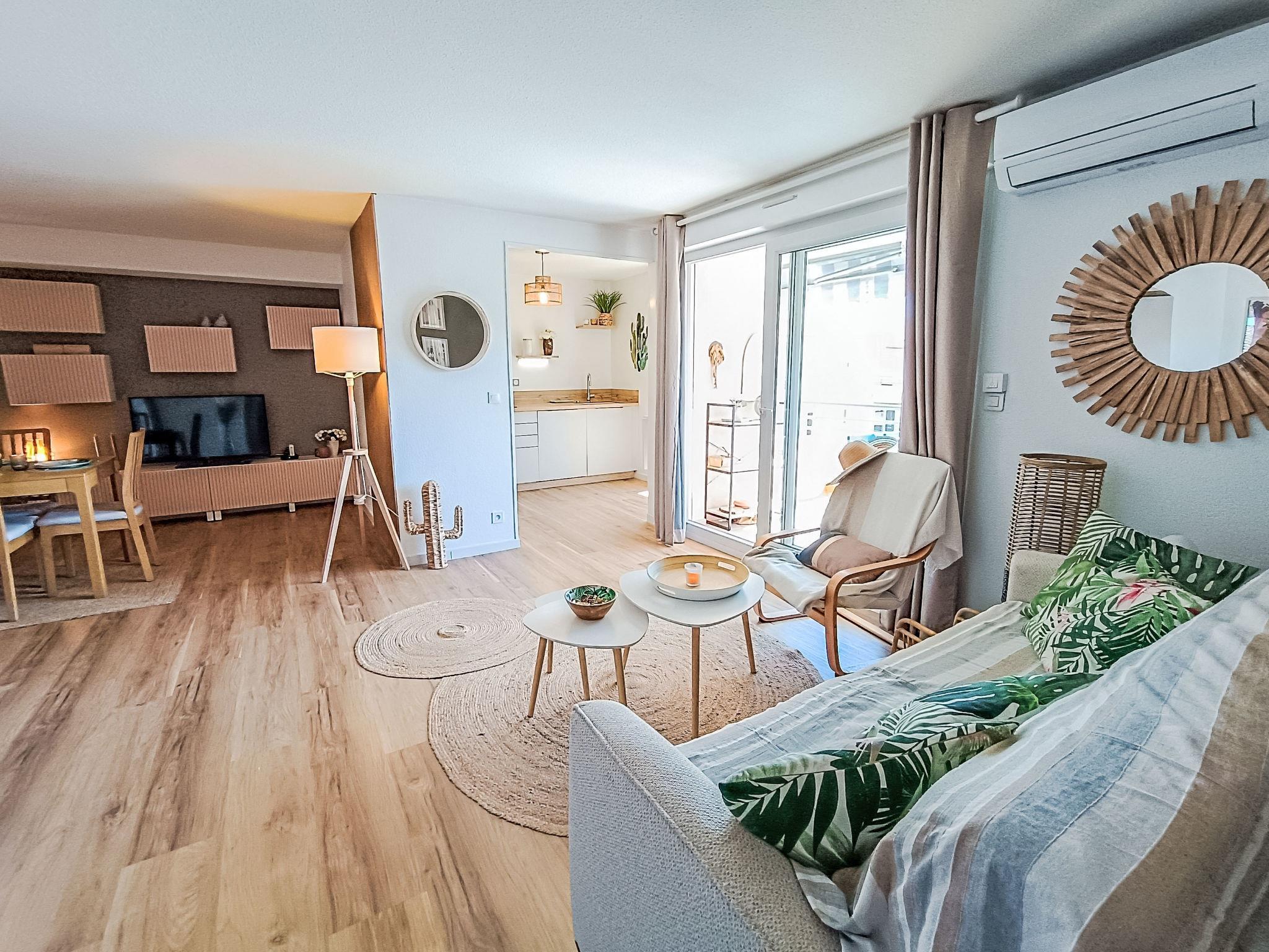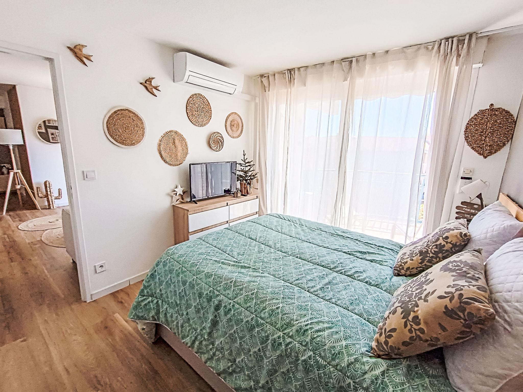 2-room apartment 56 m2 on 4th floor. Renovated in 2023: living/dining room with 1 double sofabed (140 cm, length 190 cm), TV (flat screen), electric heating and air conditioning. Exit to the terrace. 1 room with 1 french bed (1 x 140 cm, length 200 cm), TV (flat screen), electric heating and air conditioning. Kitchen (oven, dishwasher, 4 ceramic glass hob hotplates, kettle, microwave, electric coffee machine, Capsules for coffee machine (Senseo) extra). Shower, sep. WC. Electric heating. Terrace 6 m2. Terrace furniture. Facilities: washing machine, iron, hair dryer. Internet (WiFi, free). Garage space n 420, height 190 cm, width 275 cm. Please note: non-smokers only. TV only FR. Smoke alarm. Offer by a private individual according to Art. 155, IV of CGI.