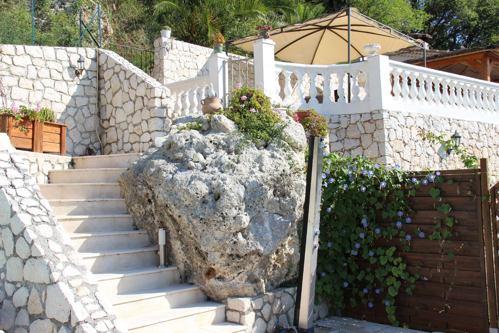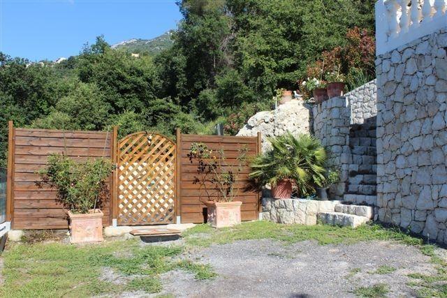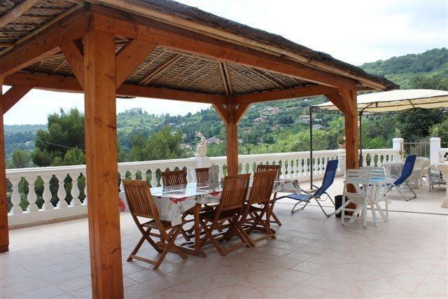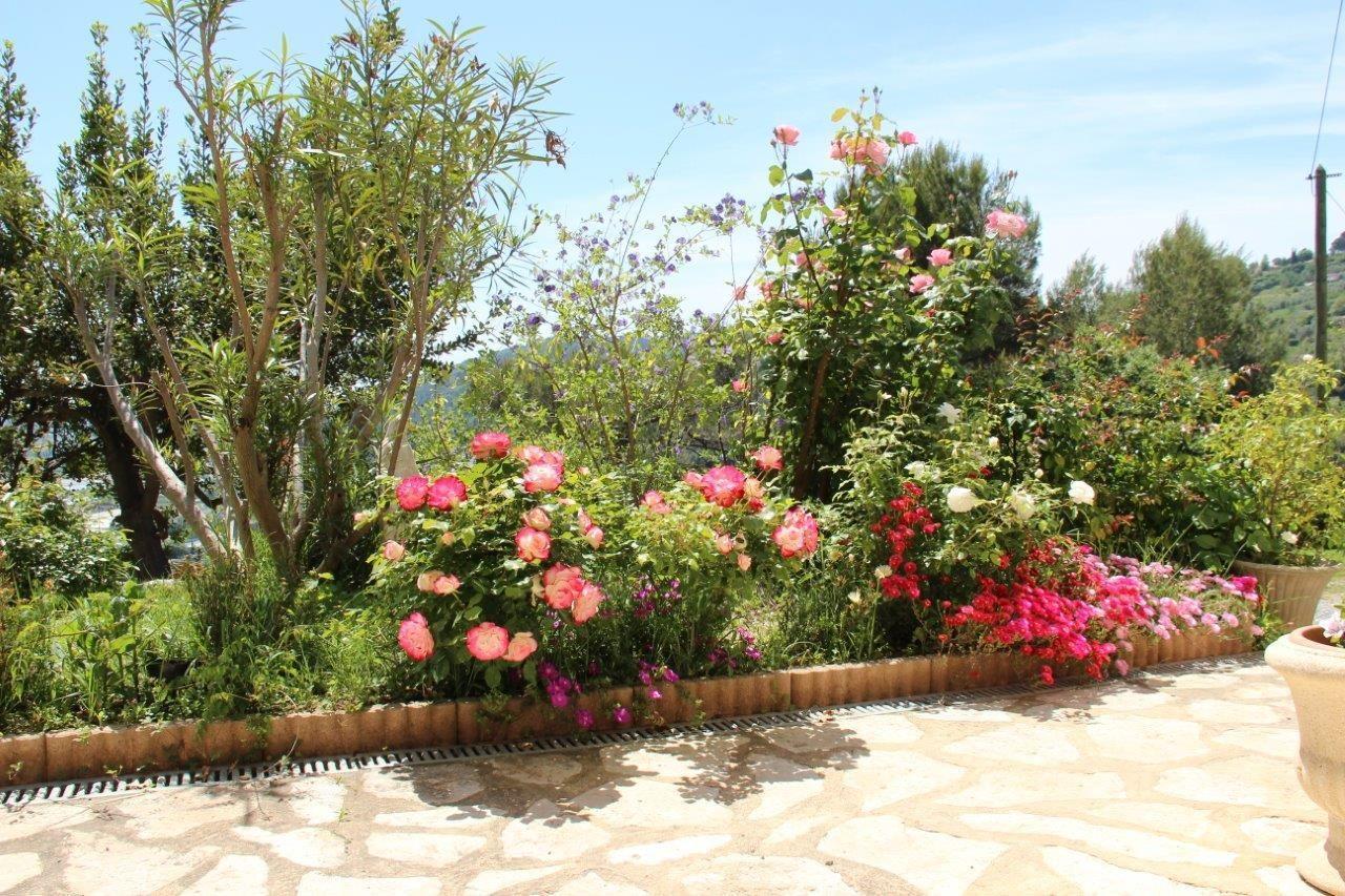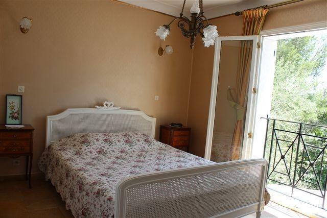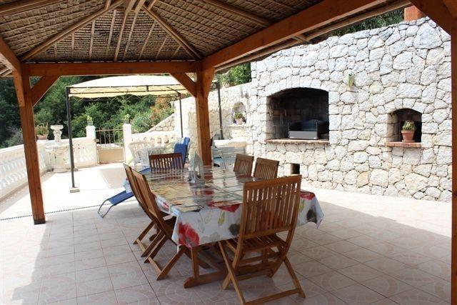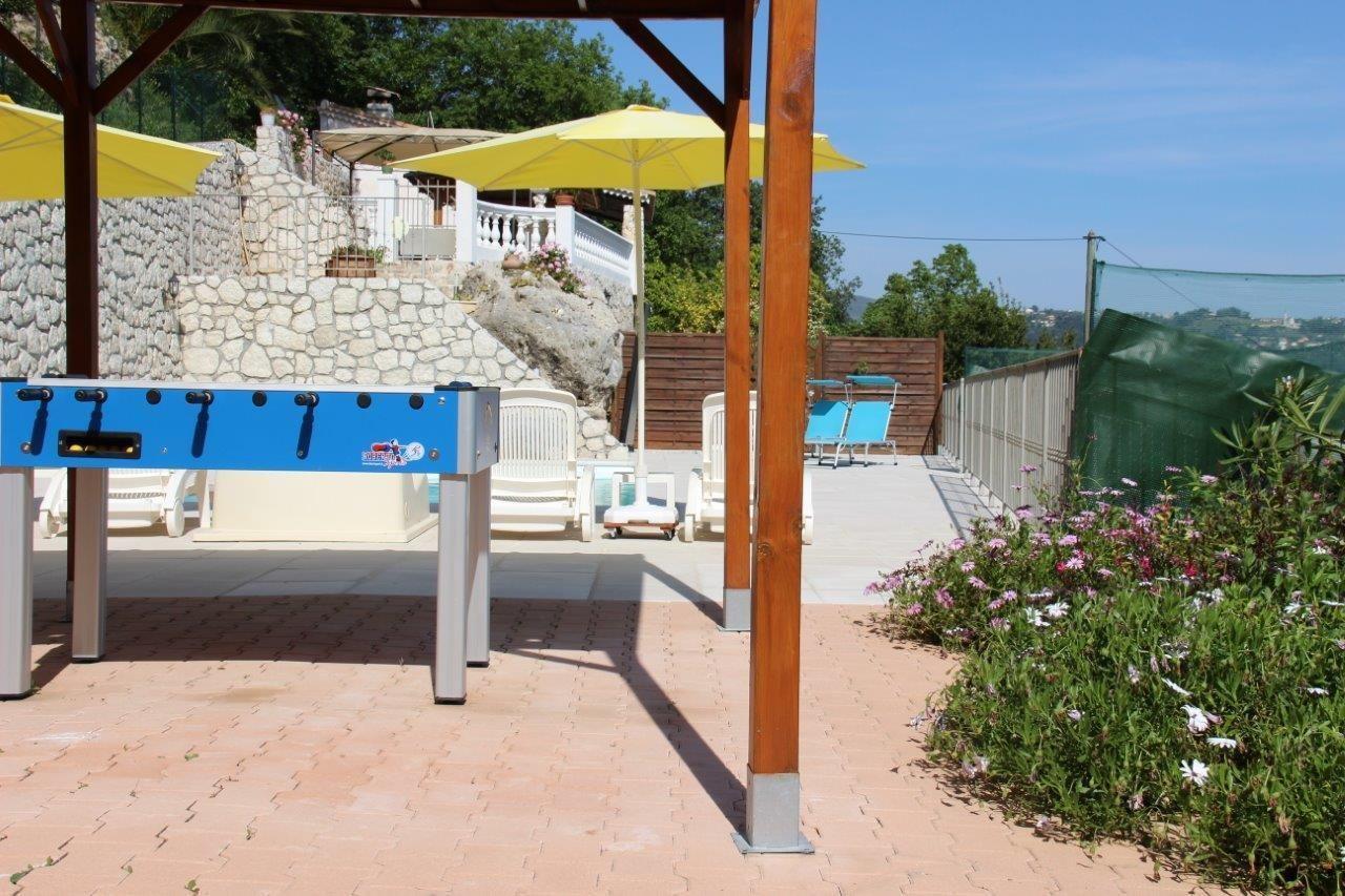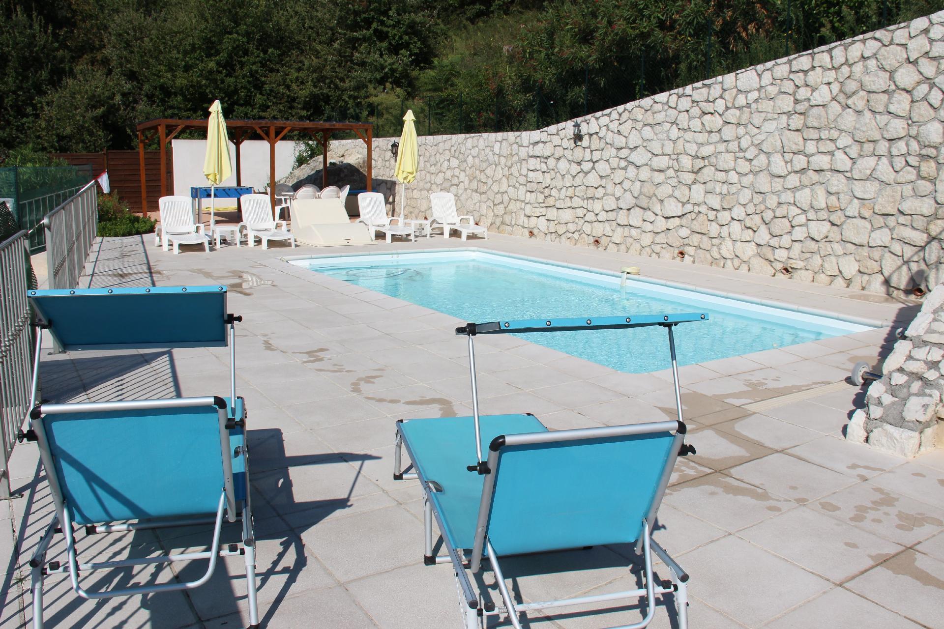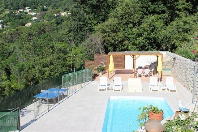 The 80 m² terrace, enclosed and protected from the sun, communicates with the living room. Here you can enjoy absolute peace and quiet. Parents can relax while the children play. The terrace has an arbour (5 x 3 m) and a pergola (3.5 x 3.5 m), a barbecue, a wall-mounted pizza oven, garden furniture, a table and chairs and sun loungers. This means you can spend plenty of time outside enjoying the barbecue, eating, relaxing and lounging. From the terrace, you can access your own private swimming pool (8 x 4 m, 1 m to 1.70 m deep), filled with chlorine-treated water and situated just below. Thanks to its sunny location, it's already a pleasant temperature early on. The 200 m² paved area around the pool is furnished with six sun loungers, two parasols and a solar shower. It enjoys all-day sunshine and magnificent sea views. Enjoy the peace and quiet as you listen to the birds and cicadas. For those who like to be a little more active, a table tennis table and table football are available. The property has an automatic entrance gate, automatic lighting and two parking spaces.
