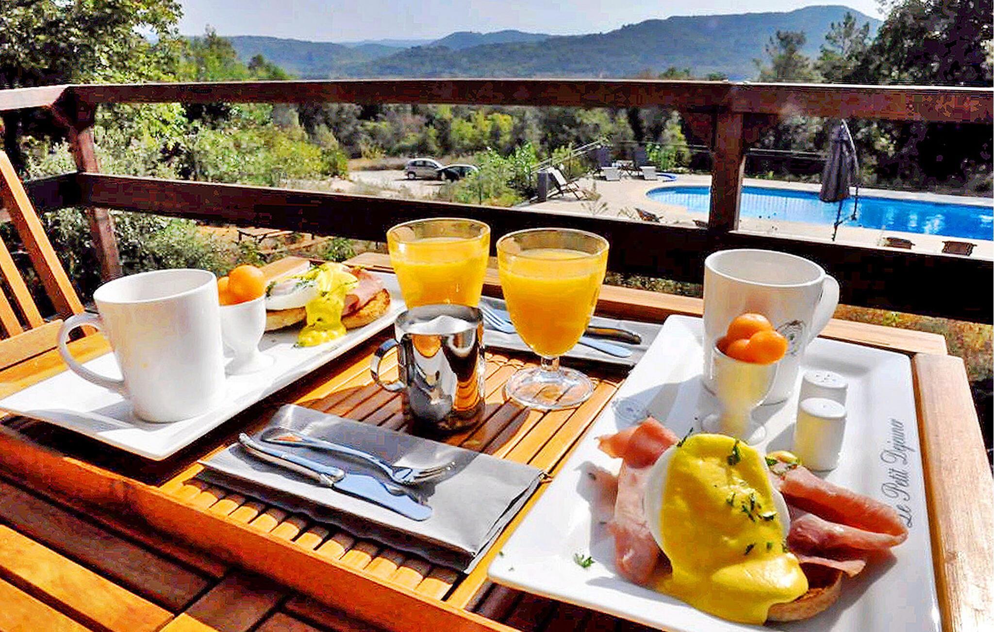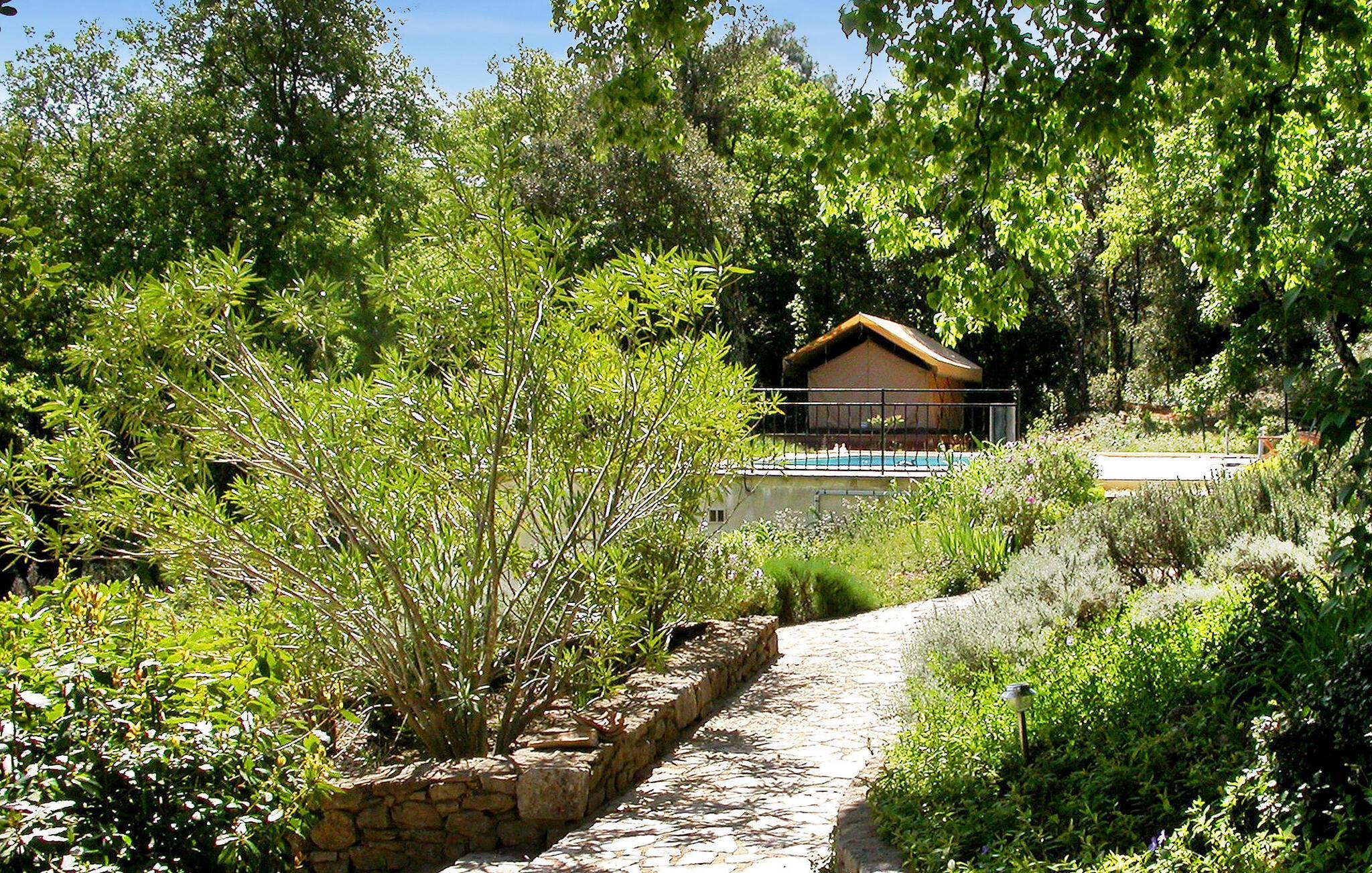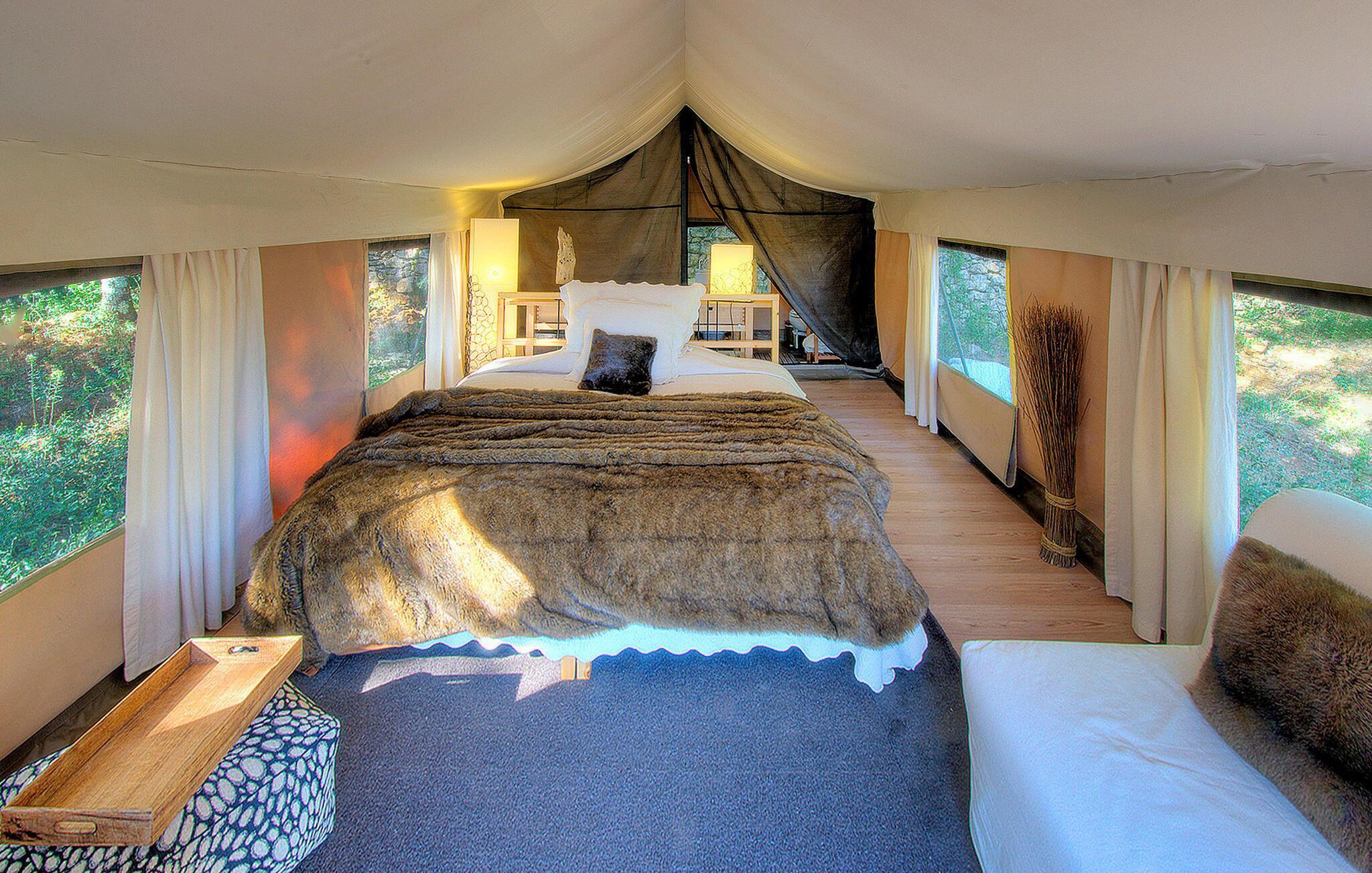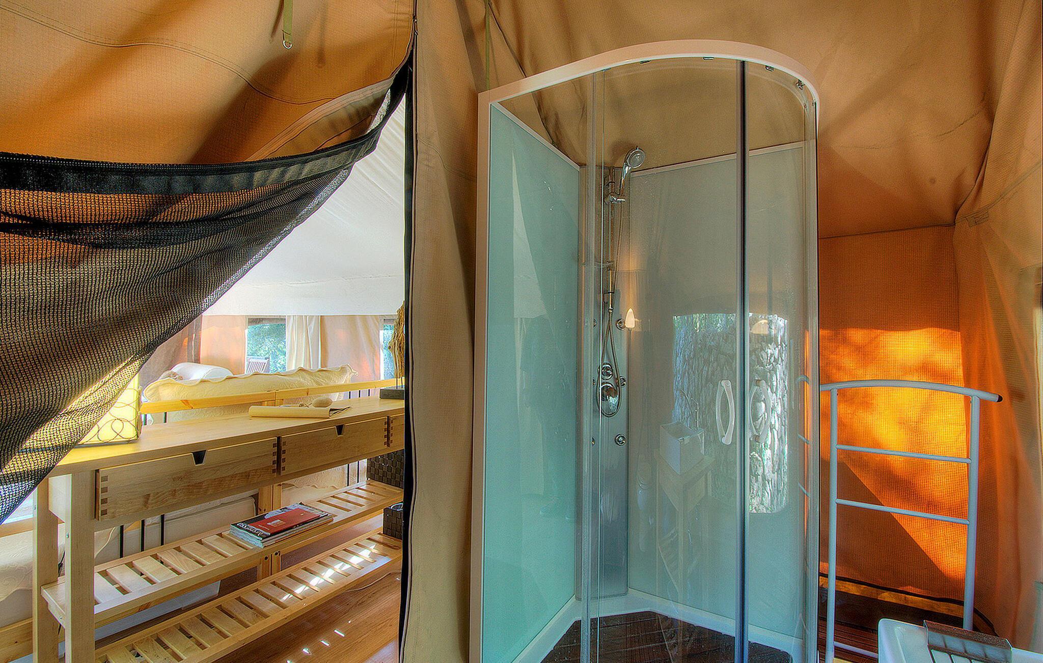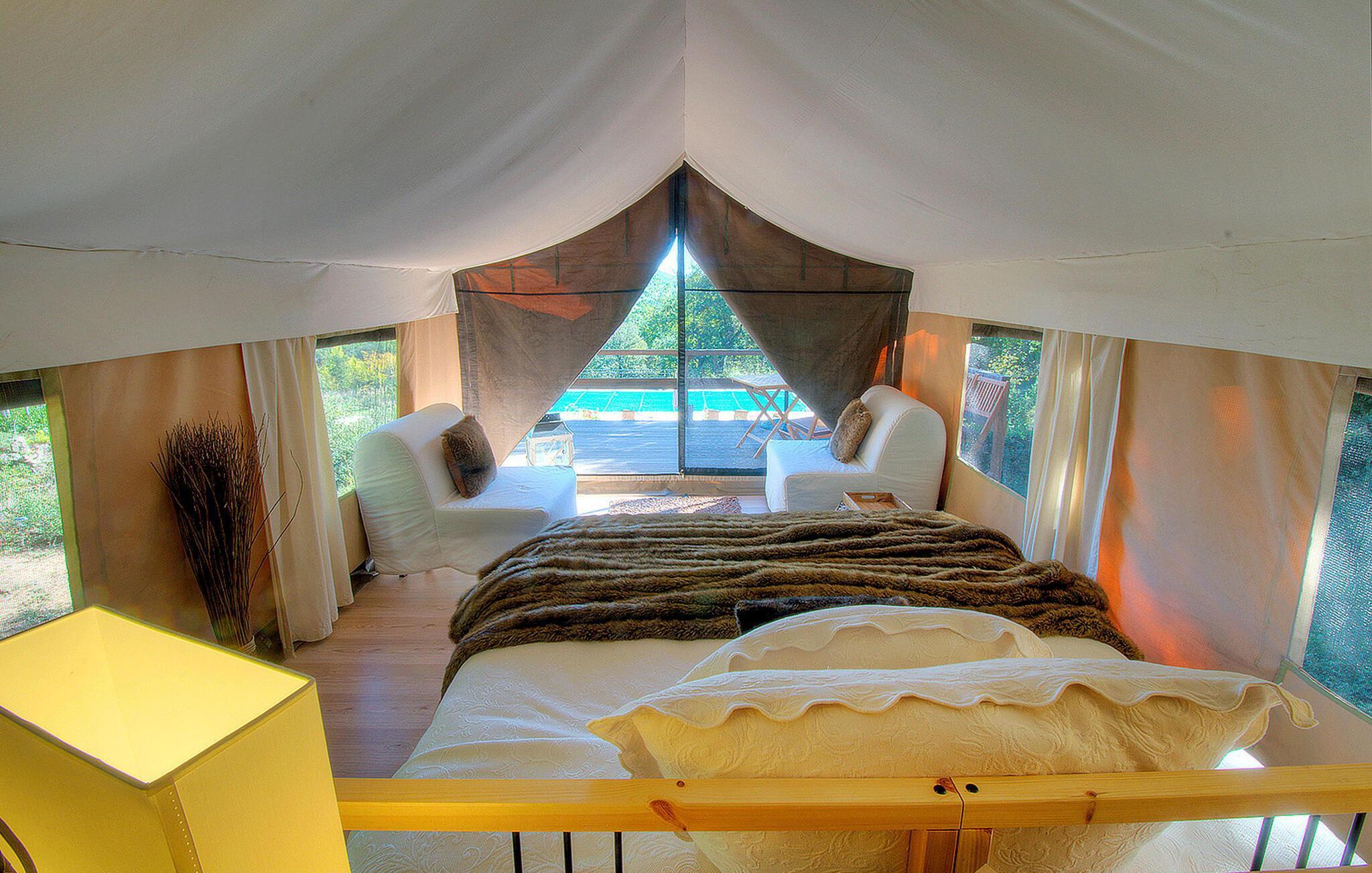 Eingebettet in ein 4,5 Hektar großes Waldgebiet in der Nähe von Goudargues verspricht dieses einzigartige Steinanwesen einen romantischen Urlaubsort. Übernachten Sie in einem luxuriösen 30 m² großen Zelt mit privater Terrasse und Zugang zu einem Gemeinschaftspool. Das Zelt verfügt über einen Schlafbereich mit einem Doppelbett (180 x 200), zwei Kinderbetten (0,90 x 190), einer Nespresso-Maschine, einem Wasserkocher und einem Weinkühlschrank. Der Badezimmerbereich umfasst eine Dusche, ein Waschbecken und ein WC. Draußen lockt eine exotische Holzplattform (50 m²) mit Gartenmöbeln. Das von Urlaubern gemeinsam genutzte Anwesen bietet einen ruhigen Rückzugsort und verfügt über einen Parkplatz für ein Auto. Ein 10 x 4,50 m großer Gemeinschaftspool mit großzügiger Terrasse und Liegestühlen lädt zum Entspannen ein. Bitte beachten Sie, dass das Kochen in den Zelten nicht gestattet ist. Der Eigentümer bietet ein kostenloses Frühstück und optional Abendessen an. Der Table d'hôtes kostet zweimal pro Woche 29,50 Euro pro Person. An anderen Abenden ist ein luxuriöser Speiseservice in Ihrem Zelt für 39,50 Euro pro Person verfügbar.