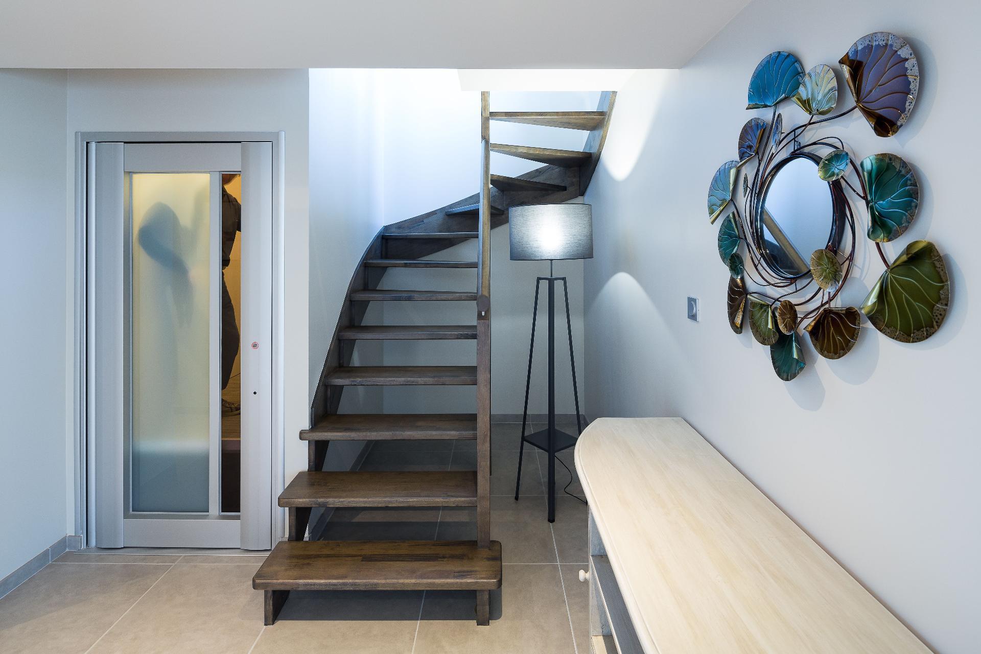 The lift then takes you to the second floor - again with a wonderful view of the sea - a small seating area allows you to read a book in peace and quiet away from the living room below. The two bedrooms on the second floor are also spacious with a TV cabinet and a small office area. The WC is separate here and so is the bathroom - there is even a nice bathtub to relax in - the shower is integrated there - there is a glazed shower. If you love a great view on holiday and also want a little luxury and lots of space, Villa Tante Alice is the right place for you - you rarely have almost 180 square metres of holiday home available for six holiday guests - you will love the villa - that's a promise!