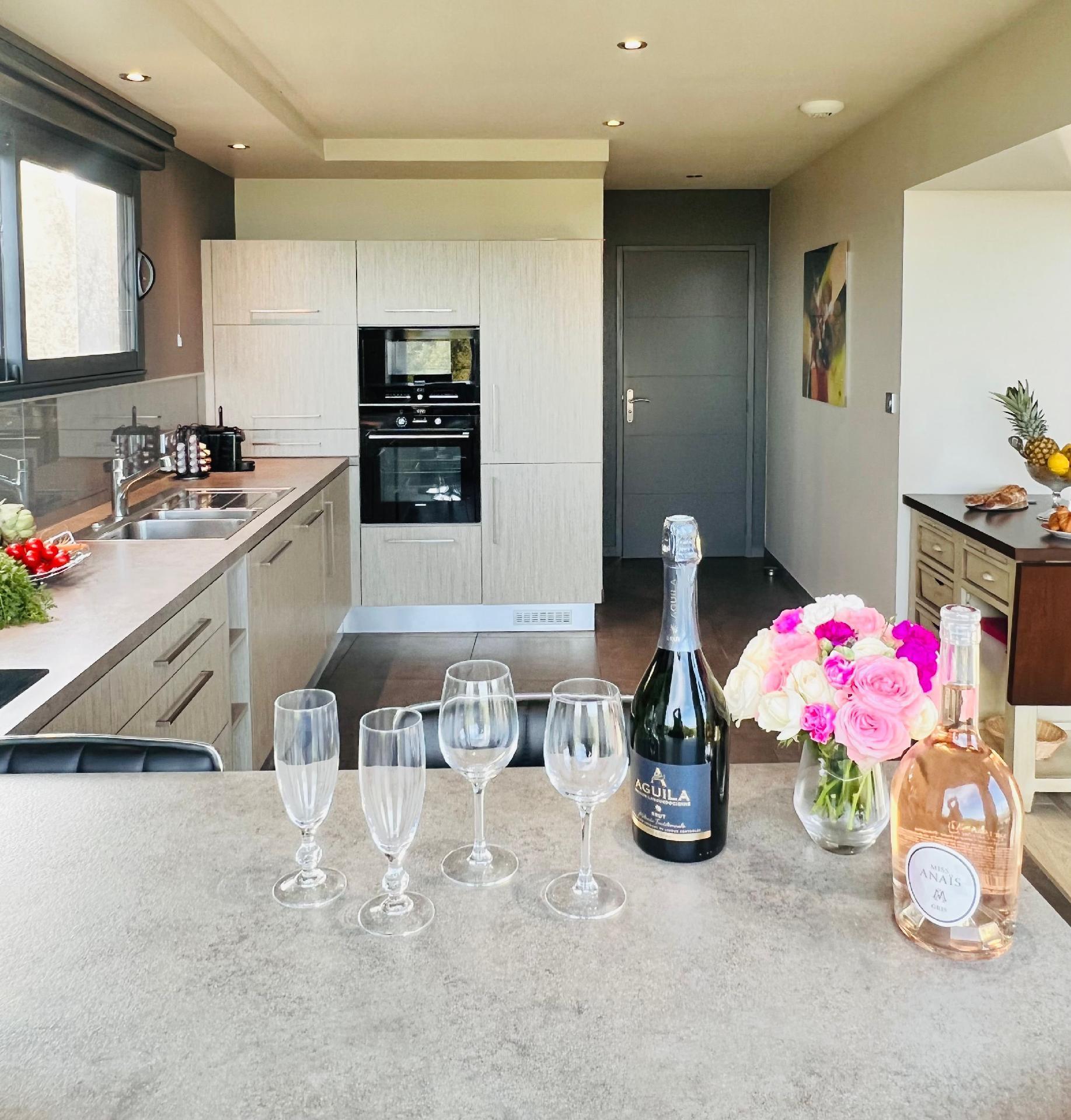 After you have arrived and parked your car in front of the house in the private car park. Enter into a beautiful entrance area with a large cloakroom - through the glass front you can see your Jacuzzi and steam bath in the SPA area flashing. Continue either by stairs; or comfortably - by lift; to the living area on the first floor. The sea view from here is simply marvellous - no matter where you are in the living room / or the kitchen - the sea is at your feet! Incidentally, the most beautiful fine sandy beach (and the dunes of Keremma) is not far from the house. The living area is very open and spacious - a large well-equipped kitchen (of course, as already mentioned, with the great sea view) - is connected to the dining area / dining table for 6 people and the living room area with sofas. And opposite the sea view is a large garden (fully fenced) - and if you open the large sliding glass doors you are in front of your sun loungers, the garden furniture (incl. garden table) and your "Weber" barbecue. Facing the sea again, there is also a small sea view bar in the kitchen next to the dining table with its own sea view terrace access. The large master bedroom with its own garden access and en-suite bathroom (shower) is also located on this floor. Each bedroom has a small office corner (or practical as a make-up corner) its own TV - with international satellite programmes - the wardrobe should not be missing, this master bedroom has its own bathroom with shower and private toilet. On the first floor there is also a spacious guest WC (wheelchair accessible).