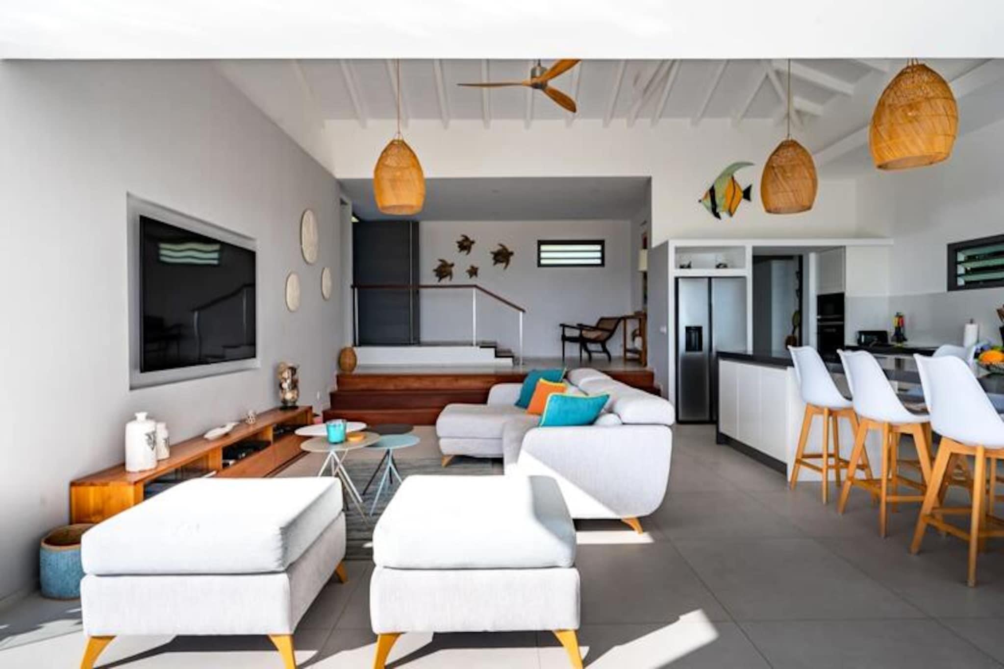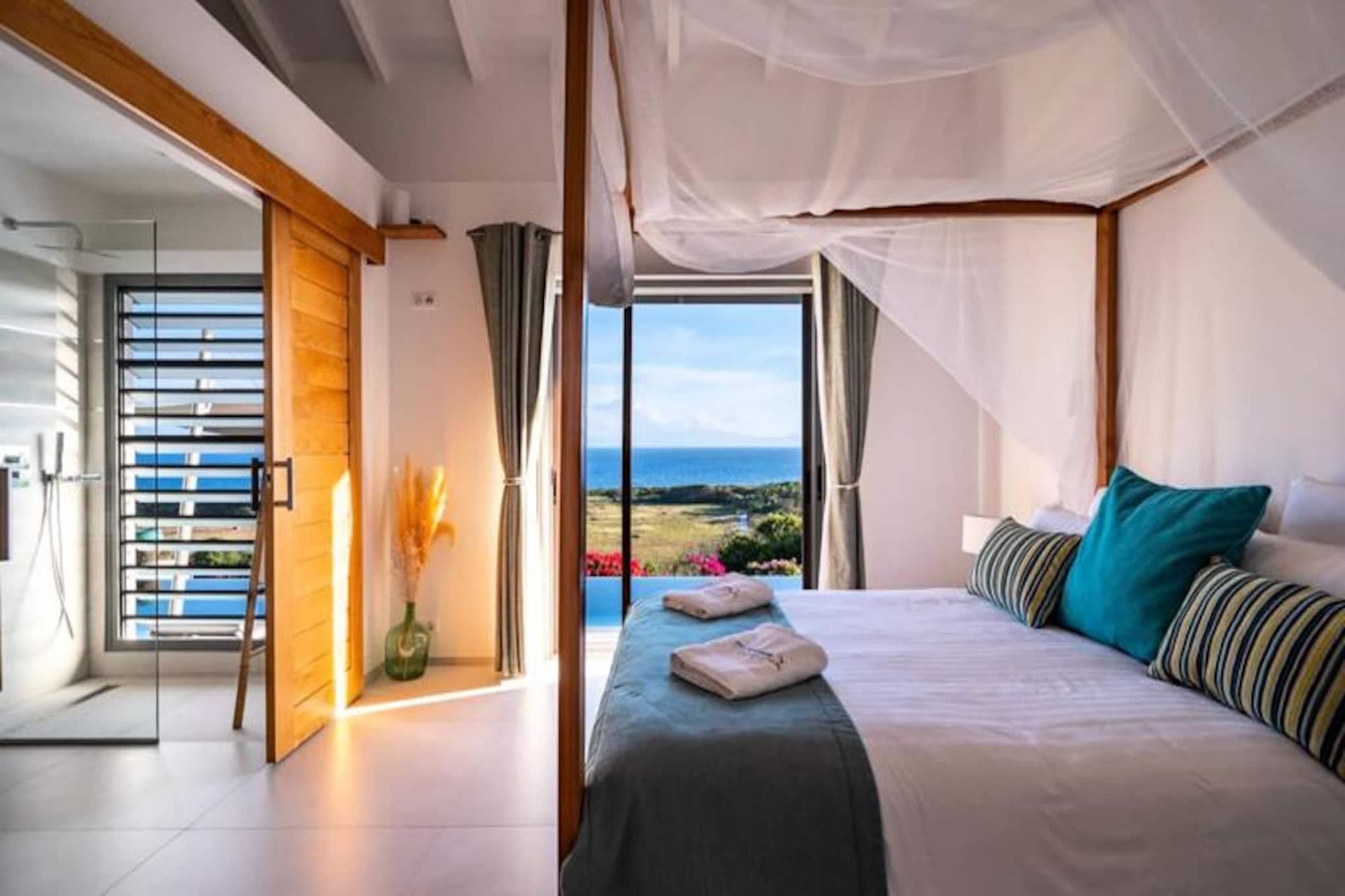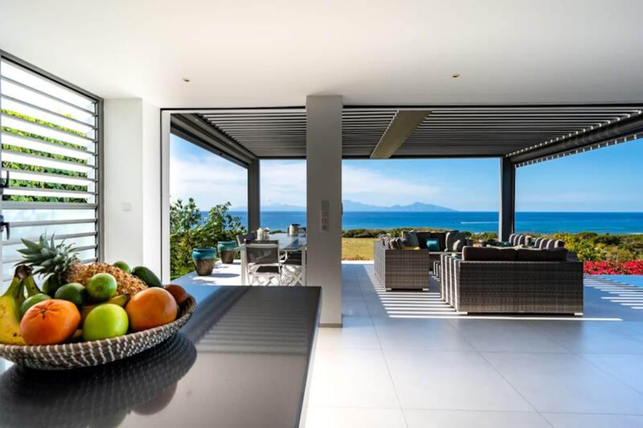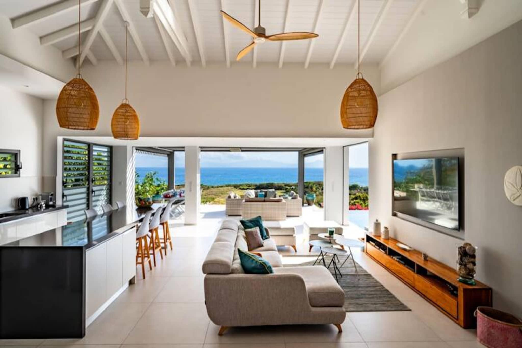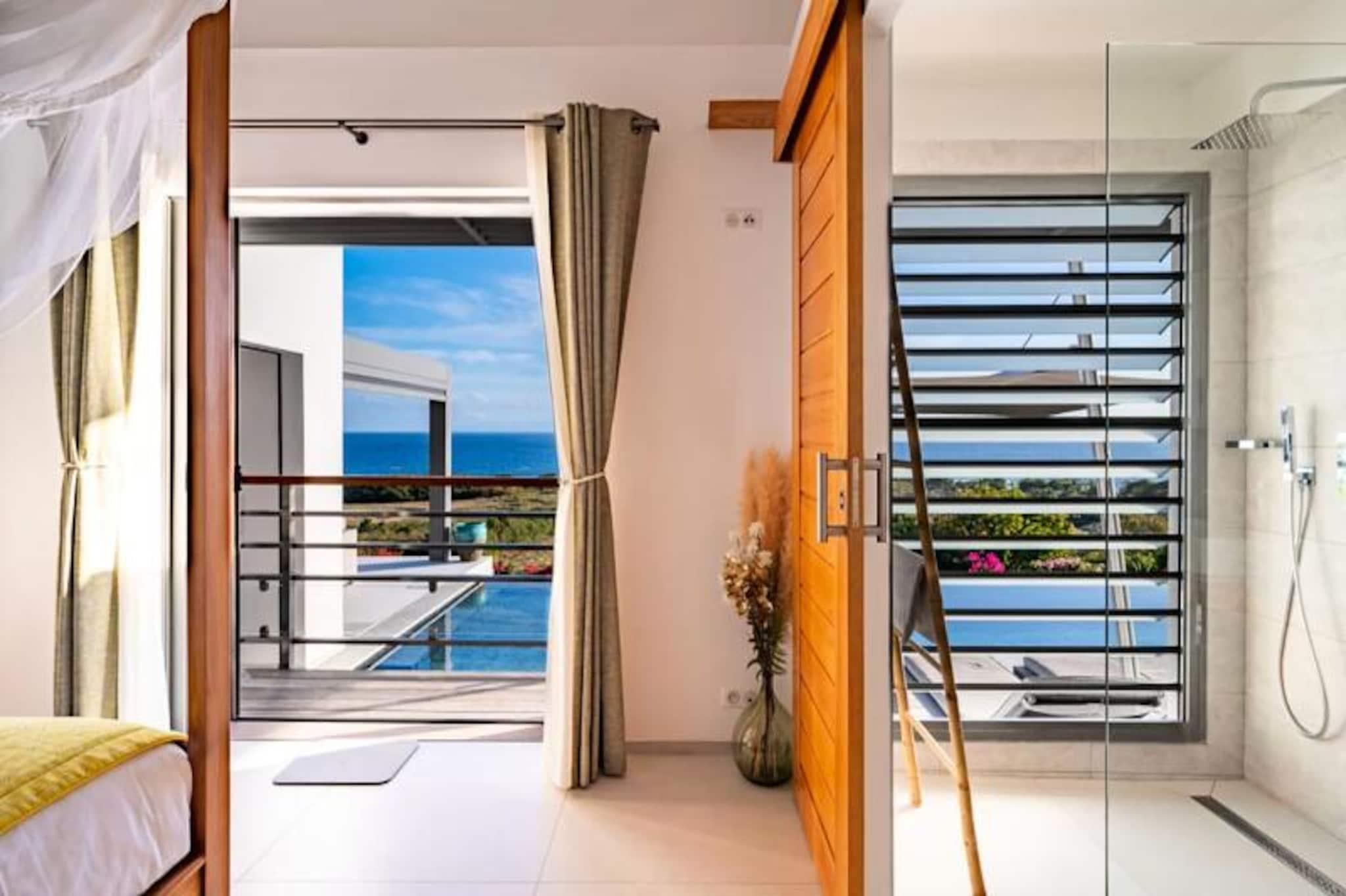 Perched on the serene heights of Les Basses, Villa Belle Galante is a sanctuary of modern luxury and Caribbean charm. With its breathtaking panoramic views of the turquoise sea and an infinity pool that seems to merge with the horizon, this villa invites you to unwind in absolute tranquility. The gentle trade winds and lush surroundings create a perfect backdrop for your dream getaway. This contemporary villa spans an impressive 246 m² and accommodates up to 11 guests across five beautifully designed bedrooms, each with its own en-suite bathroom featuring walk-in showers. Four of the bedrooms are equipped with 160 cm beds, while the fifth offers a 140 cm bed and an additional 90 cm bed, making it ideal for families or groups of friends. The fully equipped kitchen, with its central island, flows seamlessly into the dining area on the covered terrace, where up to twelve guests can enjoy meals while gazing at the Caribbean Sea. The villa’s wooden furnishings and modern architecture add a touch of elegance to its inviting ambiance. Located just five minutes from the charming town of Grand-Bourg, the villa offers easy access to supermarkets, vibrant markets, and delightful Creole restaurants. The nearby beaches of Anse Canot and La Feuillère are must-visits, whether you’re looking to swim in crystal-clear waters or try your hand at kitesurfing. For those seeking adventure, explore local rum distilleries, hike through sugarcane fields, or attend beach concerts under the stars. With its blend of comfort, style, and proximity to the best of Marie-Galante, Villa Belle Galante promises an unforgettable Caribbean escape. Whether you’re lounging by the infinity pool, savoring sunsets on the terrace, or discovering the island’s treasures, this villa is your gateway to paradise.