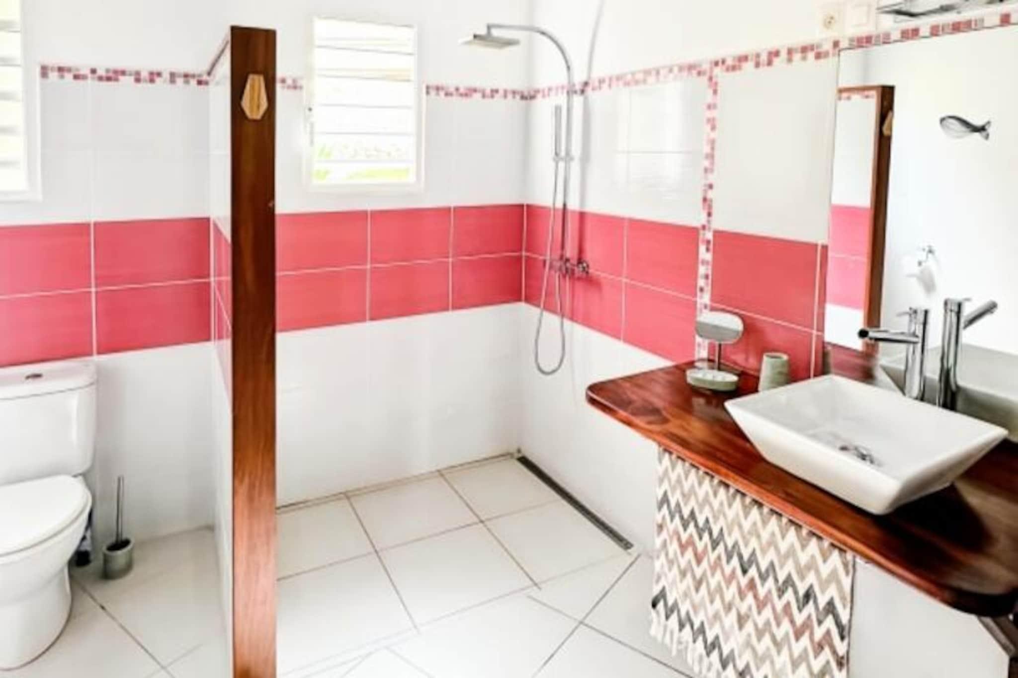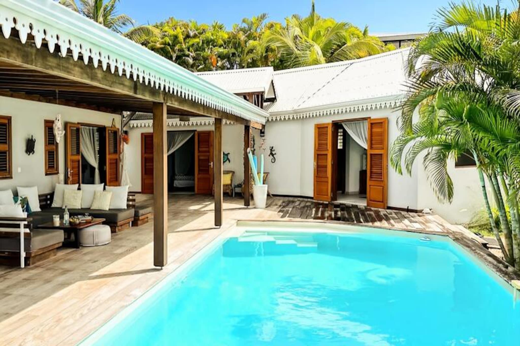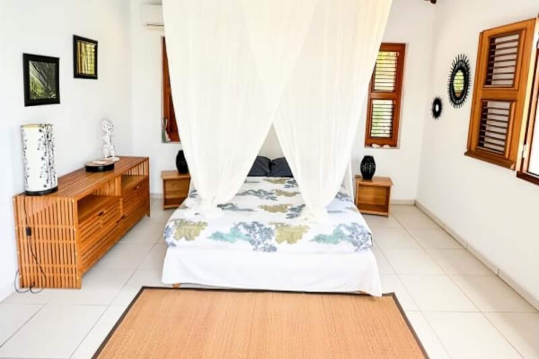 Imagine waking up to the gentle sound of waves and the sight of turquoise waters stretching to the horizon. This stunning villa in Grand-Bourg, Marie-Galante, offers a serene escape in the heart of the Caribbean. Surrounded by a lush 2000m² tropical garden, it’s a haven of tranquility where you can unwind and reconnect with nature. The villa’s elevated position provides breathtaking views of the sea and the surrounding islands of the archipelago, creating a picture-perfect backdrop for your holiday. Designed to accommodate up to six guests, the villa boasts three air-conditioned bedrooms, each featuring a 160cm double bed, mosquito nets, and a private bathroom with a walk-in shower. The spacious living areas include a fully equipped kitchen that opens onto a bright and airy living room and a gallery with an outdoor dining area. Whether you’re preparing a meal, lounging by the pool, or enjoying a barbecue evening, every corner of this villa is designed for comfort and relaxation. Additional amenities include a laundry area, an outdoor shower, and a hammock for those lazy afternoons. Located just 15 minutes from the charming town of Grand-Bourg, you’ll have easy access to local markets, Creole restaurants, and essential amenities. Explore the pristine beaches of La Feuillère and Anse Canot, perfect for swimming and sunbathing, or venture into the island’s sugarcane fields and hiking trails for a taste of its natural beauty. Whether you’re sipping a ti punch by the pool or gazing at the sunset from the deckchairs, this villa promises an unforgettable stay under the warm Guadeloupe sun. Let the soothing Caribbean breeze and the charm of Marie-Galante make your holiday truly special.