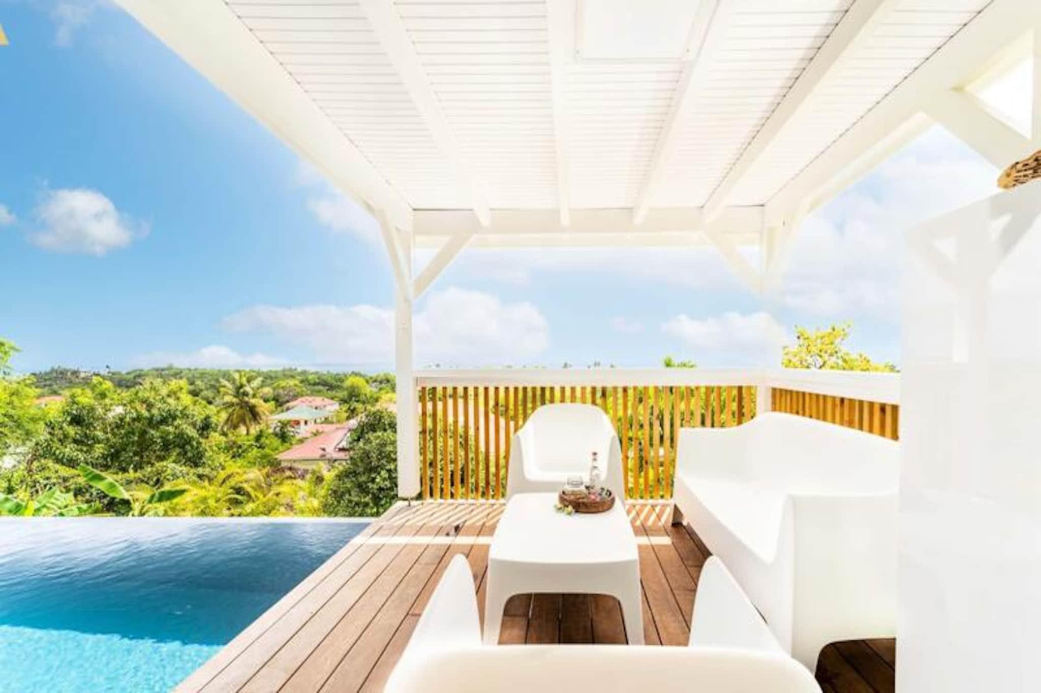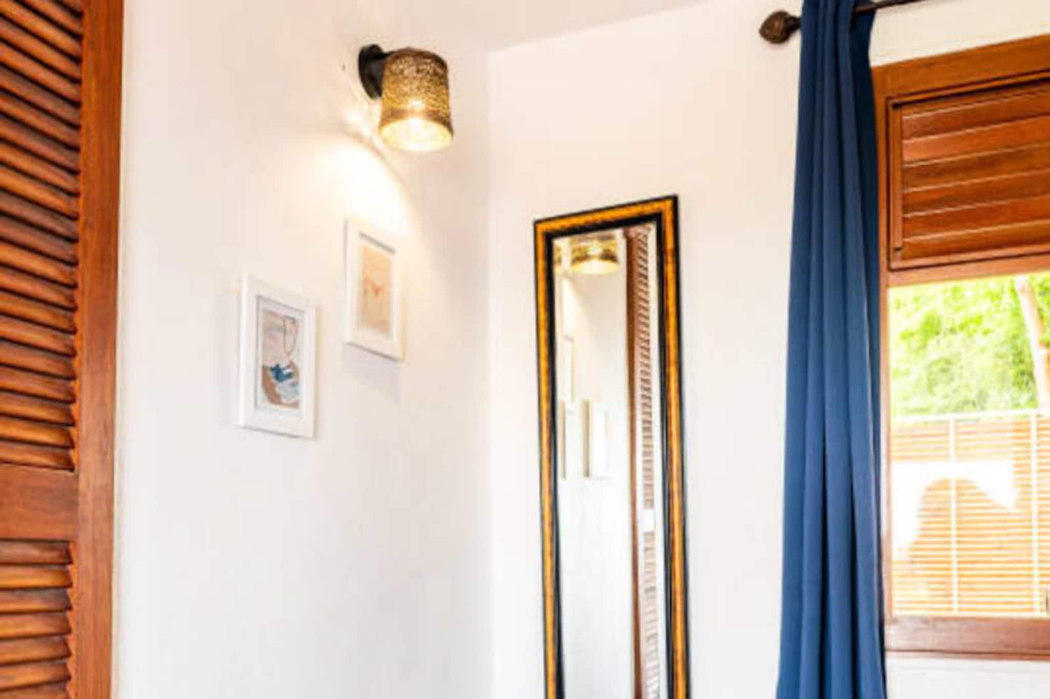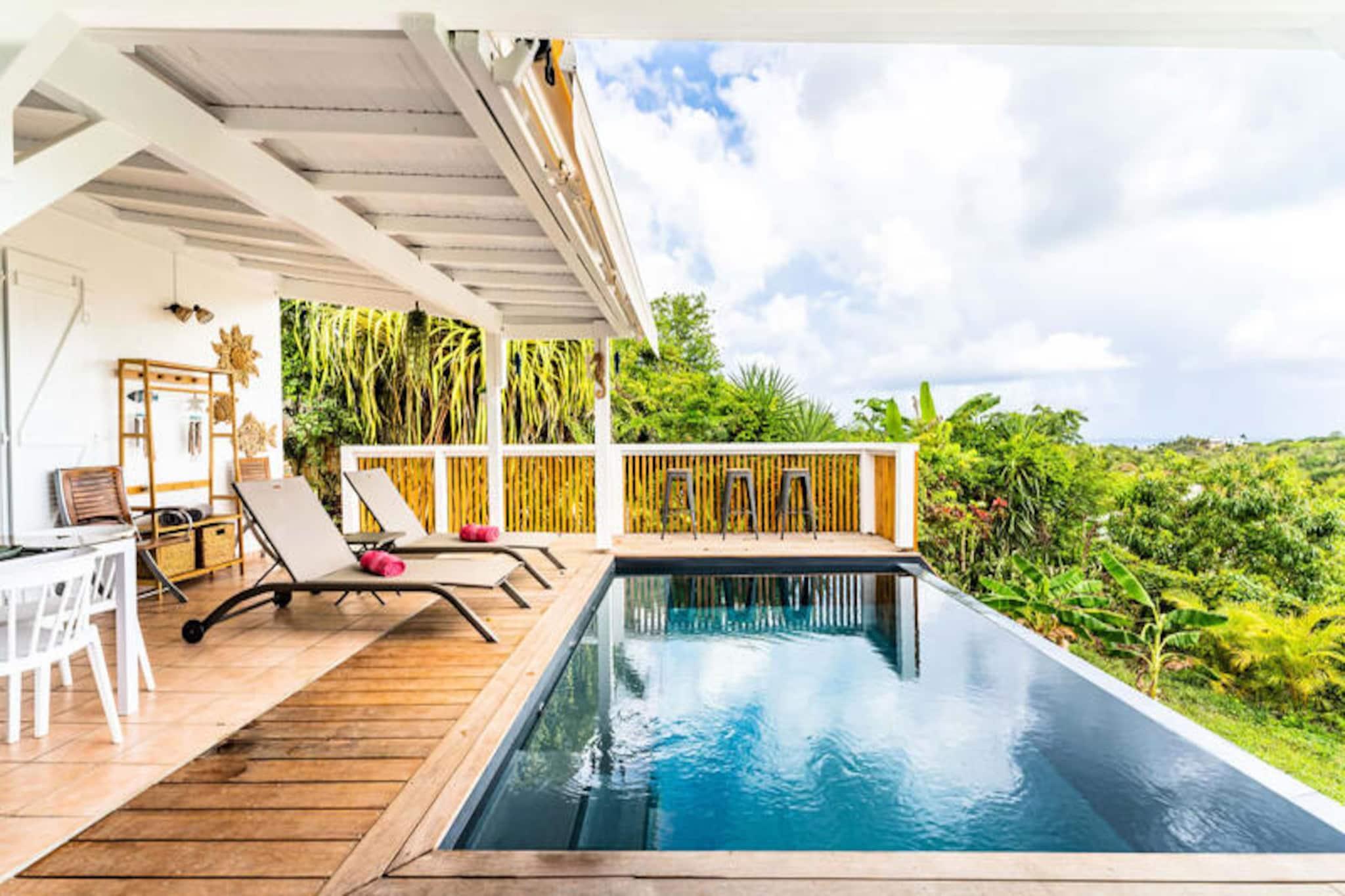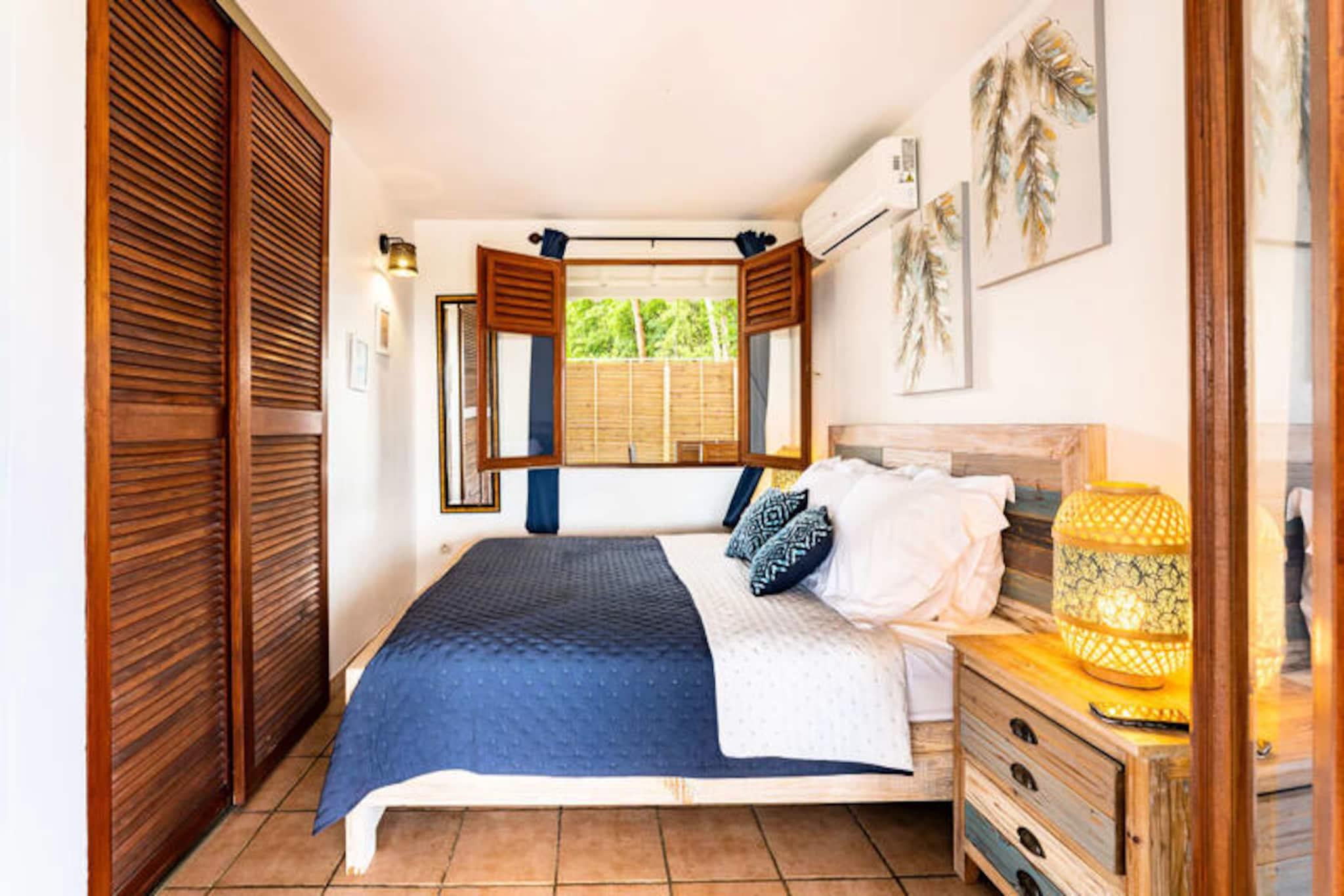 On the serene island of Marie-Galante, where time seems to slow down, Ti Moca villa offers a tranquil escape with breathtaking views of Les Saintes, Dominica, and Guadeloupe. This elegant retreat invites you to unwind amidst lush surroundings, with the gentle Caribbean breeze and the sound of waves setting the tone for your stay. Whether you're sipping a morning coffee on the terrace or watching the sun dip below the horizon, every moment here feels like a postcard come to life. Designed to accommodate up to six guests, Ti Moca features three air-conditioned bedrooms, including a charming upstairs room, and two well-appointed bathrooms. The villa's outdoor kitchen is a delightful space to prepare meals, while the dining area is perfect for sharing laughter and local delicacies with loved ones. The private swimming pool offers a refreshing oasis, and pool towels are thoughtfully provided for your convenience. Every detail, from the villa's airy layout to its hotel-quality linens, has been curated to ensure maximum comfort. Located in Grand-Bourg, Ti Moca is just a short drive from the island's most stunning beaches, including La Feuillère and Anse Canot, where turquoise waters and soft sands await. The nearby village offers all essential amenities, from supermarkets to Creole restaurants and vibrant local markets. For nature enthusiasts, the island's hiking trails and sugarcane fields provide a glimpse into its authentic charm and natural beauty. Whether you're seeking relaxation, adventure, or a mix of both, Ti Moca is the perfect base for creating unforgettable memories under the Caribbean sun. Pair it with the neighboring Villa Moca for larger groups, and let the island's magic unfold around you.