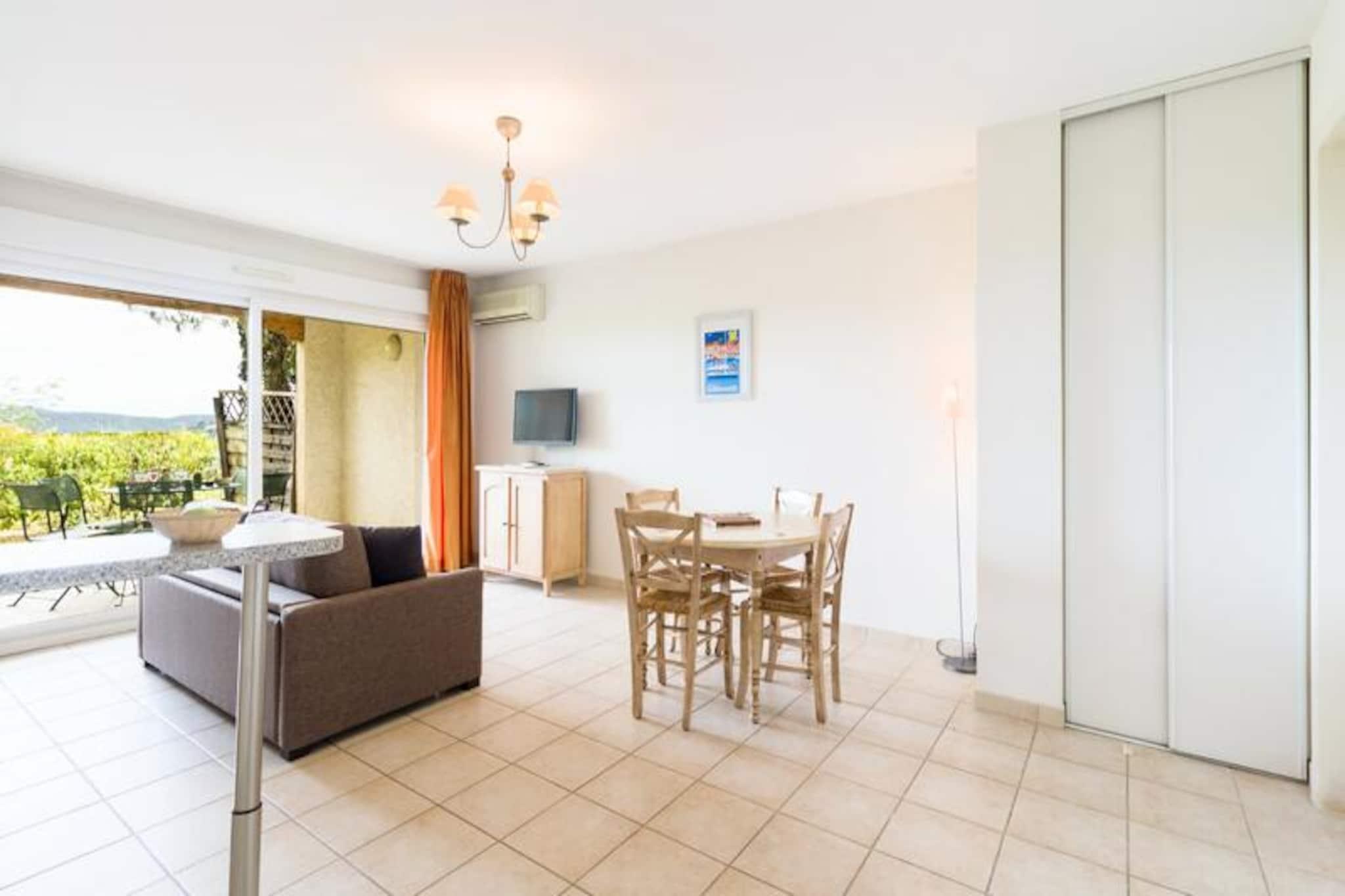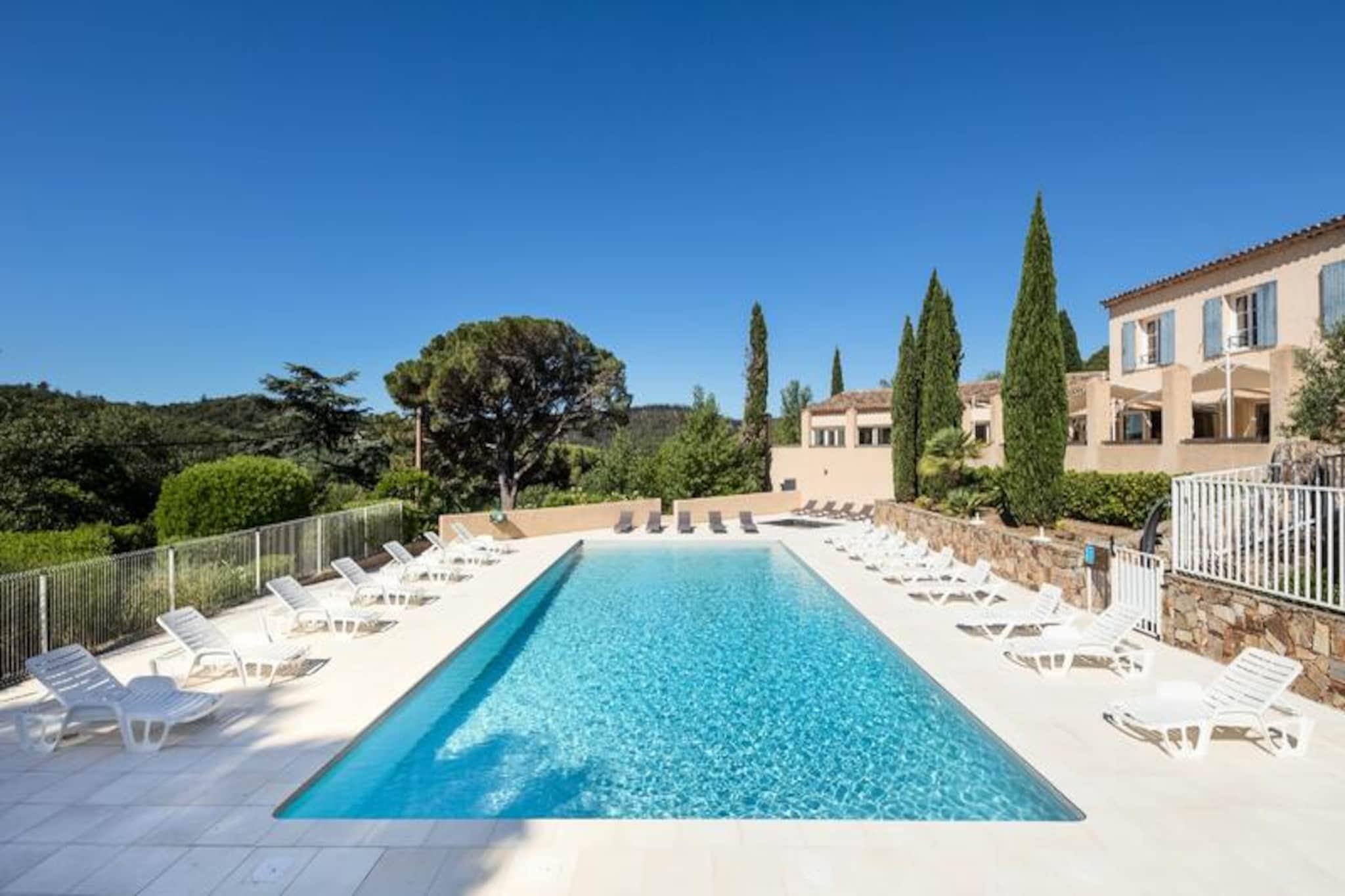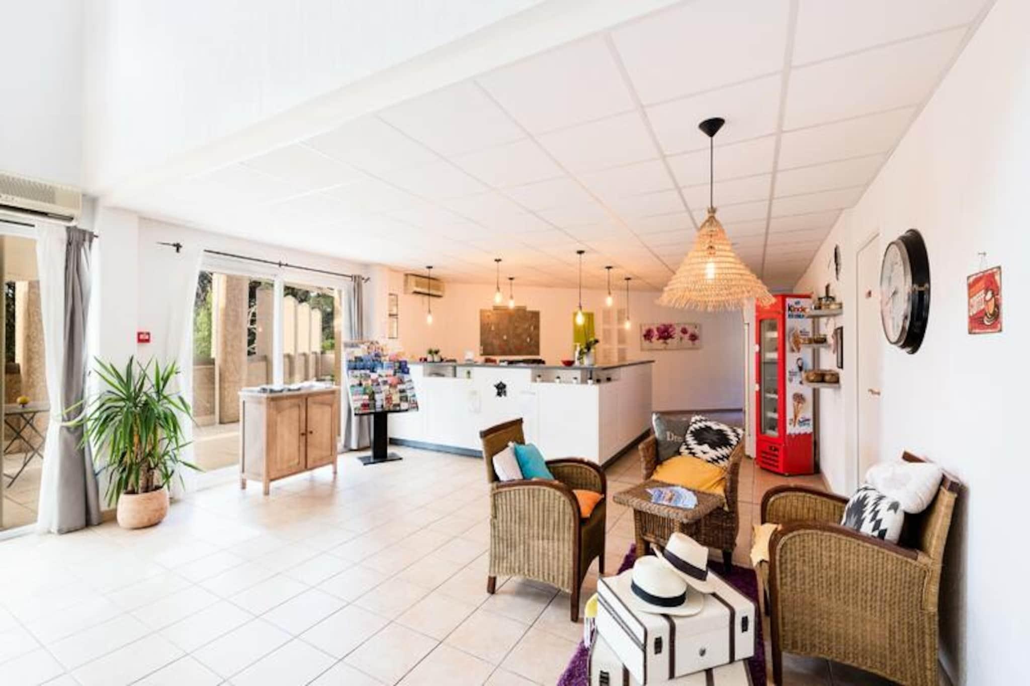Set in a peaceful location, this residence offers spacious apartments ideal for families or small groups, with a capacity for up to 6 people. The accommodations include a living room with a trundle bed for 2, a bedroom with a double bed, and another with 2 single or bunk beds. Pets are allowed for an extra fee, and each apartment features a private terrace with beautiful views. WiFi, bed linen, and bathroom linen are included, while final cleaning is covered (excluding kitchen area and dishes). The residence is located just 1km from the charming village of Grimaud, one of the oldest towns in the Massif des Maures, and offers easy access to the stunning beaches of the Gulf, approximately 7km away. Nearby, you can explore the cultural and historical sites like the feudal castle, or enjoy outdoor activities such as water sports. The town’s lively atmosphere, with a wide selection of cafes and markets, ensures you will have plenty to explore. Each apartment features a fully equipped kitchenette with everything you need for self-catering, including a refrigerator and stovetop. Additional amenities include a bathroom with a shower, a baby kit (upon request), and free parking. During the summer season, guests can enjoy the outdoor swimming pool, and a buffet breakfast is available to start the day.