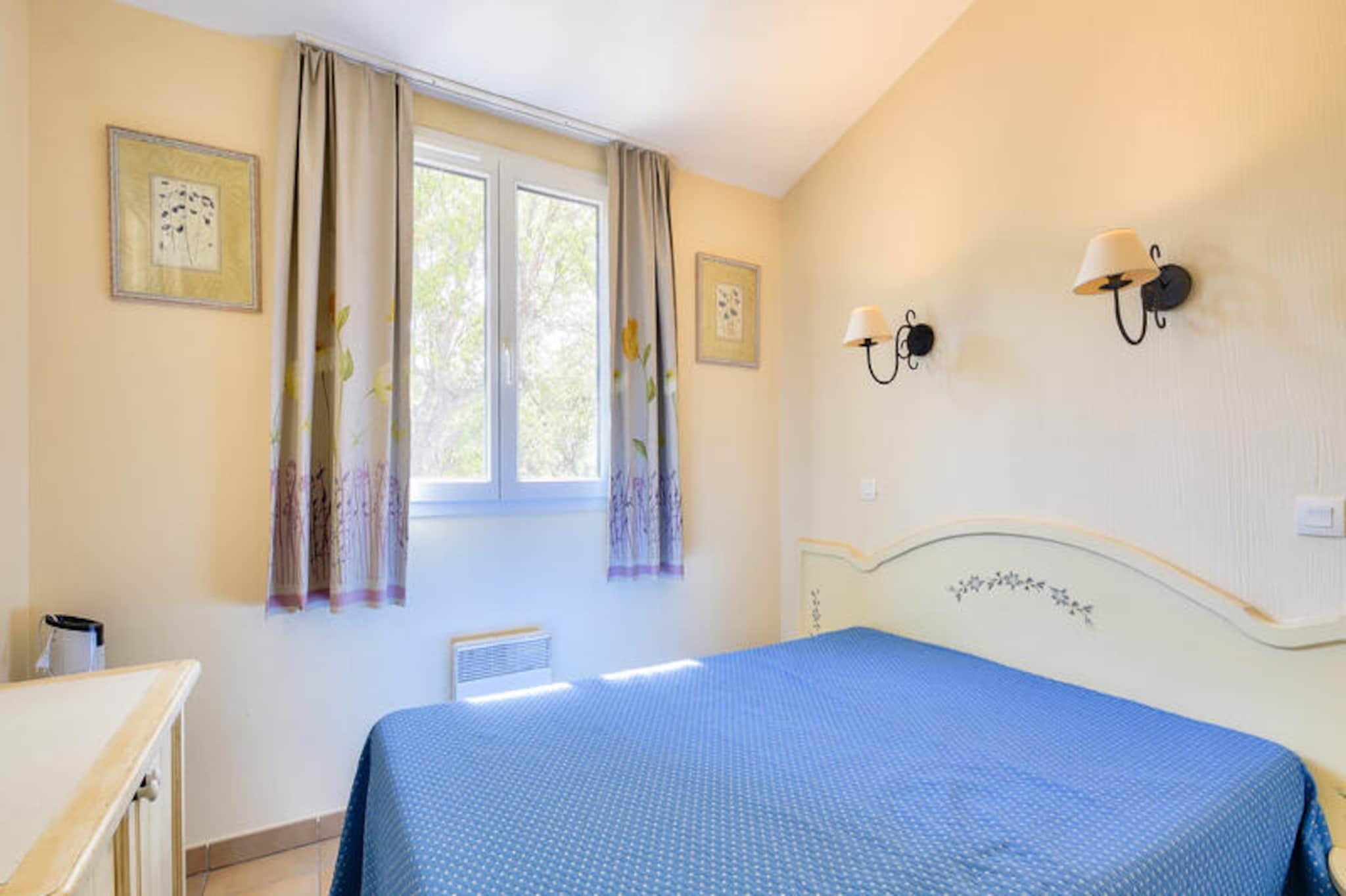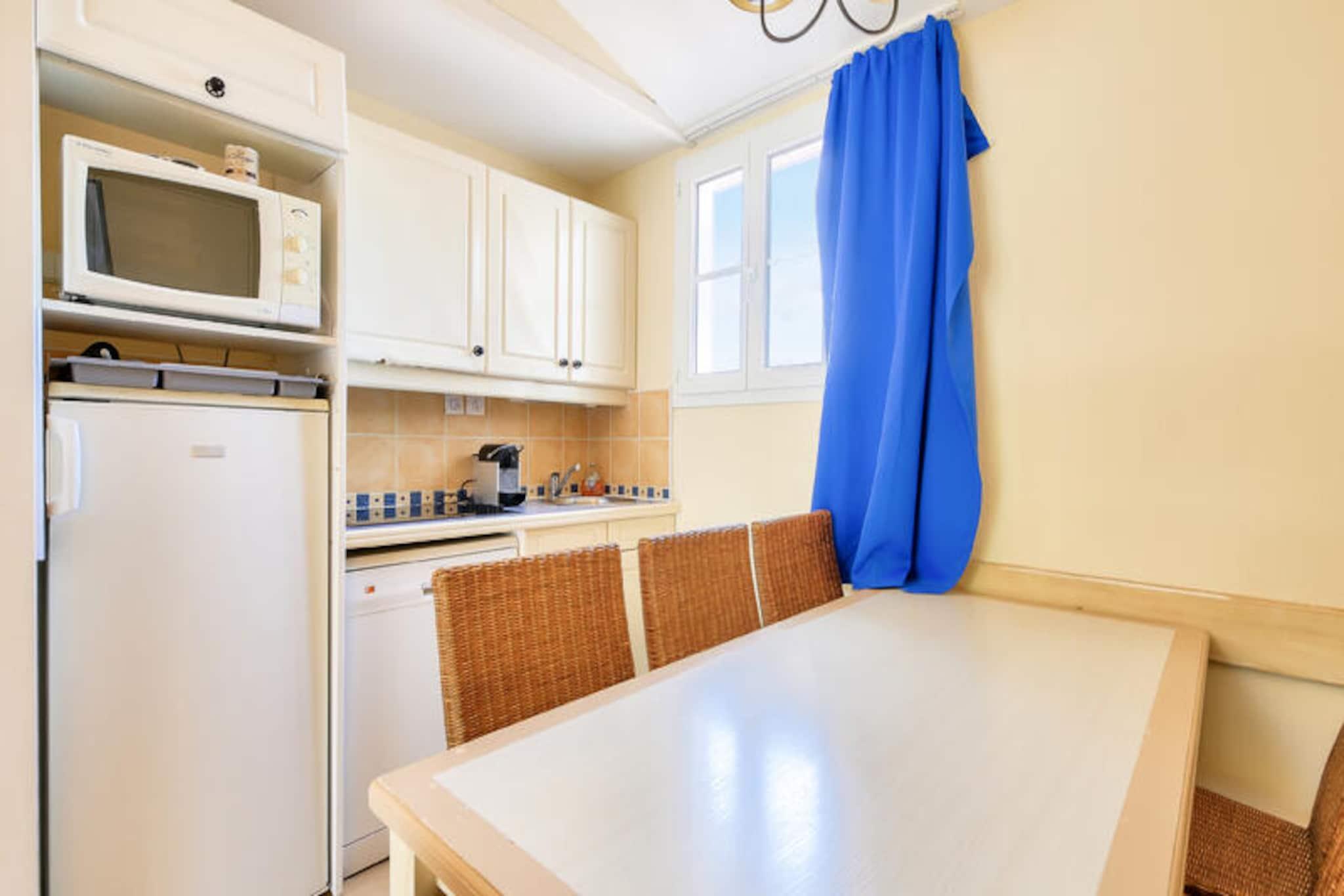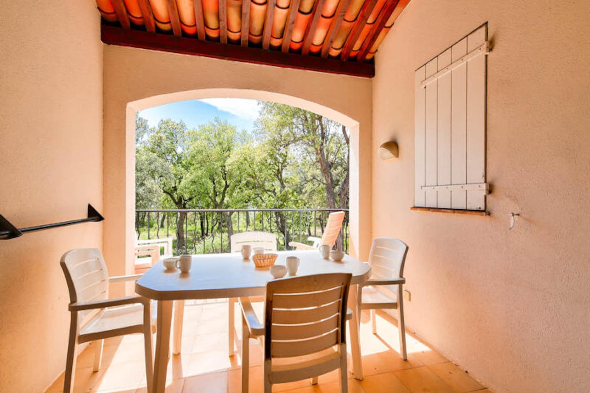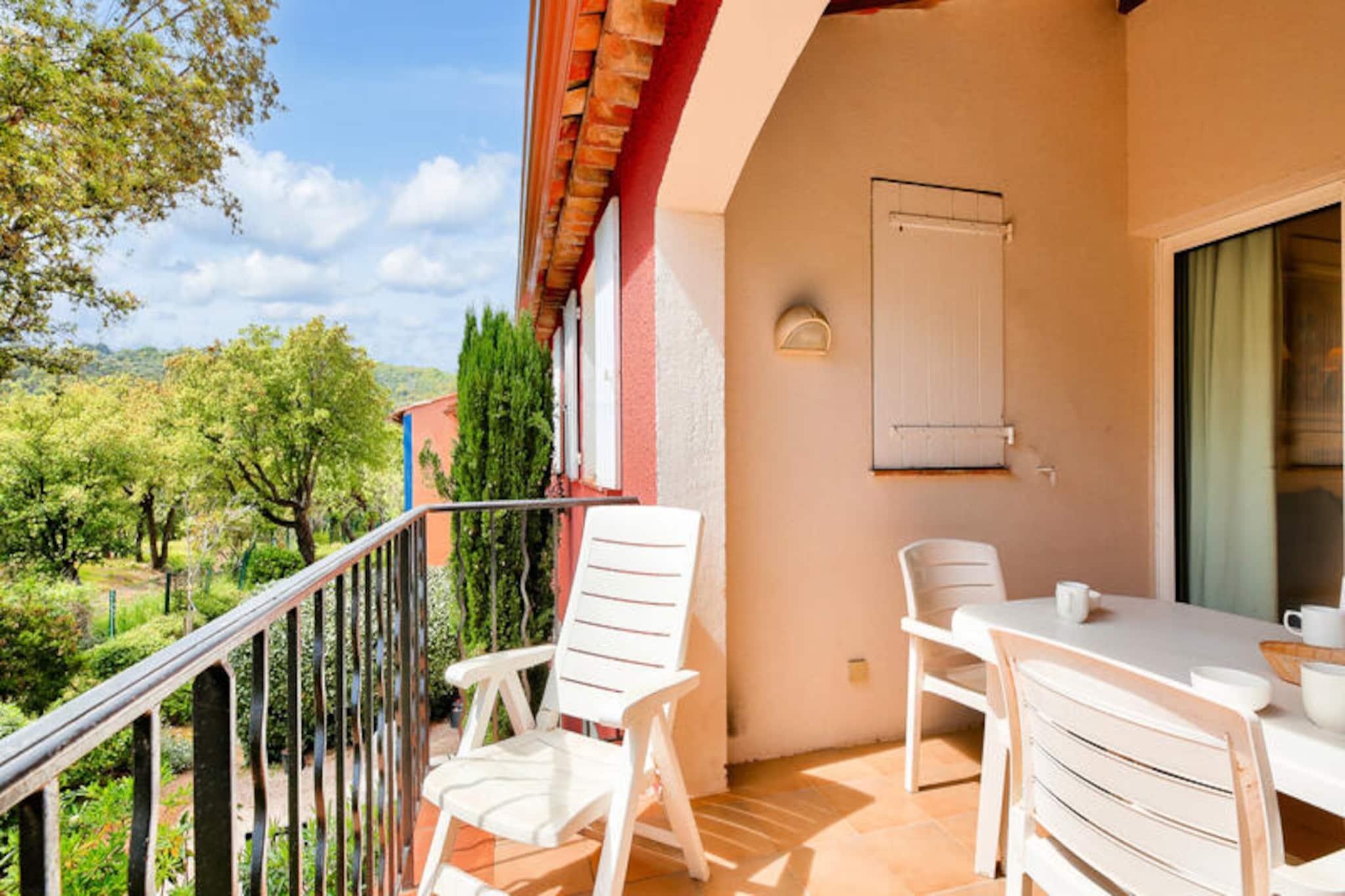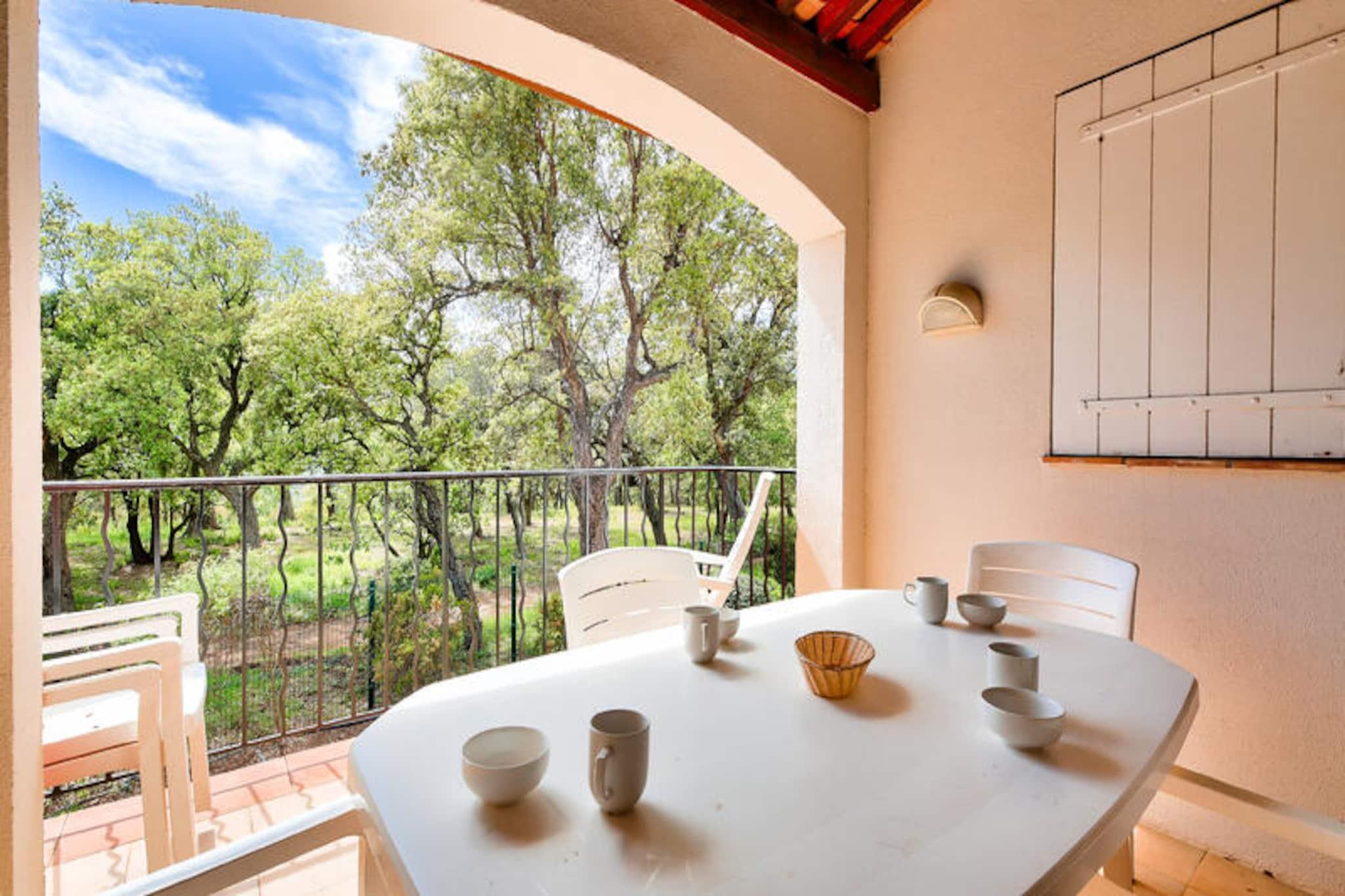 This 35m² apartment accommodates up to 4 people and is located on the 2nd floor, offering a cozy living space with a sofa bed and trundle bed in the living room. The bedroom features a double bed, while the cabin area is equipped with bunk beds, perfect for a family or small group. The property is pet-friendly, allowing your furry companions to join the vacation. For added comfort, the apartment includes a balcony with views of the forest, a bathroom with a bathtub, and an electric towel dryer. The residence is conveniently located near local attractions, with shops and activities just 100-500 meters away. A 3 km distance brings you to the sandy beach, perfect for enjoying the Mediterranean sun. Nearby, explore the Provençal village of Grimaud, or take a stroll through the famous city of Saint-Tropez. For outdoor enthusiasts, visit the surrounding hills, such as Croix Valmer and Ramatuelle, or enjoy the local funfair at Luna Park. The resort also offers easy access to the village of Plan de la Tour, ideal for a leisurely evening walk. The apartment is well-equipped with a semi-open American kitchen, complete with essential appliances like a fridge, oven, and stovetop. The bathroom is fitted with a bathtub, electric towel dryer, and hairdryer for your convenience. An outdoor parking space is provided for guests, and additional amenities include a covered balcony with seating for relaxation.