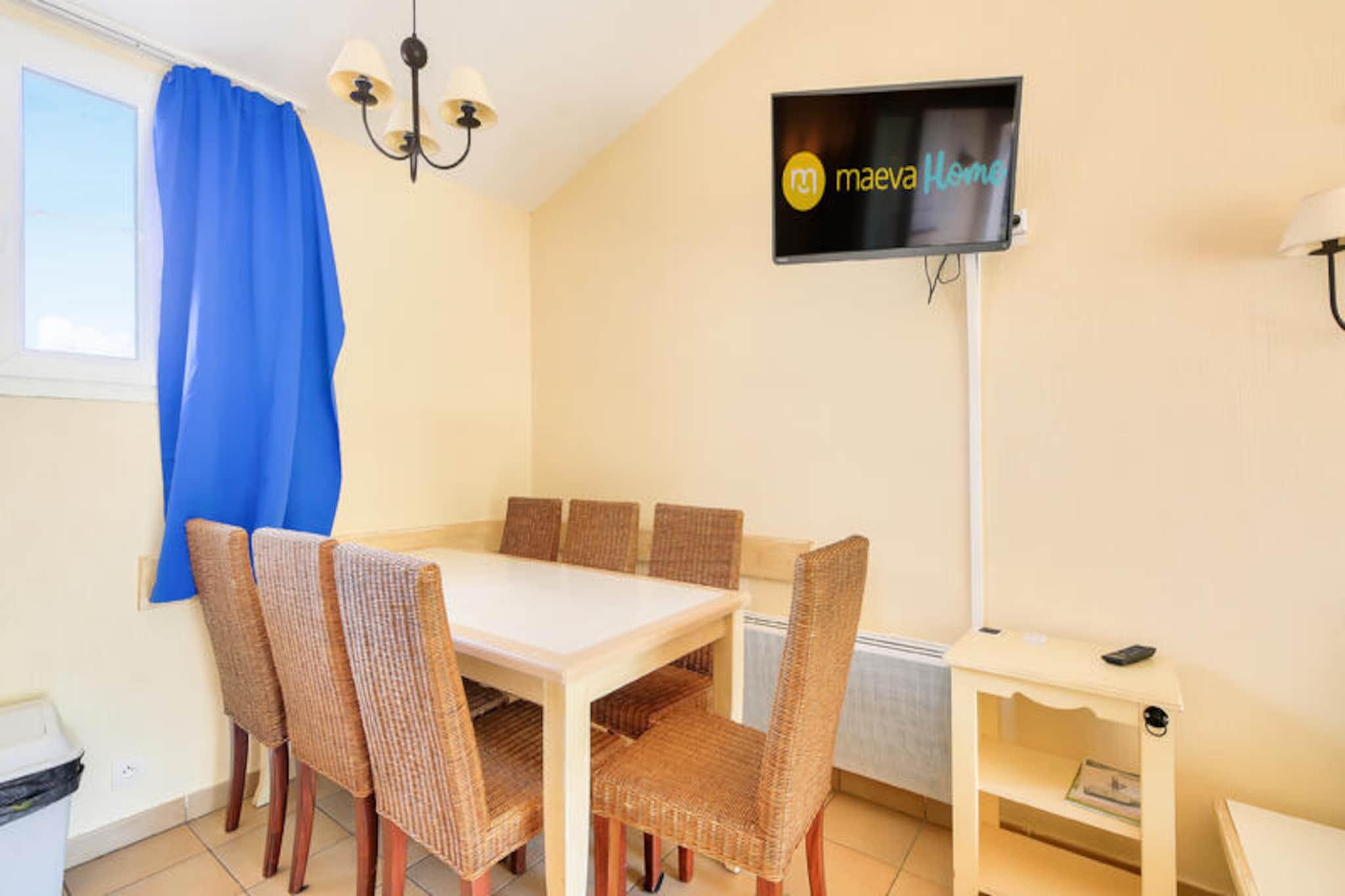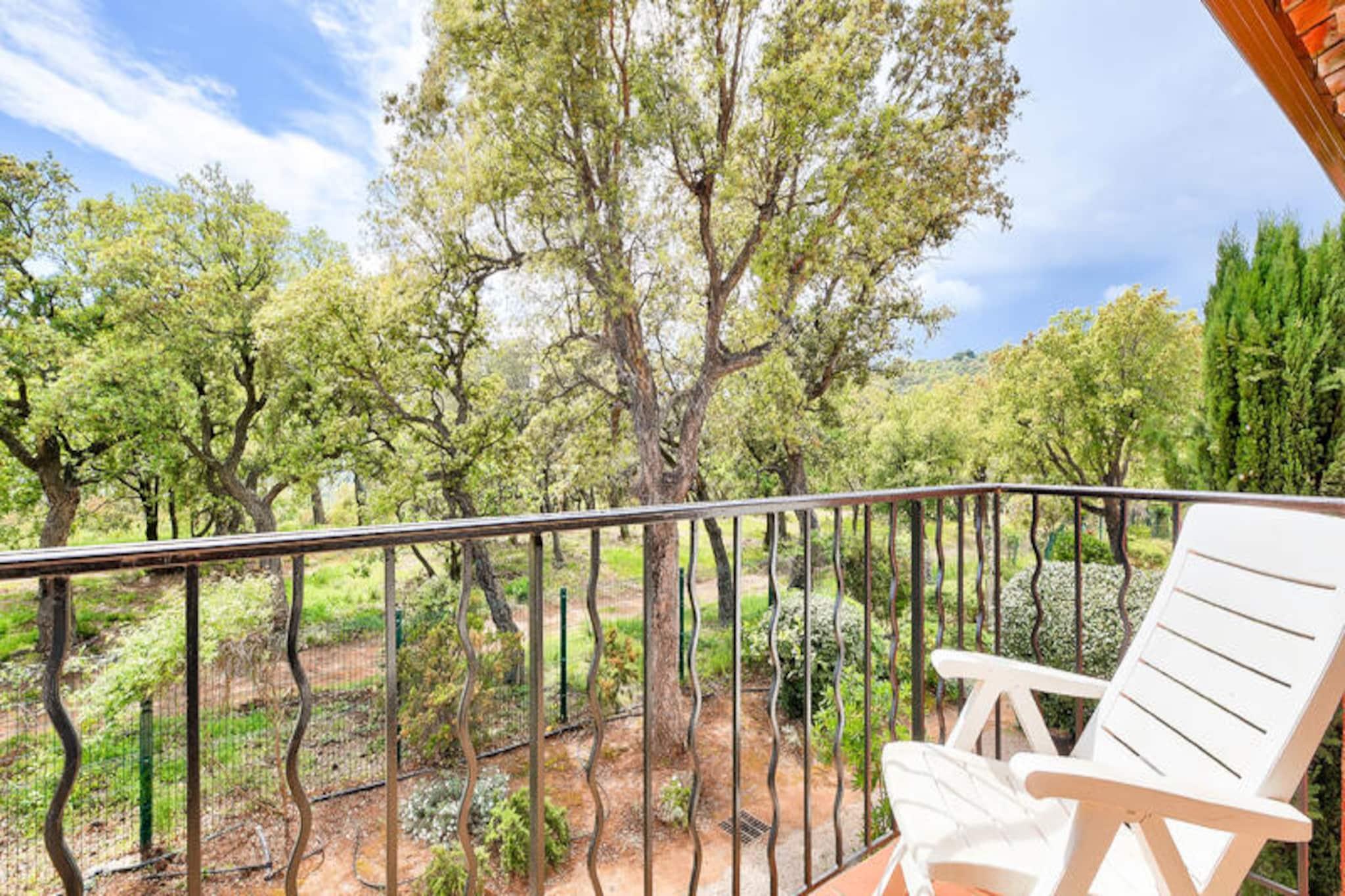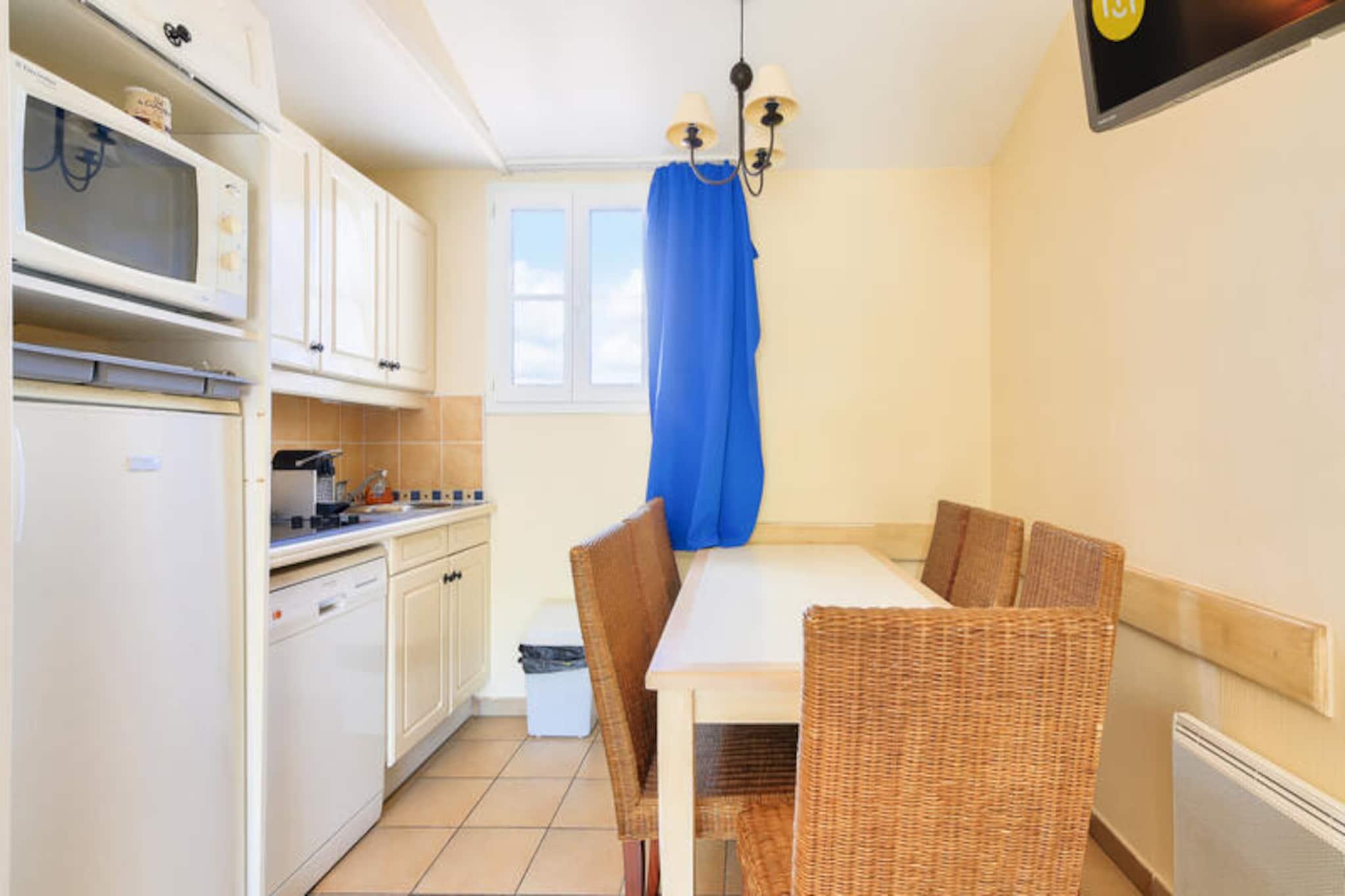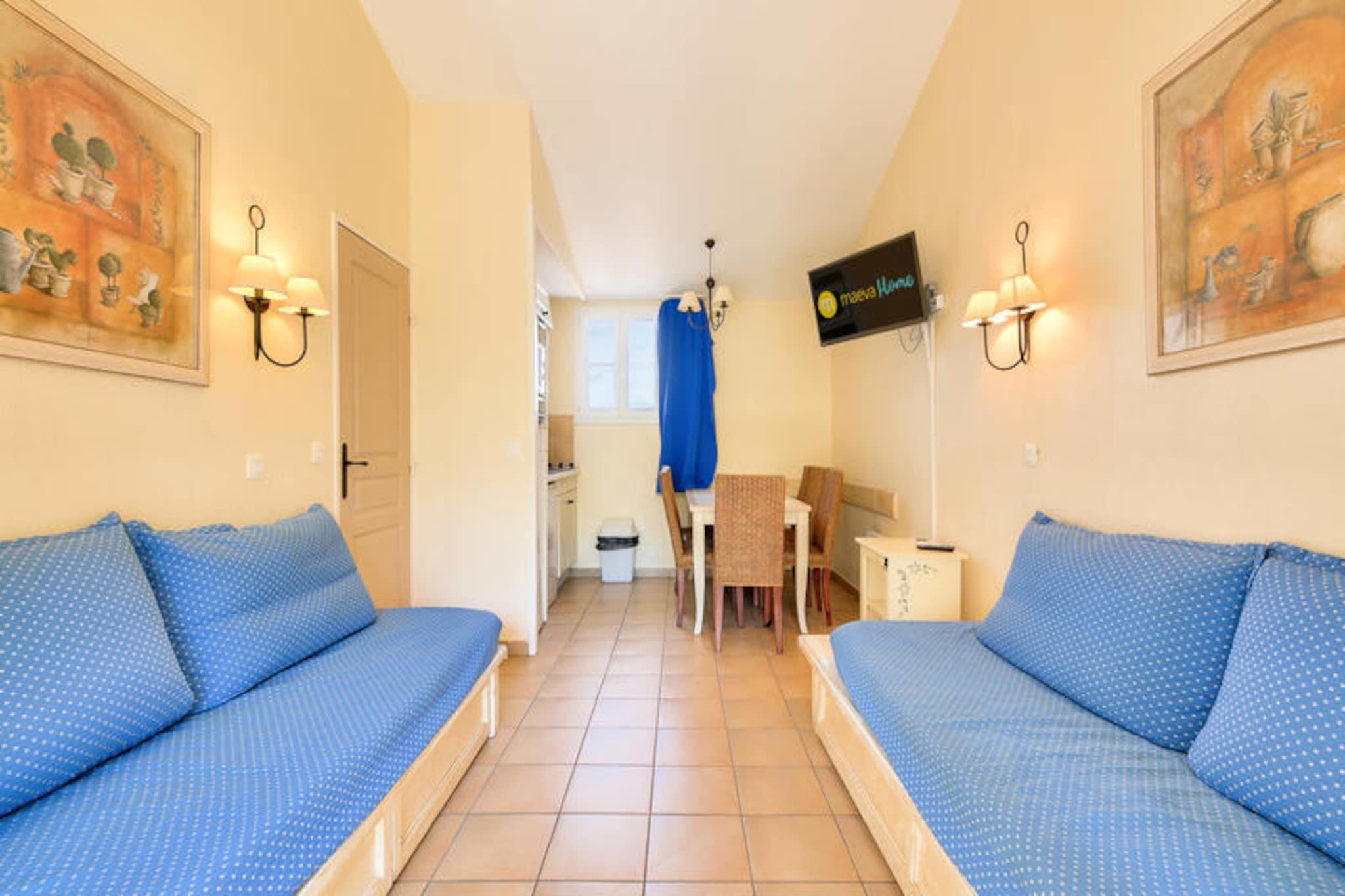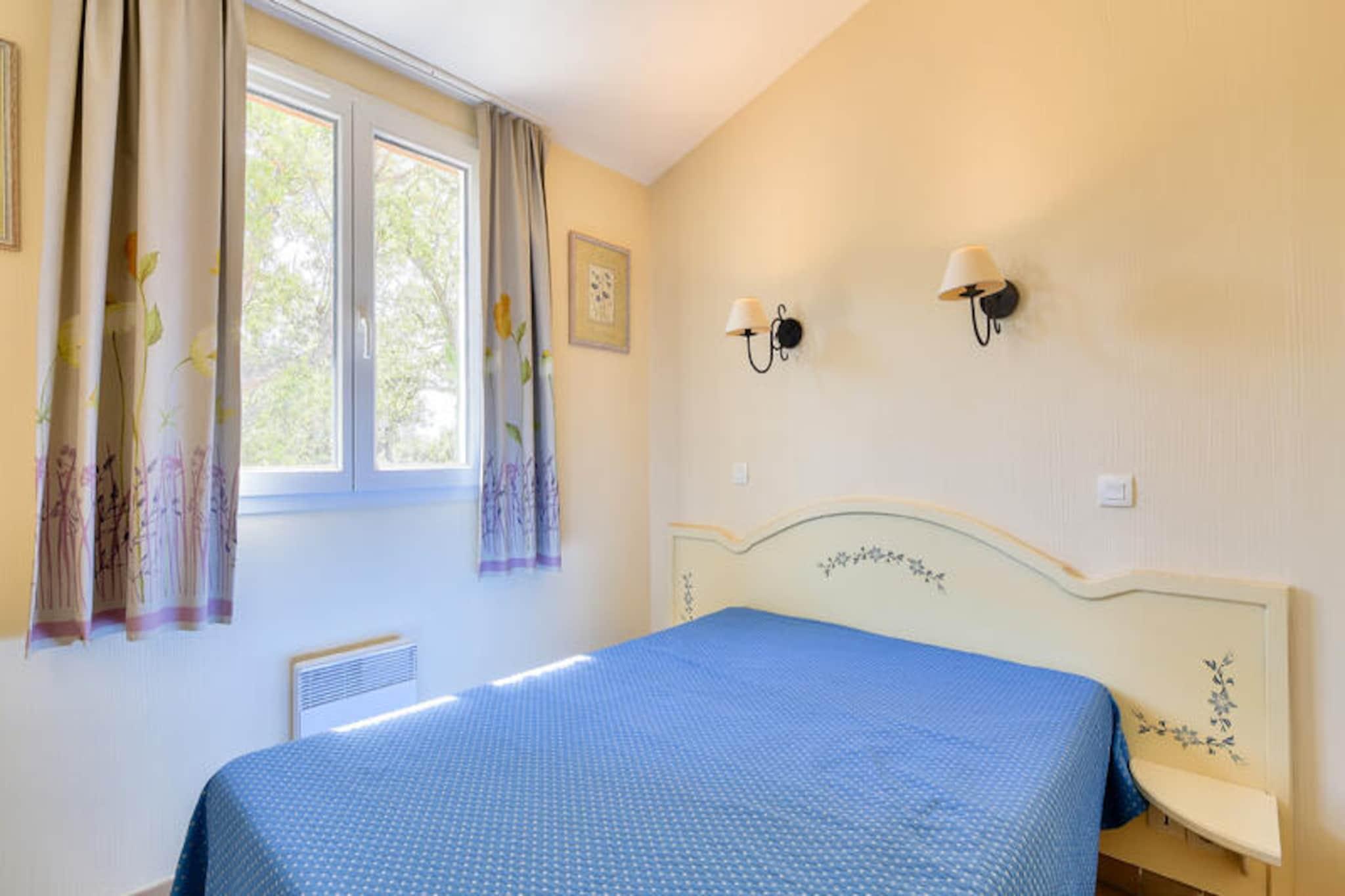This 35m² apartment accommodates up to 4 people and is located on the 2nd floor, offering a cozy living space with a sofa bed and trundle bed in the living room. The bedroom features a double bed, while the cabin area is equipped with bunk beds, perfect for a family or small group. The property is pet-friendly, allowing your furry companions to join the vacation. For added comfort, the apartment includes a balcony with views of the forest, a bathroom with a bathtub, and an electric towel dryer. The residence is conveniently located near local attractions, with shops and activities just 100-500 meters away. A 3 km distance brings you to the sandy beach, perfect for enjoying the Mediterranean sun. Nearby, explore the Provençal village of Grimaud, or take a stroll through the famous city of Saint-Tropez. For outdoor enthusiasts, visit the surrounding hills, such as Croix Valmer and Ramatuelle, or enjoy the local funfair at Luna Park. The resort also offers easy access to the village of Plan de la Tour, ideal for a leisurely evening walk. The apartment is well-equipped with a semi-open American kitchen, complete with essential appliances like a fridge, oven, and stovetop. The bathroom is fitted with a bathtub, electric towel dryer, and hairdryer for your convenience. An outdoor parking space is provided for guests, and additional amenities include a covered balcony with seating for relaxation.