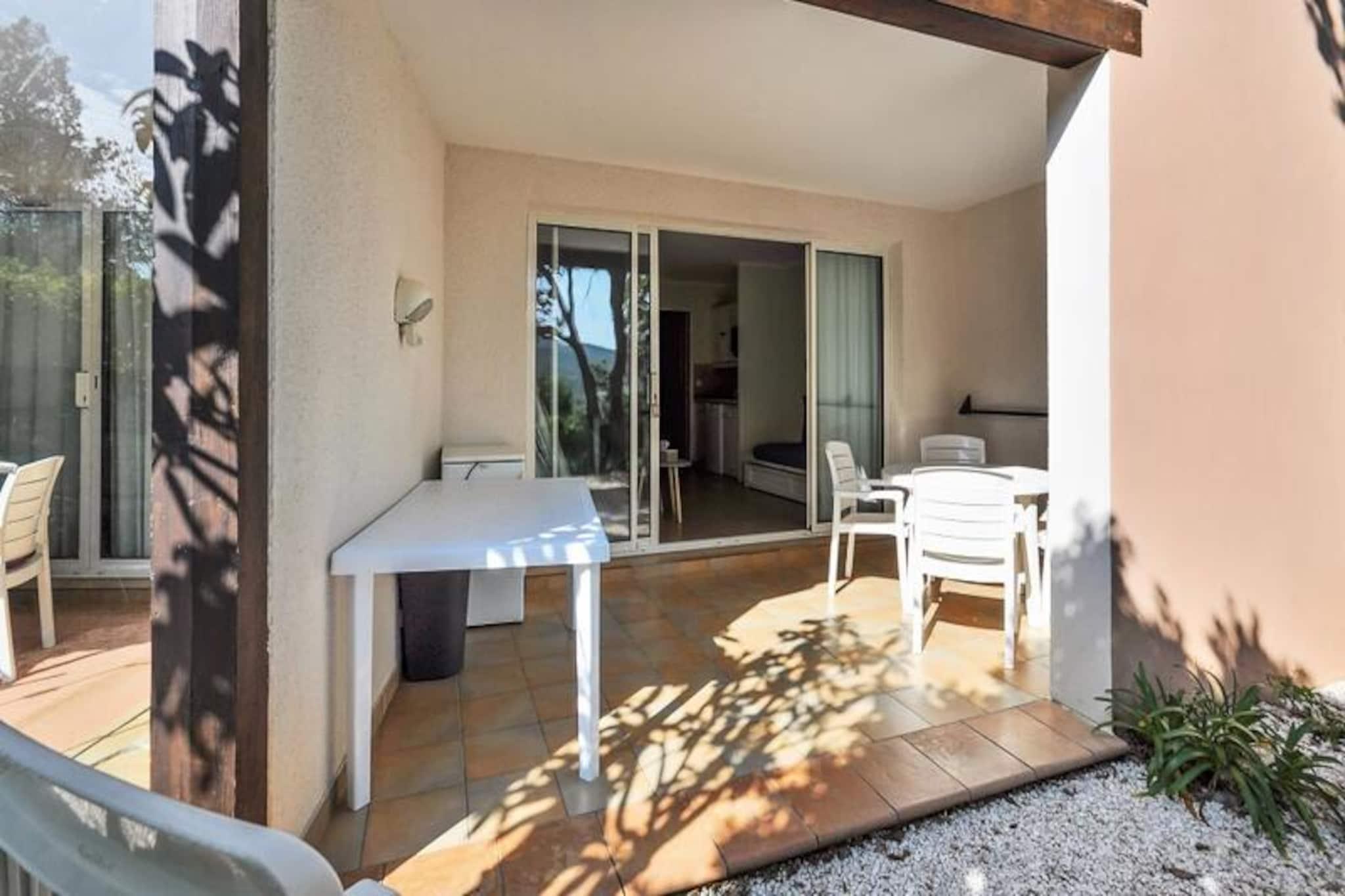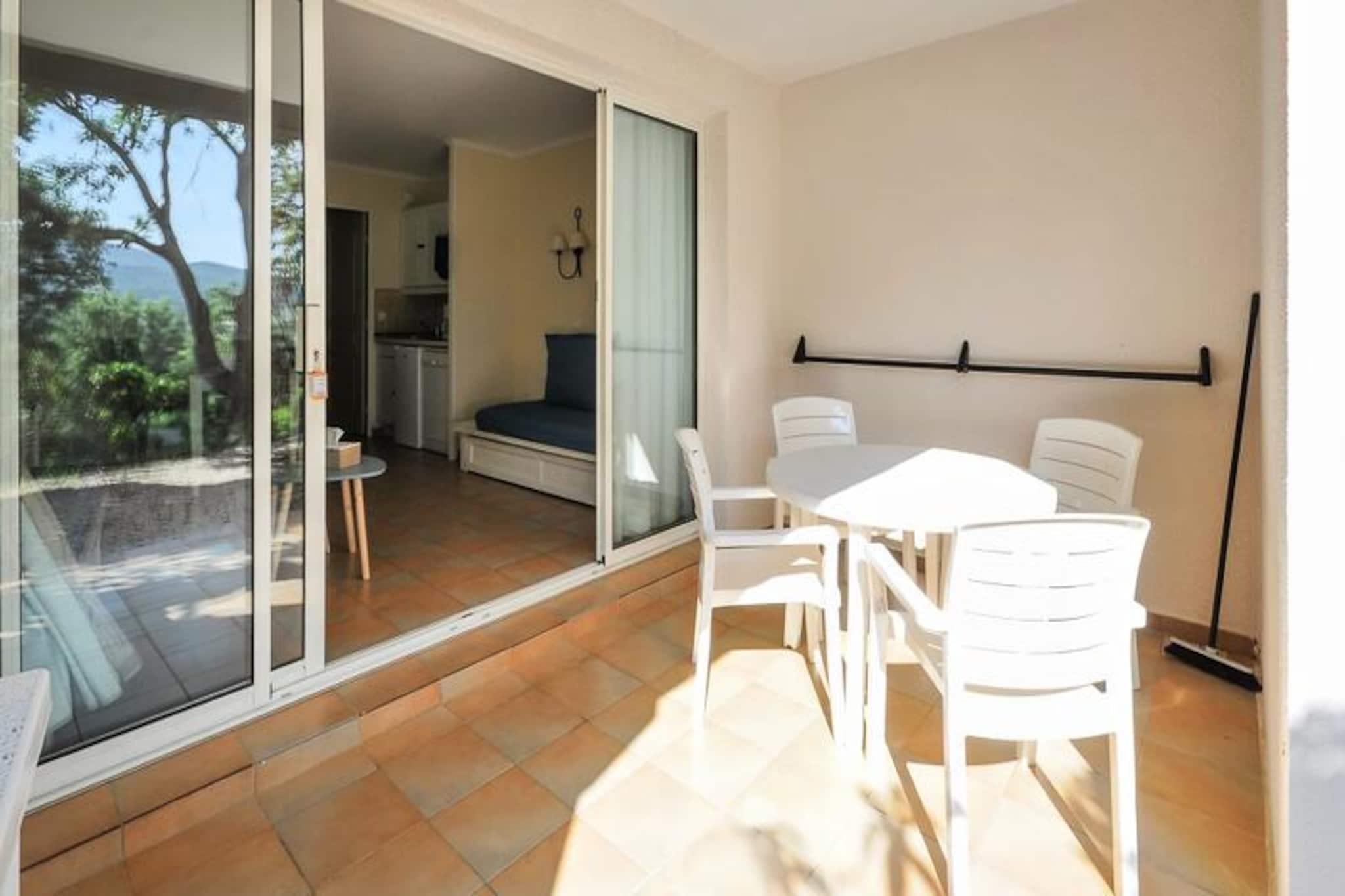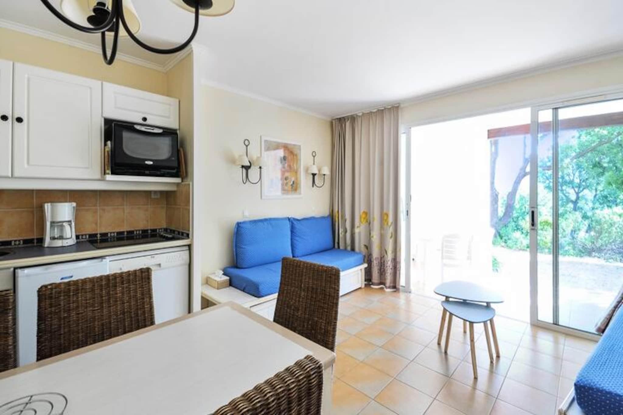 This charming apartment offers a comfortable stay for up to 4 guests, featuring a cozy bedroom with a double bed and a living area with 3 sofa beds. It is pet-friendly, with an additional charge for pets. Amenities include Wi-Fi (subject to availability), television, and a fully equipped kitchen. The apartment also has a bathroom with a bathtub-shower, separate toilet, and a covered terrace with a garden. A parking space is available, subject to availability. Bed linen and towels are available at an extra cost, and end-of-stay cleaning is mandatory. Located in a scenic 25-hectare landscaped area, the property is just 3 km from a sandy beach and offers easy access to local attractions such as Grimaud, Saint-Tropez, and Croix Valmer. The nearby village of Plan de la Tour is perfect for evening strolls, dining, and ice cream. For a fun day out, visit the Luna Park funfair or explore the beautiful Lavandou beach. The residence also provides various leisure activities, including tennis courts, volleyball, and a children’s club (available from July to August). The apartment includes a fully equipped kitchen with all necessary appliances, such as a stove, refrigerator, and coffee machine, making it easy to prepare meals. The residence offers several leisure options, such as an aquatic area with pools, a restaurant with Proven?al cuisine, and bike rentals during summer. Additional services like bed linen, towels, and housekeeping are available for an extra charge.