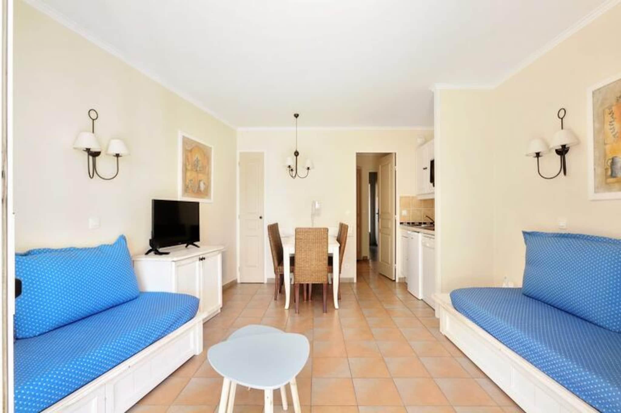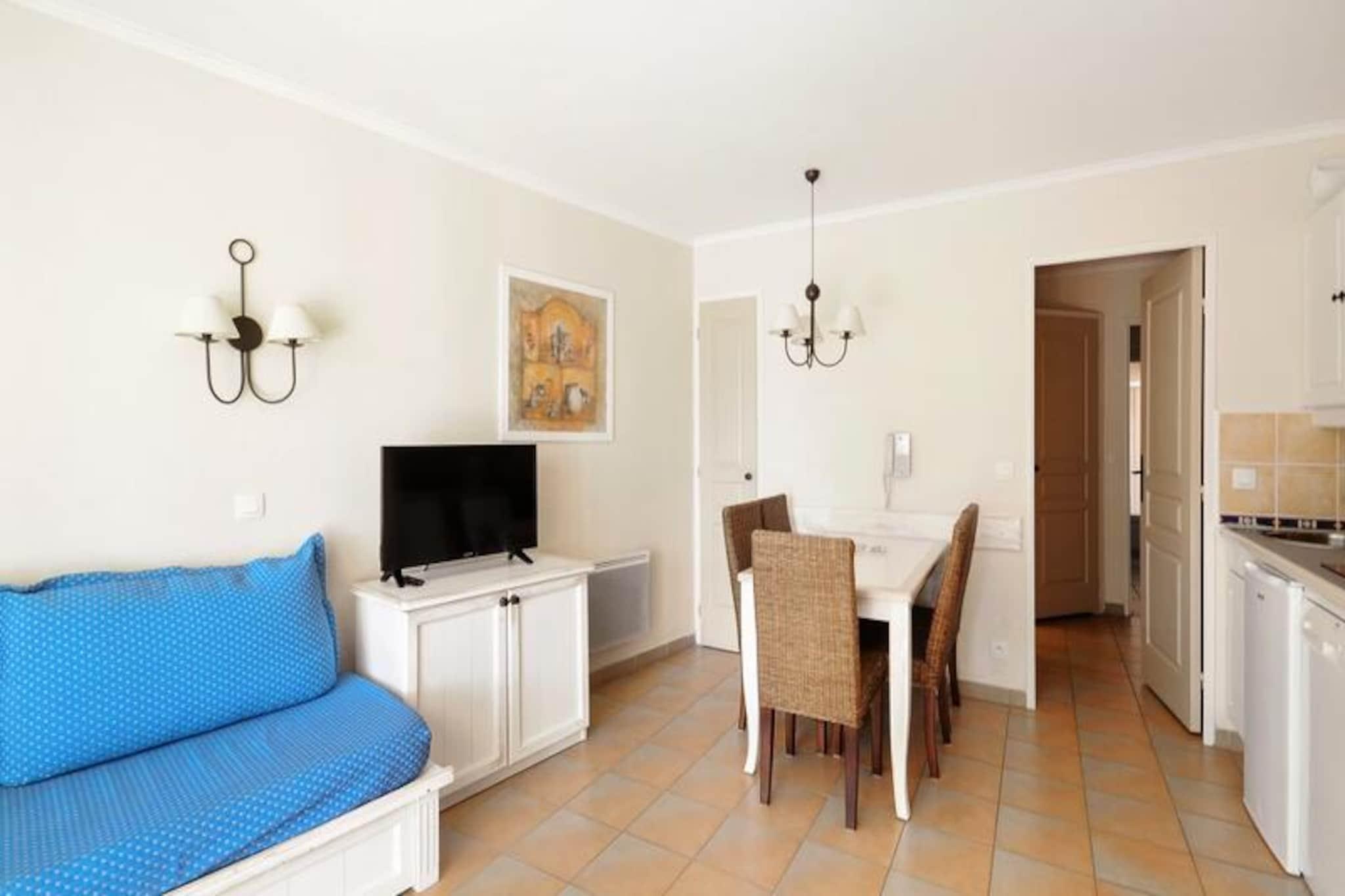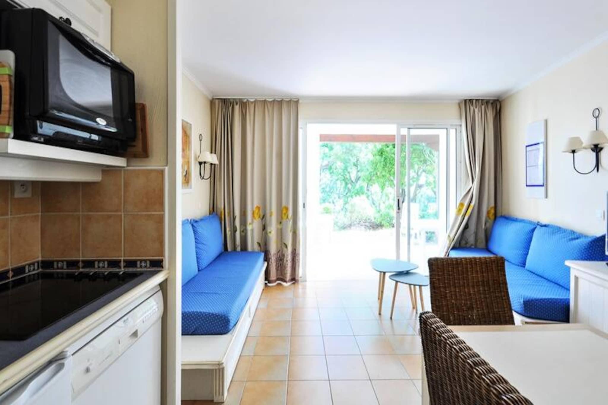 This charming apartment offers a comfortable stay for up to 4 guests, featuring a cozy bedroom with a double bed and a living area with 3 sofa beds. It is pet-friendly, with an additional charge for pets. Amenities include Wi-Fi (subject to availability), television, and a fully equipped kitchen. The apartment also has a bathroom with a bathtub-shower, separate toilet, and a covered terrace with a garden. A parking space is available, subject to availability. Bed linen and towels are available at an extra cost, and end-of-stay cleaning is mandatory. Located in a scenic 25-hectare landscaped area, the property is just 3 km from a sandy beach and offers easy access to local attractions such as Grimaud, Saint-Tropez, and Croix Valmer. The nearby village of Plan de la Tour is perfect for evening strolls, dining, and ice cream. For a fun day out, visit the Luna Park funfair or explore the beautiful Lavandou beach. The residence also provides various leisure activities, including tennis courts, volleyball, and a children’s club (available from July to August). The apartment includes a fully equipped kitchen with all necessary appliances, such as a stove, refrigerator, and coffee machine, making it easy to prepare meals. The residence offers several leisure options, such as an aquatic area with pools, a restaurant with Proven?al cuisine, and bike rentals during summer. Additional services like bed linen, towels, and housekeeping are available for an extra charge.
