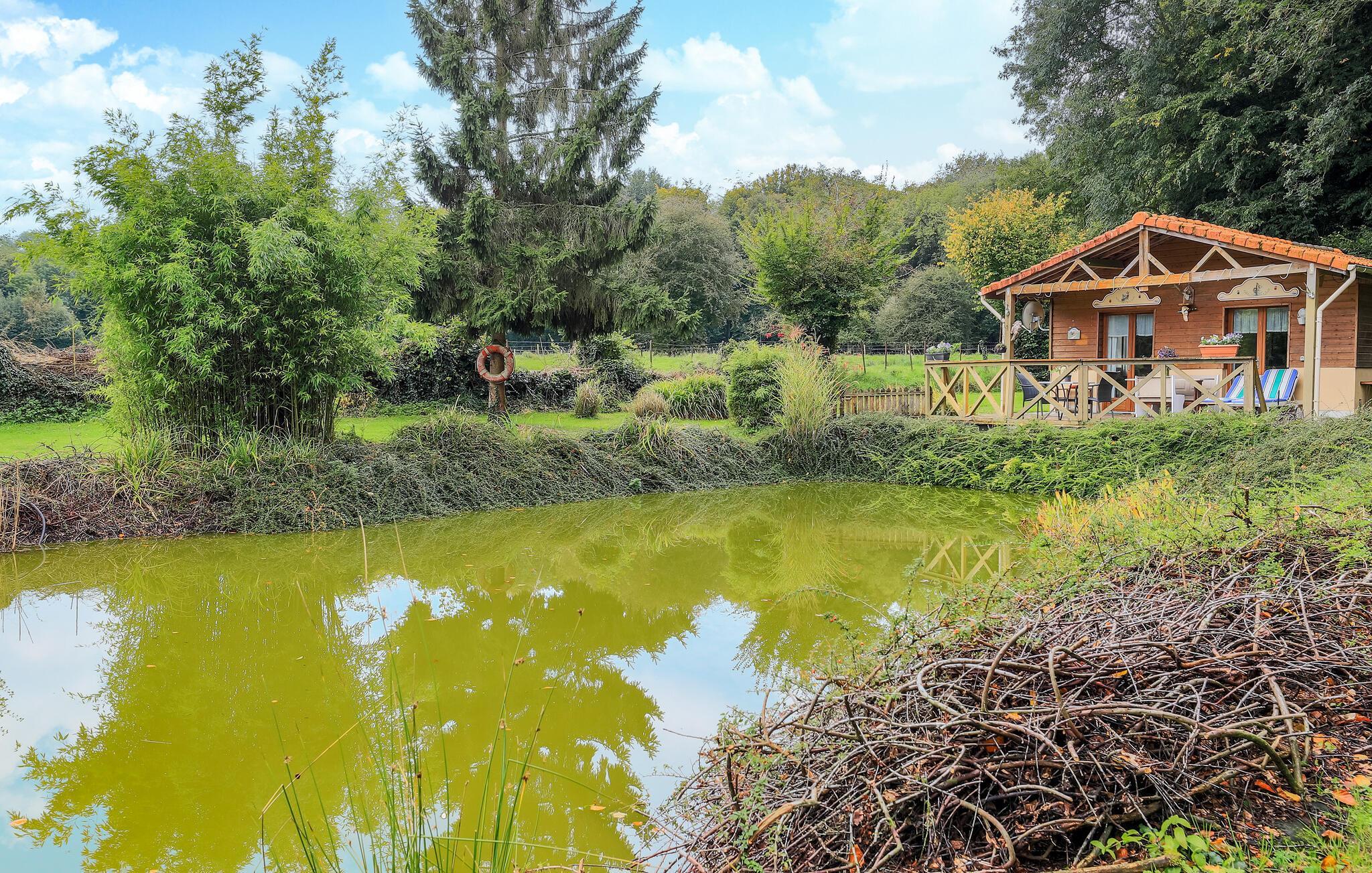Entspannen Sie in einem ruhigen Chalet mit Holzterrasse und Blick auf den privaten Teich.