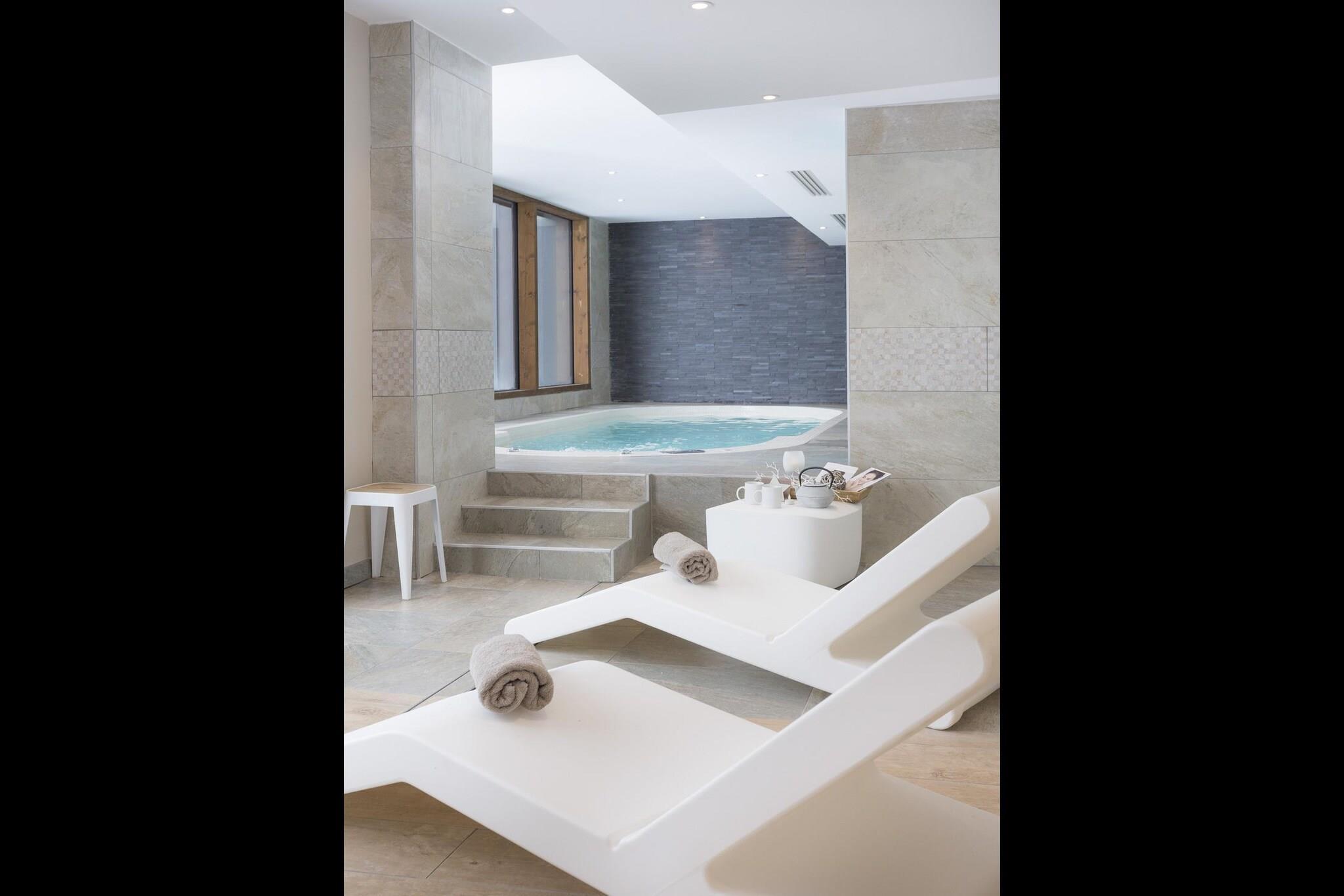 Living room(double sofa bed, TV, fireplace, seating area), open kitchen(hob(ceramic), electric kettle, coffee machine, oven, microwave, dishwasher, fridge, dishes and cutlery), bedroom(single bed, single bed), bedroom(single bed, single bed), bedroom(single bed, single bed), bathroom(bathtub or shower), bathroom(bathtub or shower), sauna, balcony or terrace, swimming pool(shared with other guests, indoor), hairdryer