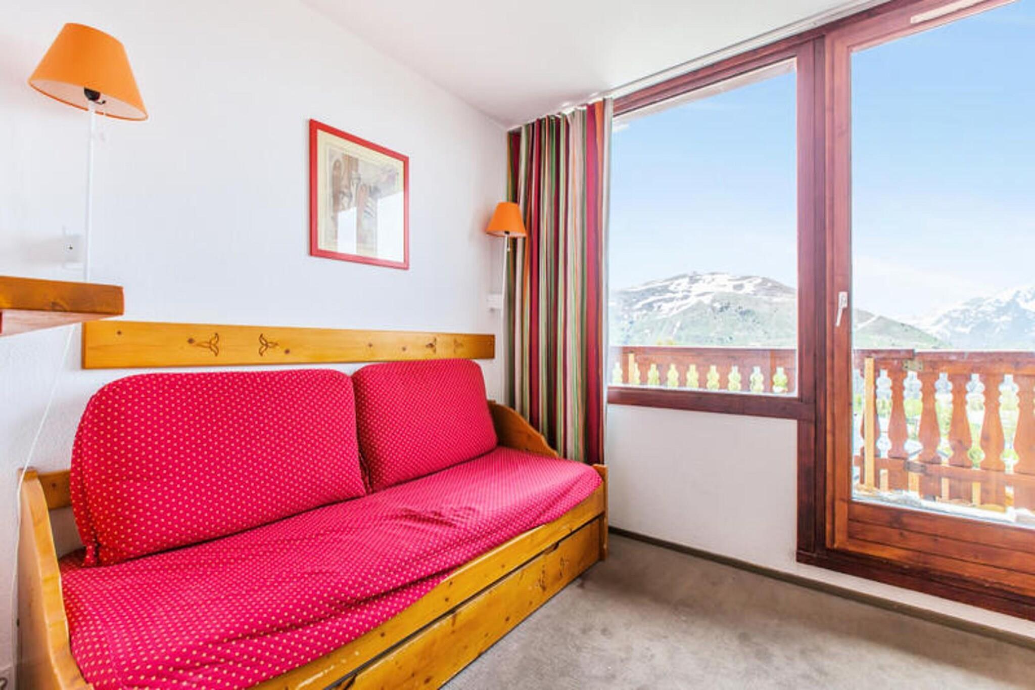 This charming chalet, nestled in the alpine beauty of Huez, offers accommodations for up to six guests. The living room includes a sofa bed and trundle bed for two, complemented by a cozy cabin area with two single bunk beds. The separate bedroom features a double bed, ensuring restful nights. A private balcony, furnished with a table and chairs, provides a perfect spot to soak in the scenic views. Pet-friendly accommodations are available for an additional fee, and amenities include a television, optional Wi-Fi, a safe, and a dishwasher. Surrounded by the ancient mountain pastures of Huez, this property provides a gateway to the region's cultural heritage and natural beauty. Guests can explore nearby hiking trails, savor local cuisine at charming cafes, and shop at bustling markets. The chalet's proximity to the slopes makes it an ideal choice for winter sports enthusiasts and nature lovers alike. Designed for comfort and convenience, the chalet features a well-equipped kitchen open to the living area, complete with a dining table for six. The bathroom includes a bathtub, and a separate toilet enhances privacy. Additional services, such as bed linens, towels, and end-of-stay cleaning, are available for a fee. Paid public parking is located just 50 meters away, ensuring ease of access.