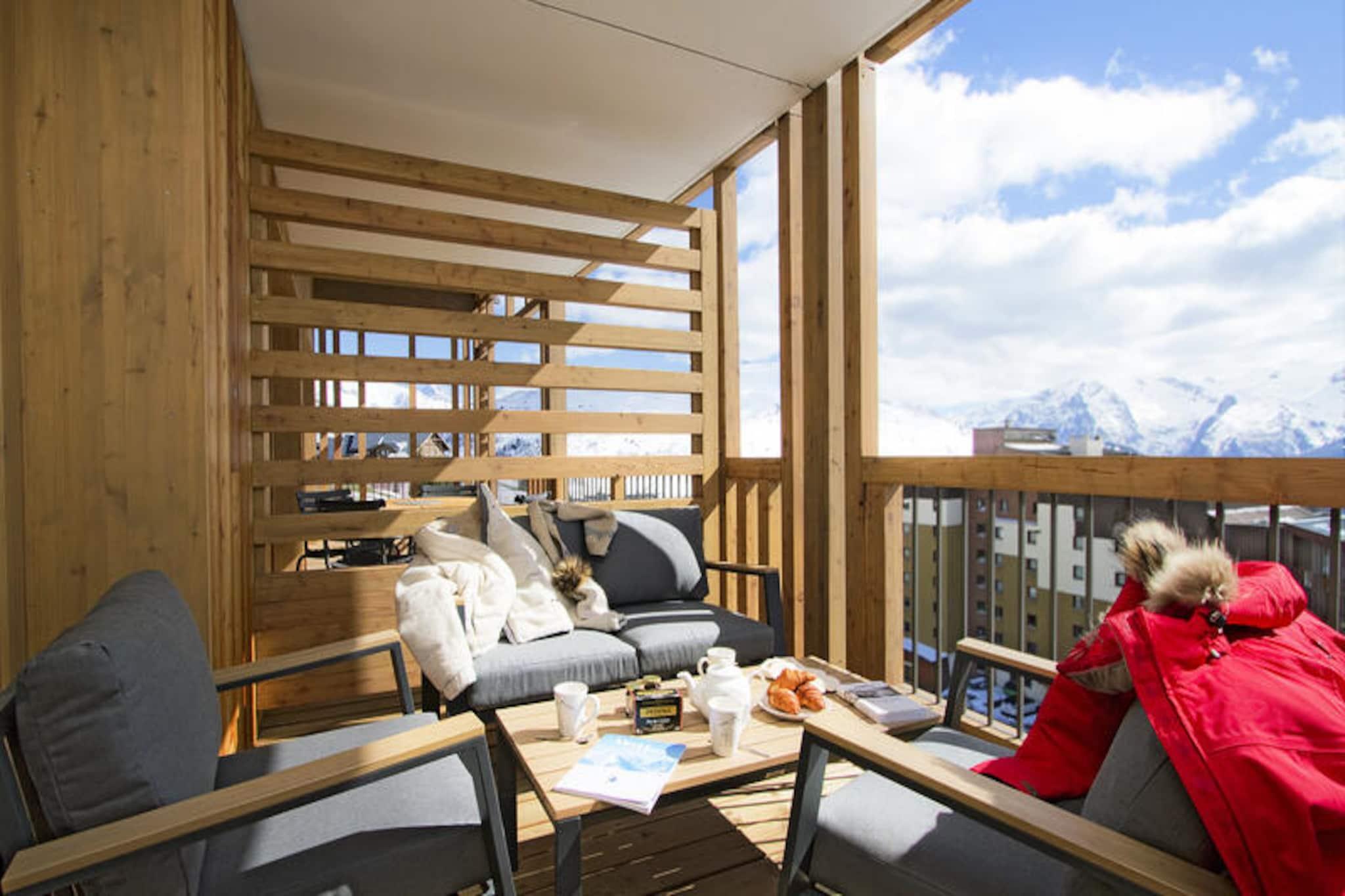 Bathe in the golden alpine sunlight from this modern ski-in/ski-out apartment, perfectly positioned in a new residence that combines luxury with convenience. From the moment you step inside, the bright and airy living space invites you to unwind, with its warm decor and large windows framing stunning views of the south-facing slopes. Whether you're here for adventure or relaxation, this is your gateway to the French Alps at their finest. The apartment is thoughtfully designed to accommodate up to six guests. It features two bedrooms, each with a plush 160cm double bed and a TV, ensuring restful nights after active days. A cozy sleeping alcove with bunk beds is perfect for children or additional guests. The fully equipped kitchen, complete with an oven, microwave, dishwasher, and induction hob, makes it easy to prepare meals, while the spacious living/dining area provides the perfect setting to gather and share stories of the day's adventures. A separate bathroom and toilet add to the comfort, and the 20m² terrace offers breathtaking, unobstructed views of the surrounding slopes. The residence itself is a haven of relaxation and wellness. Enjoy access to a swimming pool, gym, sauna, steam room, and sensory showers, all designed to rejuvenate your body and mind. The ski room provides direct access to the slopes, making it effortless to hit the powder each morning. Located in a prime spot, this apartment offers not just a place to stay but an experience to cherish. With bed linens, towels, and welcome products provided, as well as beds made upon arrival and end-of-stay cleaning included, all you need to do is arrive and immerse yourself in the magic of the mountains. Whether you're a seasoned skier or simply seeking a serene alpine escape, this property promises memories that will last a lifetime.