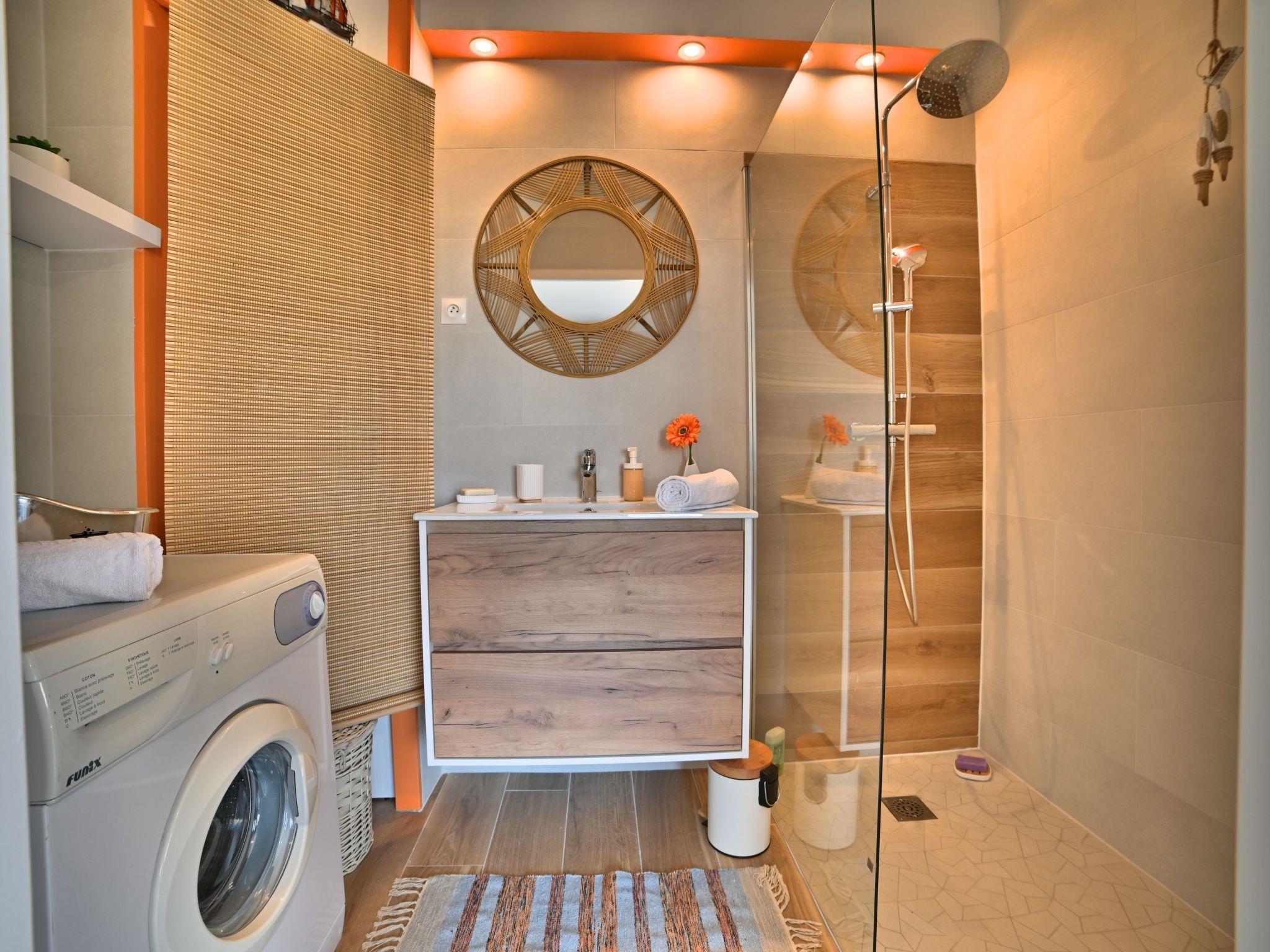 2-room apartment 37 m2, on the ground floor. Bright, comfortable and beautiful furnishings: living/dining room with panoramic window with 1 double sofabed (1 x 140 cm, length 190 cm), TV (flat screen). Exit to the terrace. 1 room with 1 french bed (140 cm, length 190 cm). Open kitchen (oven, 2 induction hot plates, toaster, kettle, microwave, electric coffee machine) with dining table. Shower, sep. WC. Terrace 9 m2, south facing position and west facing position. Terrace furniture. Partial view of the sea. Facilities: washing machine, children's high chair, hair dryer. Internet (WiFi, extra). Parking (1 car). Please note: apartment street side. Non-smoking house. Maximum 1 pet/ dog allowed. Smoke alarm. Offer by a private individual according to Art. 155, IV of CGI. 173850011381F
