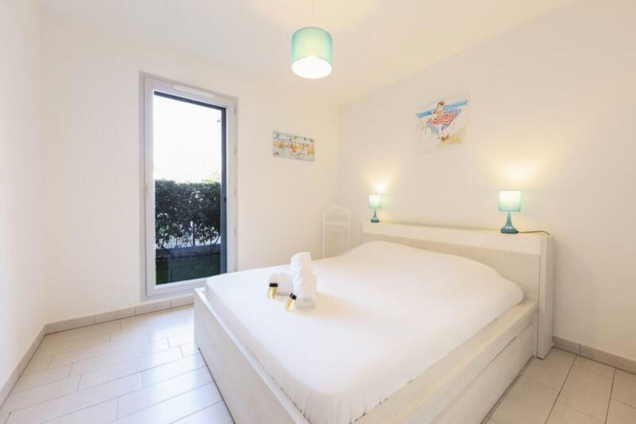 This modern ground-floor apartment is located in a secure, newly built residence and offers comfortable accommodation for up to 4 guests. The apartment features a bedroom with a double bed, a living room with a sofa bed for two, a dining table, and a flat-screen TV. It is fully air-conditioned and equipped with free Wi-Fi. Pets are not allowed, ensuring a peaceful environment for all guests. Linen, bath towels, and toiletries are provided, and cleaning is included in the rental price. A EURO400 deposit is required upon arrival. Situated just 400 meters from the heart of Juan-les-Pins and 600 meters from the beach, the apartment is perfectly placed for those looking to explore the vibrant area. You can easily access a wide variety of shops, cafes, and restaurants within walking distance. The famous Cap d’Antibes is also nearby, offering private beaches and nature reserves to explore. For convenience, the SNCF station is just a 5-minute walk away, and the apartment is also a short drive from the A8 motorway and the airport. The apartment includes a fully equipped open-plan kitchen, allowing guests to prepare meals comfortably. A spacious 30m² garden-level terrace is perfect for outdoor dining and includes a barbecue for enjoyable al fresco meals. Guests also have access to the residence’s secure swimming pool and a parking space in the basement, adding to the convenience of this prime location.