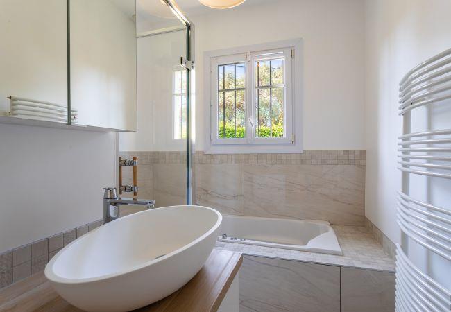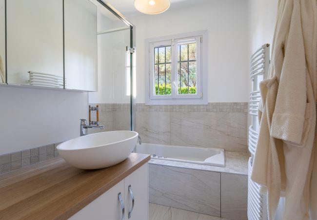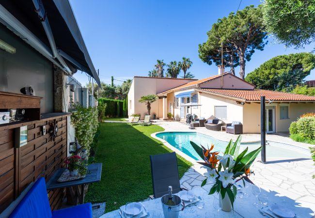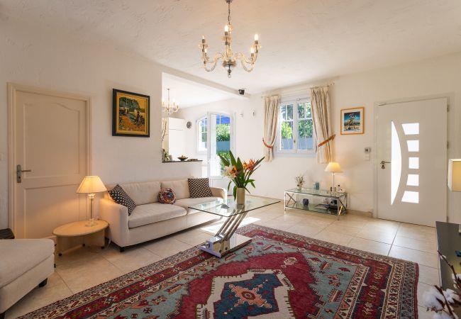 Located in a pleasant residential area in one of the most popular areas of the Côte d'Azur - Cap d'Antibes, this vacation rental villa consists of an equipped American kitchen with dining area overlooking the living room . In total 3 bedrooms, two bedrooms with a double bed (140 cm) each and the other with a queen size bed - a bathroom with a shower, a bathroom with bathtub and 2 toilets, Terrace with BBQ dining area and swimming pool