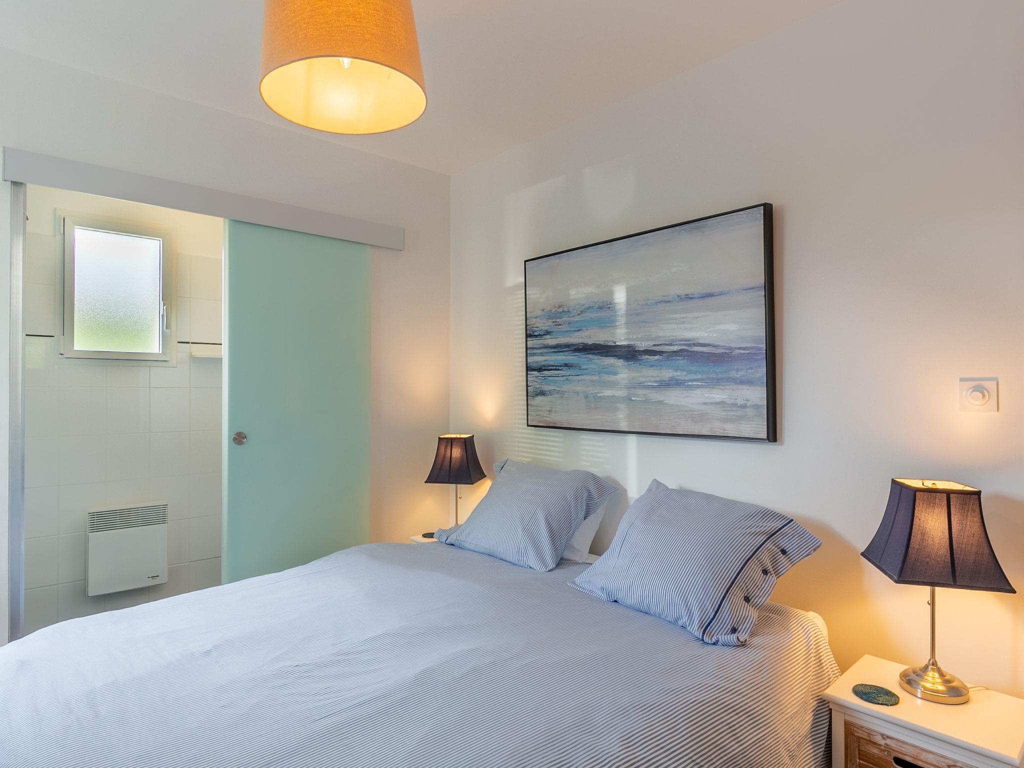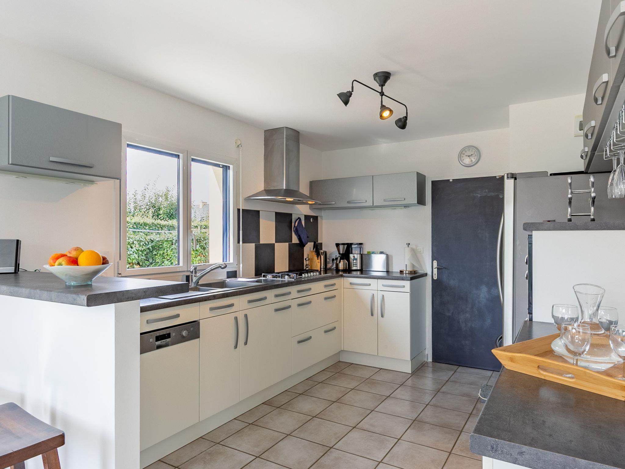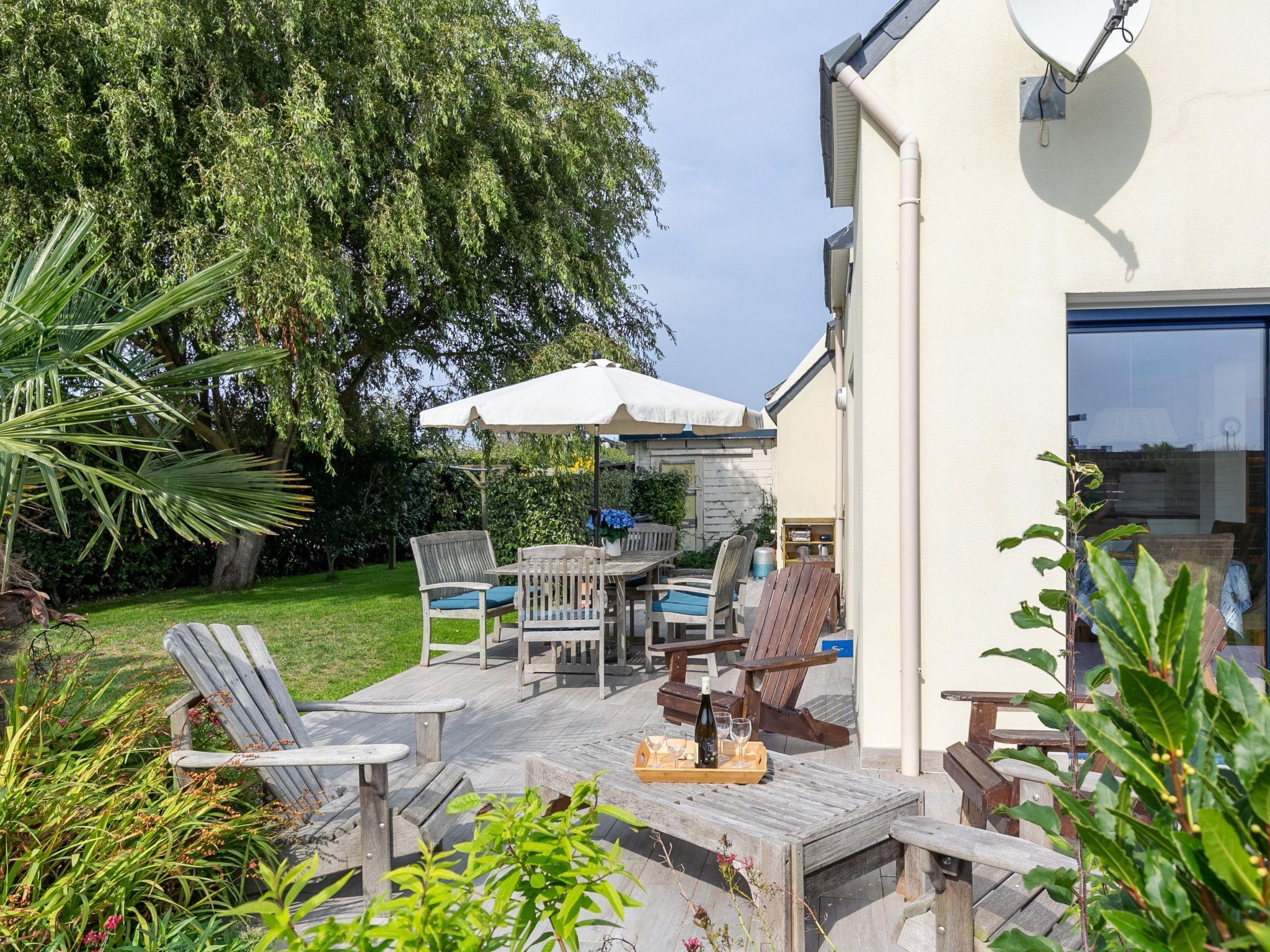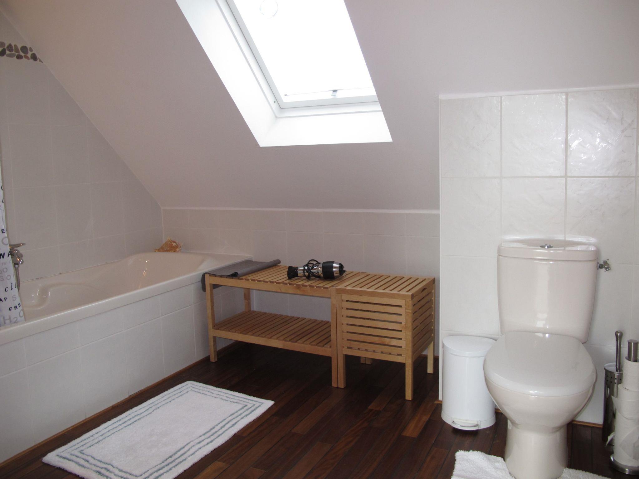 "Ker Simor Ty Mer", 5-room house 120 m2 on 2 levels. Bright, comfortable and tasteful furnishings: living/dining room with Scandinavian wood stove and dining table. Exit to the terrace. 1 room with 1 french bed (160 cm), shower. Open kitchen (oven, dishwasher, 5 gas rings, toaster, kettle, microwave, freezer, electric coffee machine). Sep. WC. Upper floor: living room with sloping ceilings with TV, hi-fi system, DVD and electric heater. 1 room with sloping ceilings with sliding door with 1 french bed (160 cm), electric heater. 1 room with sloping ceilings with 2 beds and electric heater. Bath/WC. Electric heating. Terrace. Terrace furniture, barbecue (portable), deck chairs (4). Facilities: washing machine, dryer, iron, children's high chair, baby cot. Internet (WiFi, free). Please note: non-smoking house. Smoke alarm.