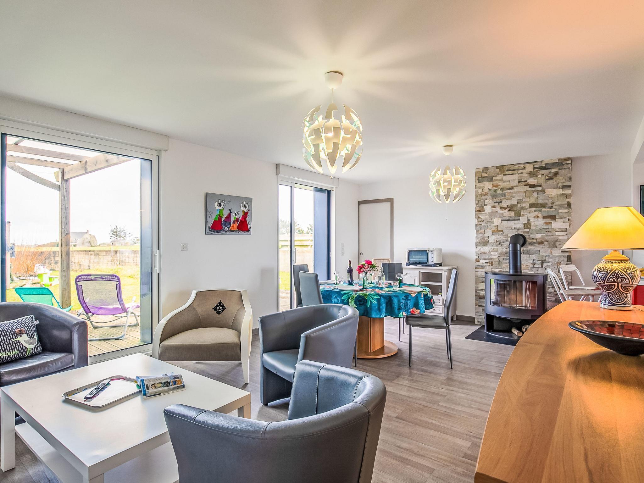 "Le Nid Marin", 3-room house 80 m2. Bright, beautiful and cosy furnishings: open large living/dining room 30 m2 with TV (flat screen), wood-burning stove. Exit to the garden, to the terrace. 1 room 12 m2 with 1 french bed (140 cm, length 190 cm). 1 room 12 m2 with 2 beds (90 cm, length 190 cm). Open kitchen (mini-oven, oven, 3 induction hot plates, toaster, kettle, microwave, freezer, electric coffee machine, Capsules for coffee machine (Senseo) extra). Shower/WC. Electric heating, wood heating. Large terrace 40 m2, south-west facing position. Terrace furniture, barbecue (portable), deck chairs (2). Facilities: washing machine, iron, baby cot for up to 2 year olds, hair dryer. Internet (WiFi, free). Please note: non-smoking house. Maximum 1 pet/ dog allowed. Smoke alarm. Offer by a private individual according to Art. 155, IV of CGI.