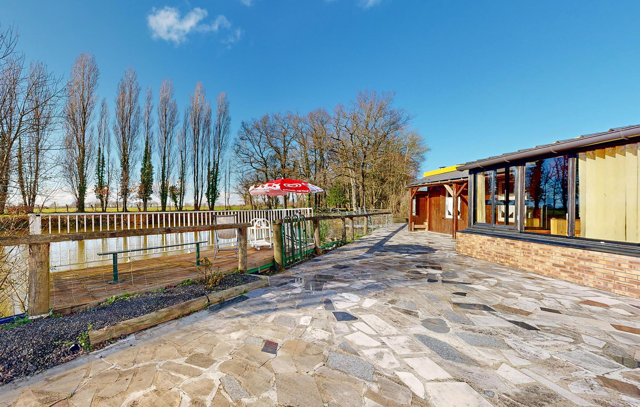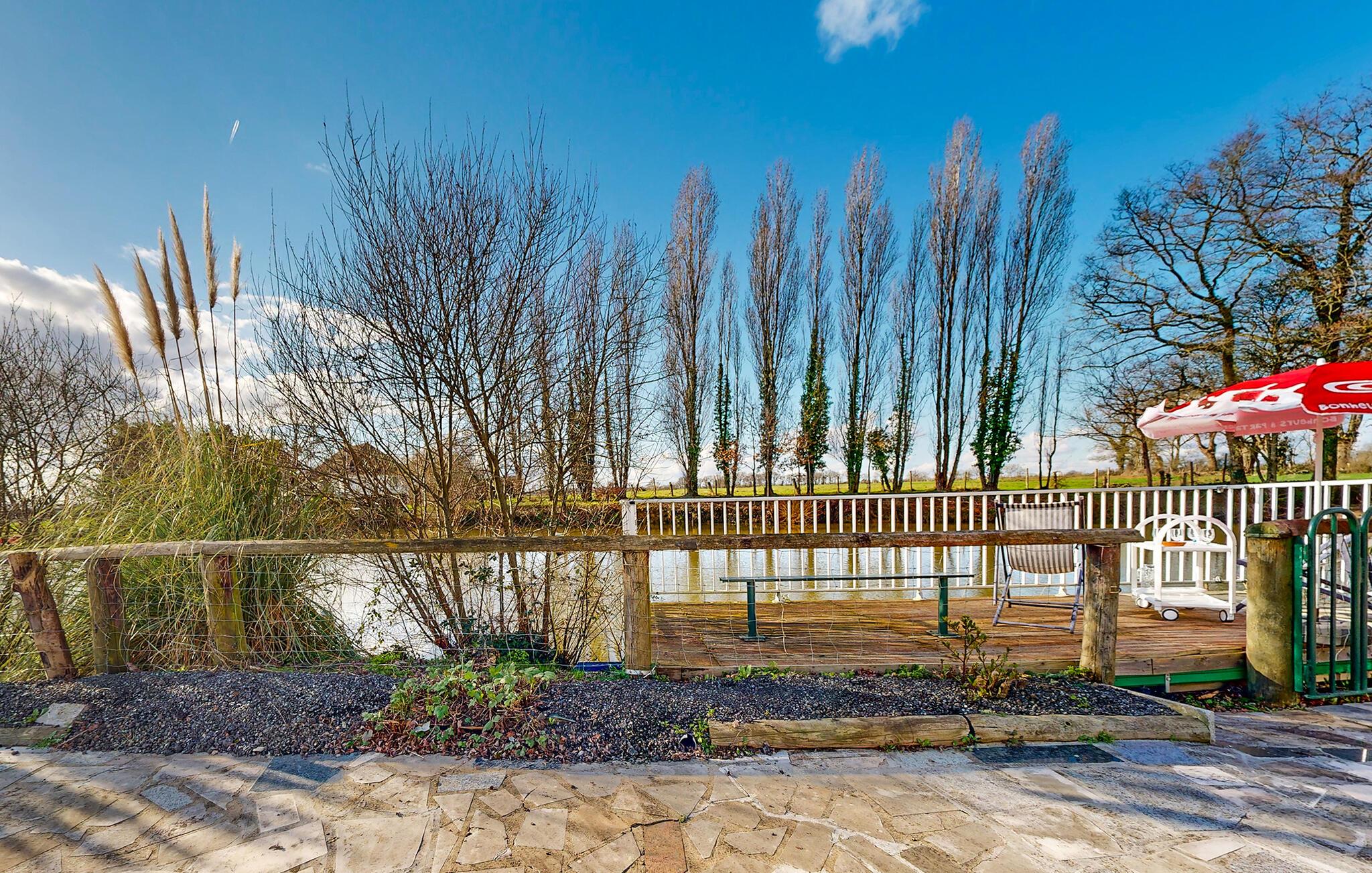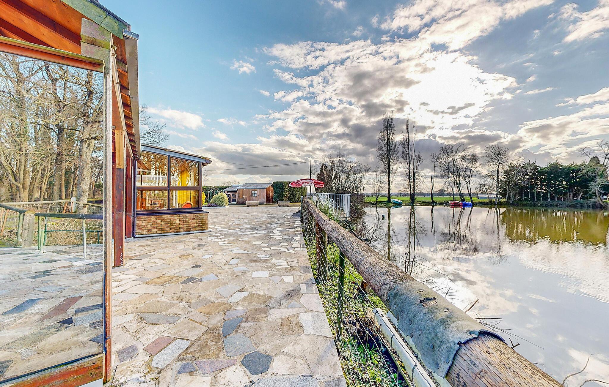 Von hier gelangen Sie auf die große Terrasse mit Pavillon, der zu Mahlzeiten unter freiem Himmel einlädt. Die Lage direkt am Seeufer ist ideal, um direkt vor Ort zu angeln und bestenfalls sogar das Abendessen selbst zu fangen.