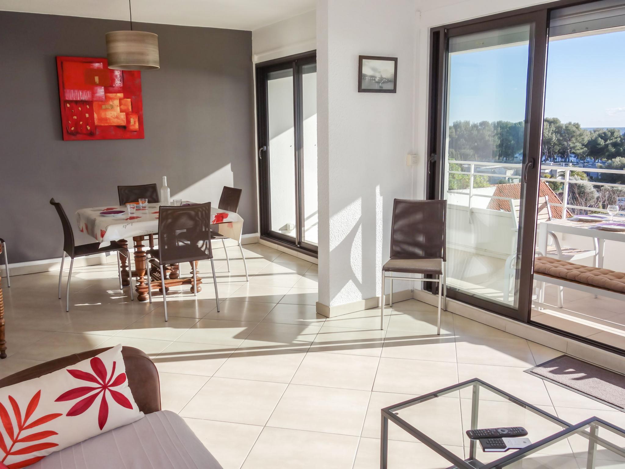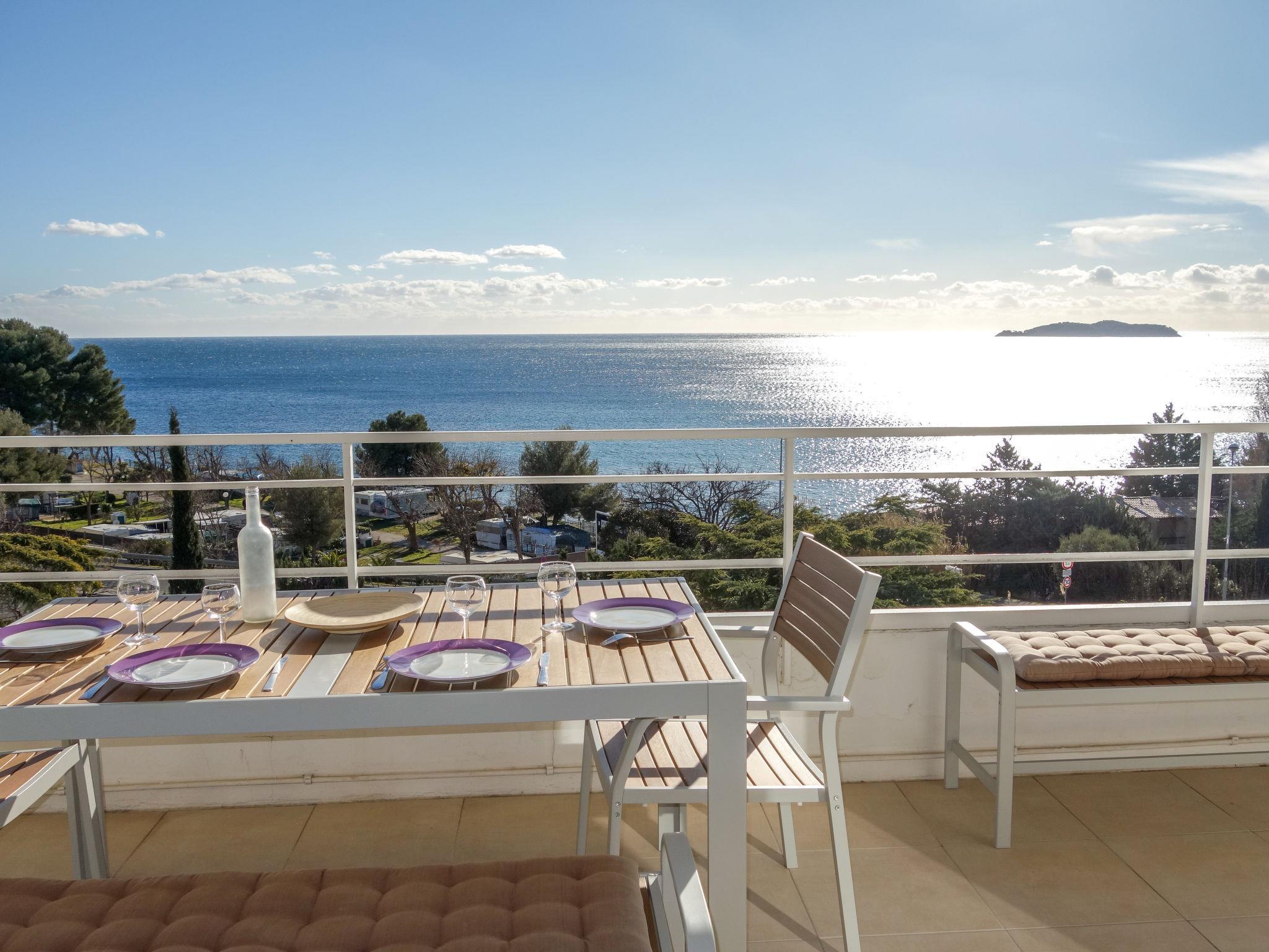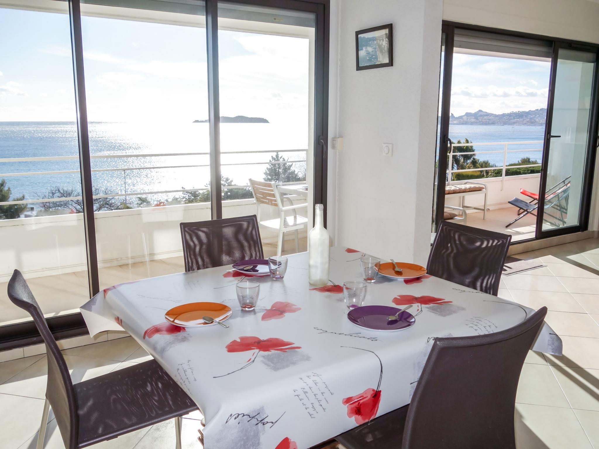 3-room apartment 56 m2 on 1st floor. Comfortable and beautiful furnishings: living/dining room with TV (flat screen), air conditioning. Exit to the terrace. 1 room with 2 beds (90 cm, length 190 cm), TV. 1 small room, window onto the living room with 1 french bed (140 cm, length 190 cm). Open kitchen (oven, dishwasher, 4 induction hot plates, toaster, kettle, microwave, freezer, electric coffee machine, Capsules for coffee machine (SENSEO) extra). Shower, sep. WC. Forced-air heating. Terrace 16 m2, roofed, south-west facing position. Terrace furniture, electric barbecue. Very beautiful panoramic view of the sea. Facilities: washing machine, iron. Internet (WiFi, free). Parking space n 646. Please note: TV only FR. Smoke alarm. 130280000986A