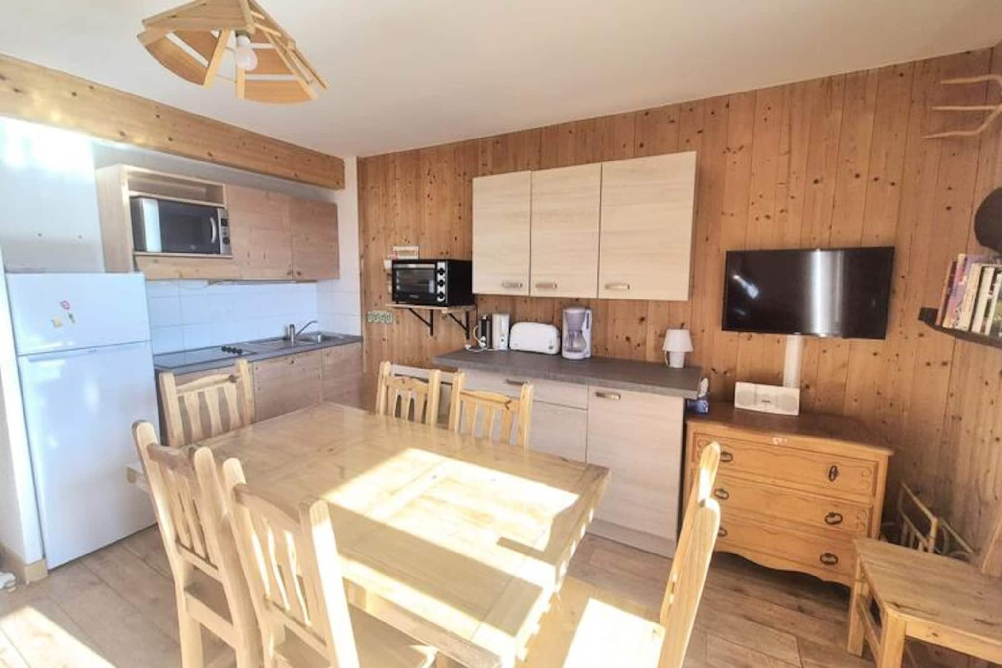 Surrounded by the stunning beauty of the Bauges massif, this charming mountain chalet in La Féclaz invites you to experience the perfect alpine getaway. With its warm ambiance and thoughtful design, this cozy retreat is ideal for families or groups of up to six, offering a harmonious blend of comfort and convenience amidst breathtaking natural landscapes. Whether you're seeking adventure or relaxation, this property is your gateway to unforgettable moments in the heart of the French Alps.\n\nThe chalet spans two levels, featuring a bright and spacious living room equipped with a television for cozy evenings. The fully equipped kitchen includes modern appliances such as a refrigerator, freezer, microwave, mini oven, dishwasher, and even specialty items like a fondue maker and raclette grill for authentic Savoyard dining experiences. Three inviting bedrooms ensure restful nights: two with double beds, one offering picturesque mountain views, and a third with bunk beds perfect for children. Additional amenities include a balcony with panoramic vistas, a shower room, a bathroom with a bathtub, and separate toilets. Sheets and towels are provided, and beds are made upon arrival for your convenience.\n\nLa Féclaz offers direct access to downhill and Nordic ski slopes, making it a paradise for winter sports enthusiasts. In summer, explore the UNESCO-listed Bauges massif via scenic hiking trails that start right from the village. Nearby shops, restaurants, and seasonal activities ensure you have everything you need within easy reach. During school holidays, guests enjoy complimentary access to the swimming pool, sauna, and games room, adding extra delight to your stay.\n\nWhether you're here to ski, hike, or simply unwind in nature, this chalet promises a memorable escape where comfort meets alpine charm. Create lasting memories in this exceptional setting, perfect for reconnecting with loved ones and the great outdoors.