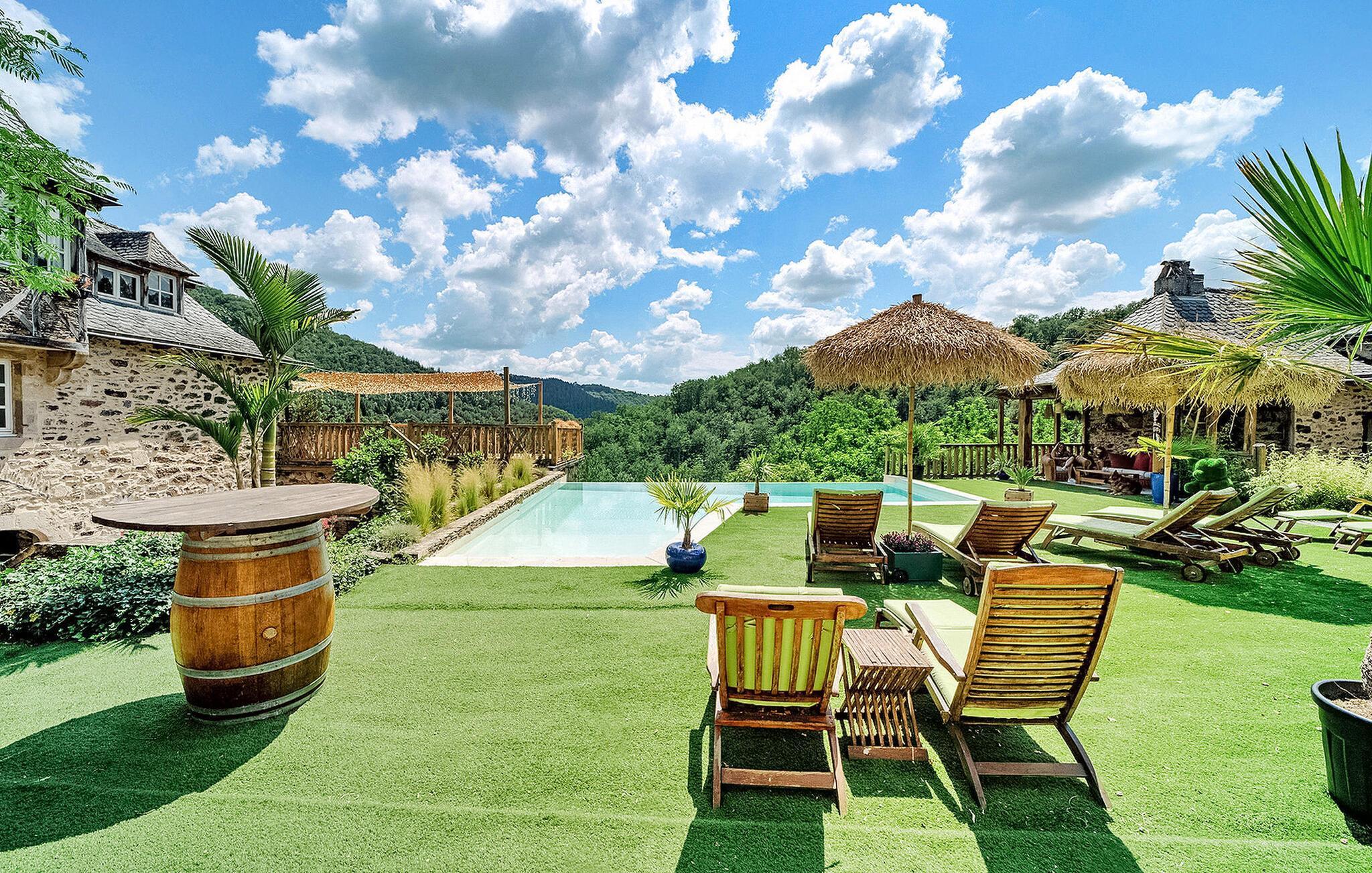 Erleben Sie Luxus in dieser weitläufigen Ferienunterkunft im malerischen Aveyron-Tal. Auf einer Fläche von 21 Hektar können Sie den privaten Pool, den Tennisplatz, den Whirlpool und den Strand am Flussufer genießen. Entdecken Sie in drei Gebäuden geräumige Wohnbereiche, eine professionelle Küche und eine Terrasse mit atemberaubendem Talblick. Genießen Sie ein gemütliches Wohnzimmer, eine gut ausgestattete Bar und sechs Schlafzimmer in einem Gebäude. Ein weiteres Gebäude bietet fünf Schlafzimmer mit eigenem Eingang und modernen Annehmlichkeiten wie Klimaanlage, Flachbildschirmen, WLAN und Minibar. Erfreuen Sie sich im Freien an einer großzügigen Terrasse, einem weitläufigen Grundstück, einem Tennisplatz und einem Whirlpool. Nehmen Sie ein Bad im privaten Infinity-Pool oder erkunden Sie Aktivitäten wie Pétanque, Tischtennis und einen Spielbereich für Kinder. Das Gelände bietet sogar Platz für Helikopter. Bitte beachten Sie: In der Nähe gibt es eine Bahnstrecke mit minimaler Zugaktivität und einen ungesicherten Fischteich (Karpfen) vor Ort. Die Eigentümer wohnen in einem unabhängigen Haus. Zu den Dienstleistungen gehören Catering und Brotlieferung auf Anfrage, um einen reibungslosen und genussvollen Aufenthalt inmitten der Pracht der Natur zu gewährleisten. Das Anwesen liegt auf dem Land und ist Teil der Gemeinde La Fouillade im Aveyron.