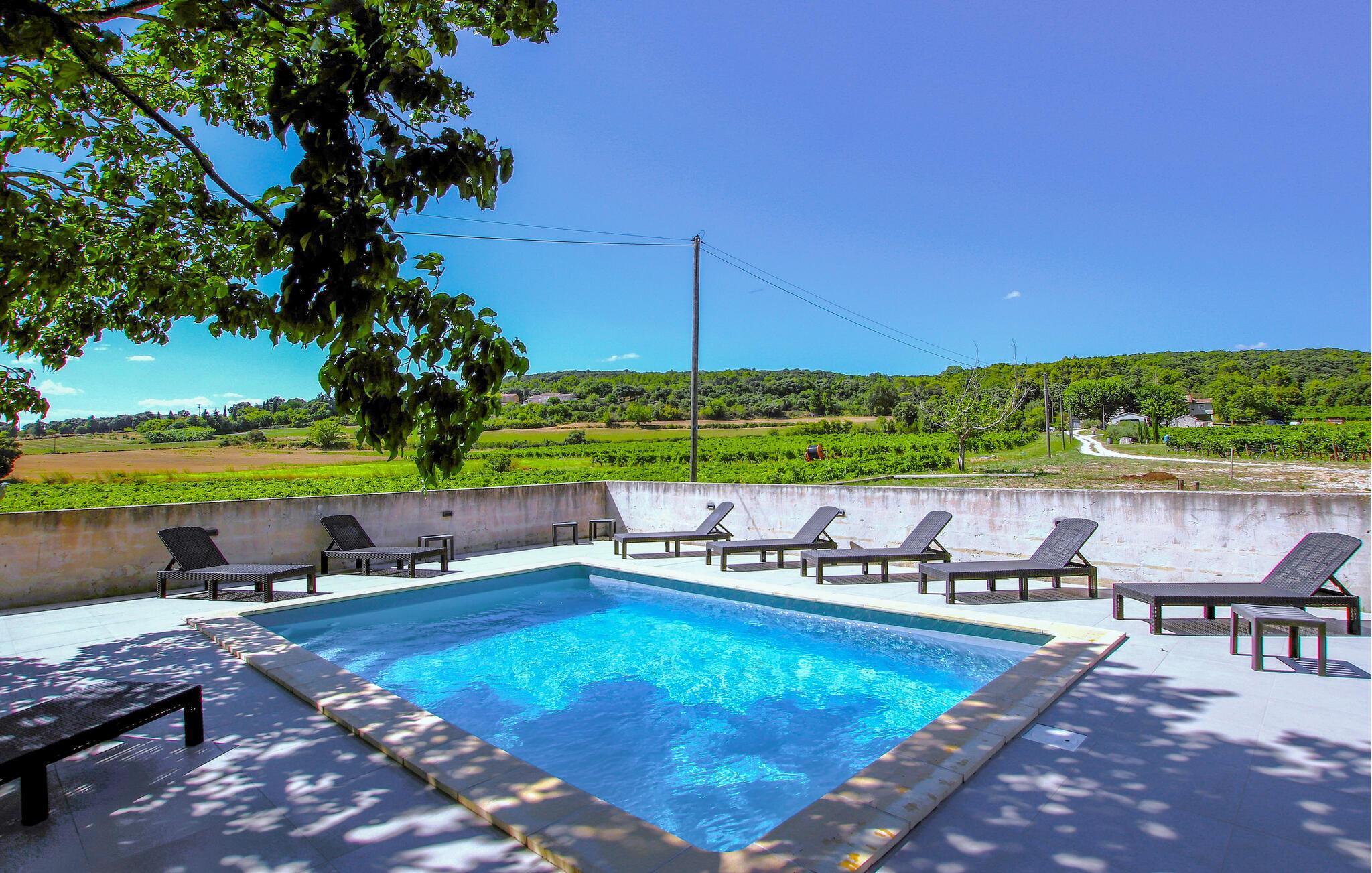 Treten Sie von ist gemütlichen und komfortablen Innenräumen hinaus auf die riesige Sonnenterrasse mit Blick auf den schönen Privatpool, der vor allen Blicken geschützt ist. Sonnen Sie sich am Pool und kommen am Abend zum Grillen auf der Terrasse zusammen.