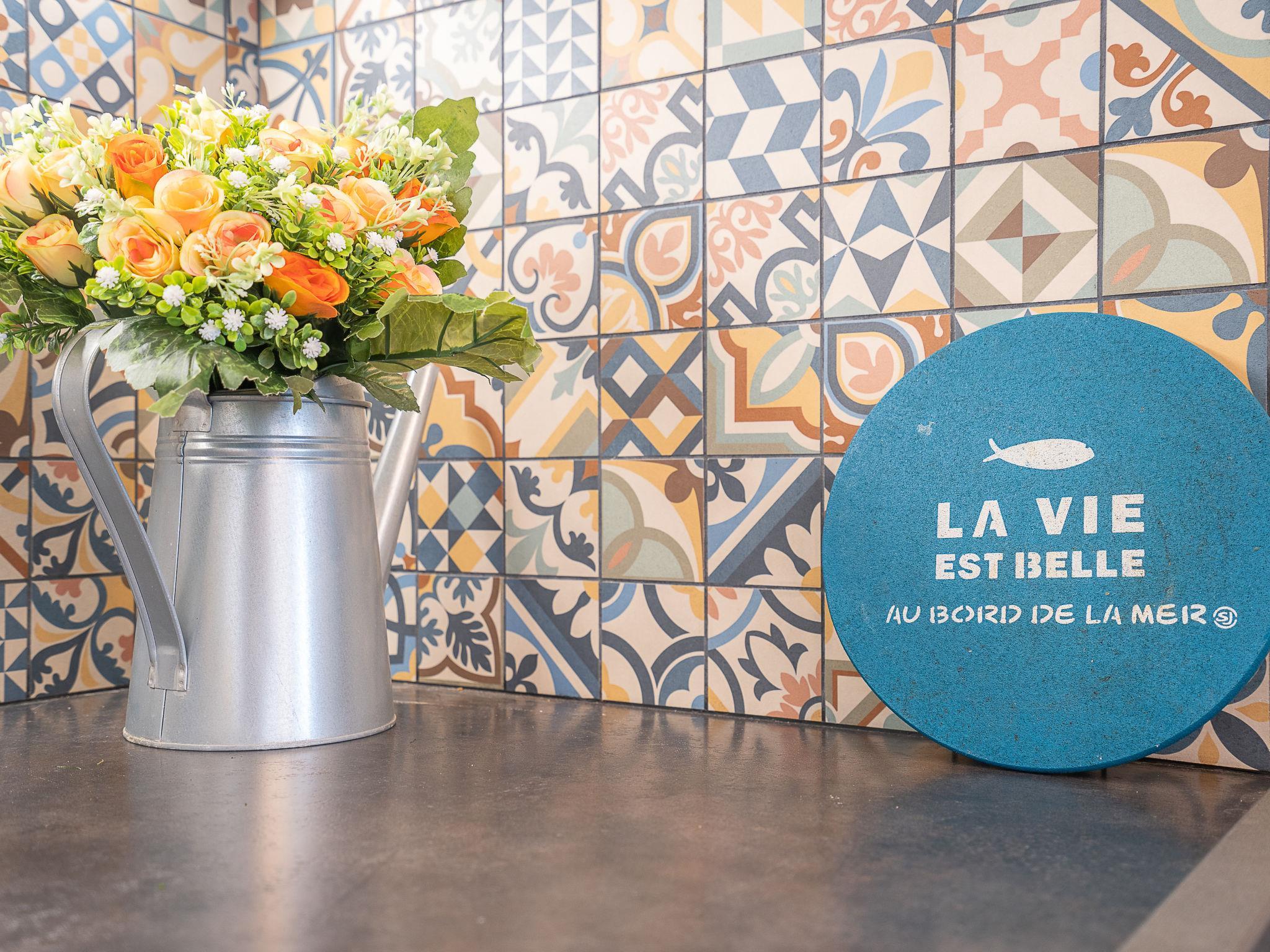 3-room apartment 40 m2 on 5th floor. Comfortable and modern furnishings: living/dining room with TV (flat screen). 1 room with 1 french bed (140 cm, length 190 cm). 1 small room with 1 x 2 bunk beds (90 cm, length 190 cm). Open kitchen (oven, dishwasher, 3 ceramic glass hob hotplates, toaster, kettle, microwave, freezer, electric coffee machine). Shower, sep. WC. Heating. Terrace 9 m2, south-west facing position. Terrace furniture, covered balcony. Distant view of the sea and the countryside. Facilities: washing machine. Internet (WiFi, extra). Parking. Please note: smoke alarm. 4684892878421