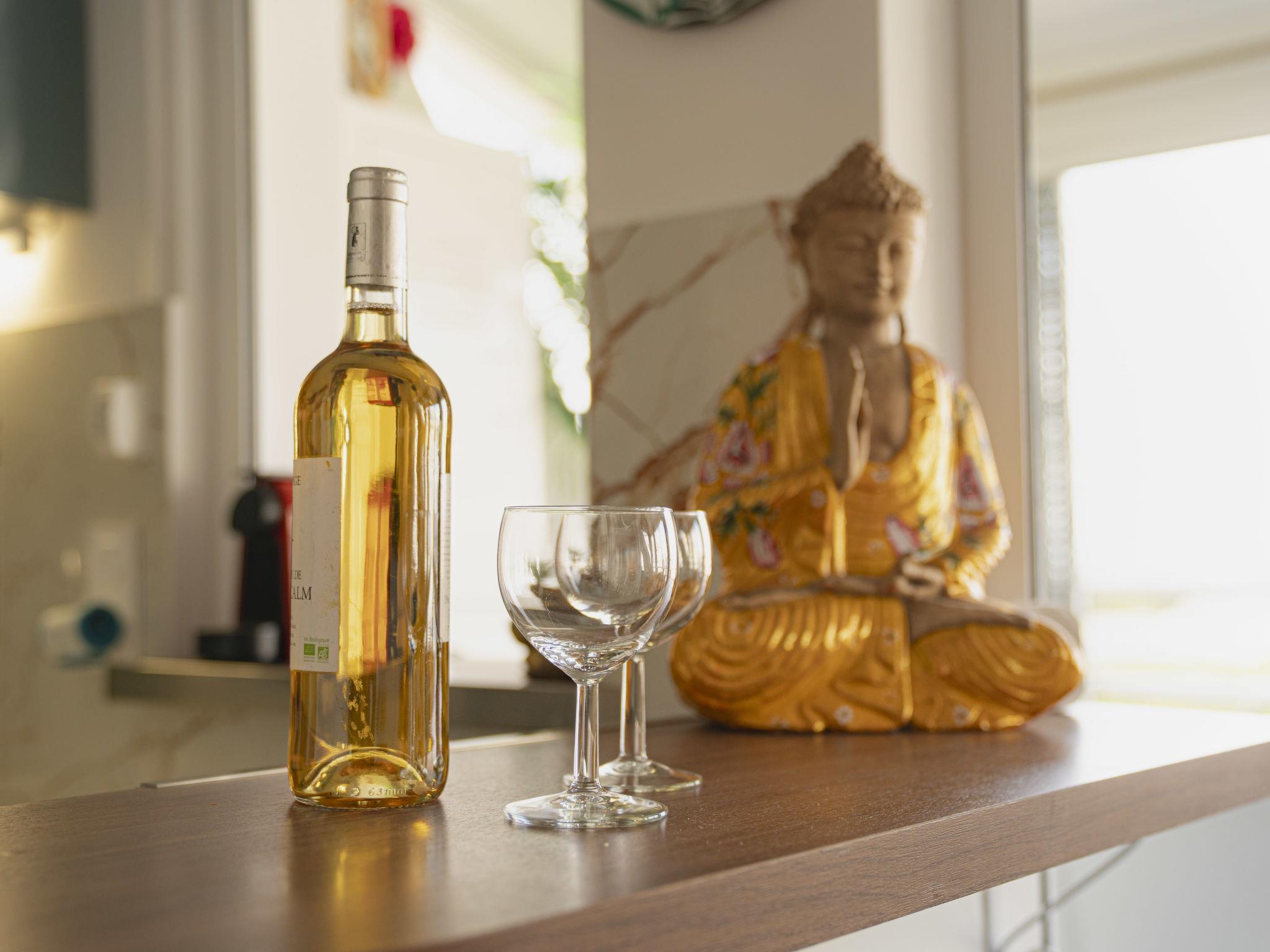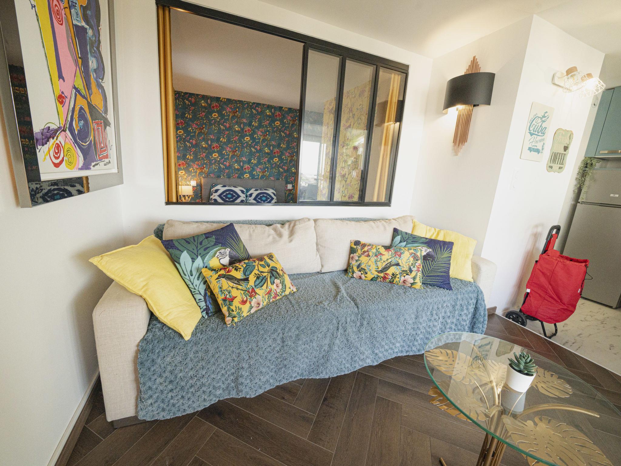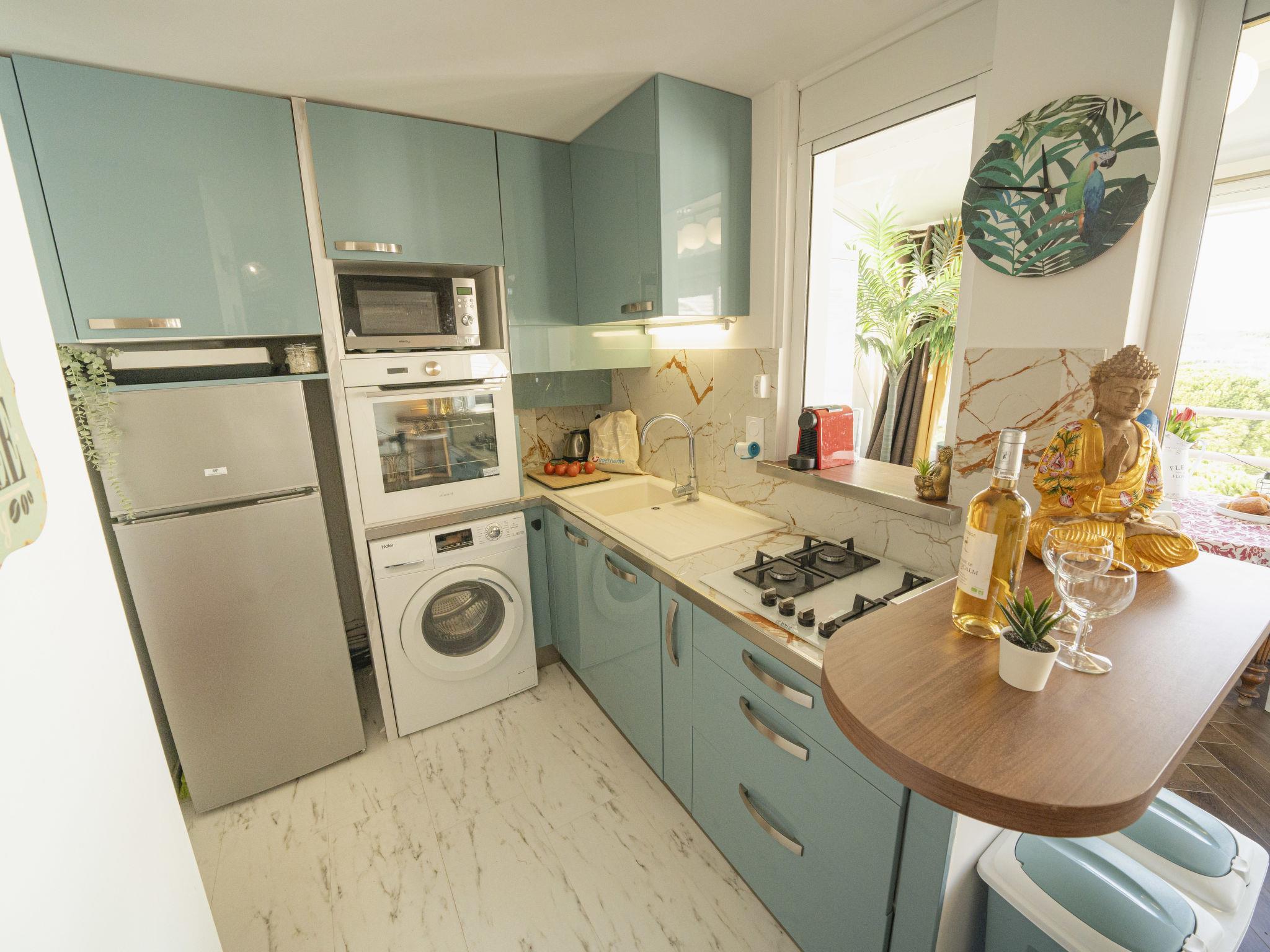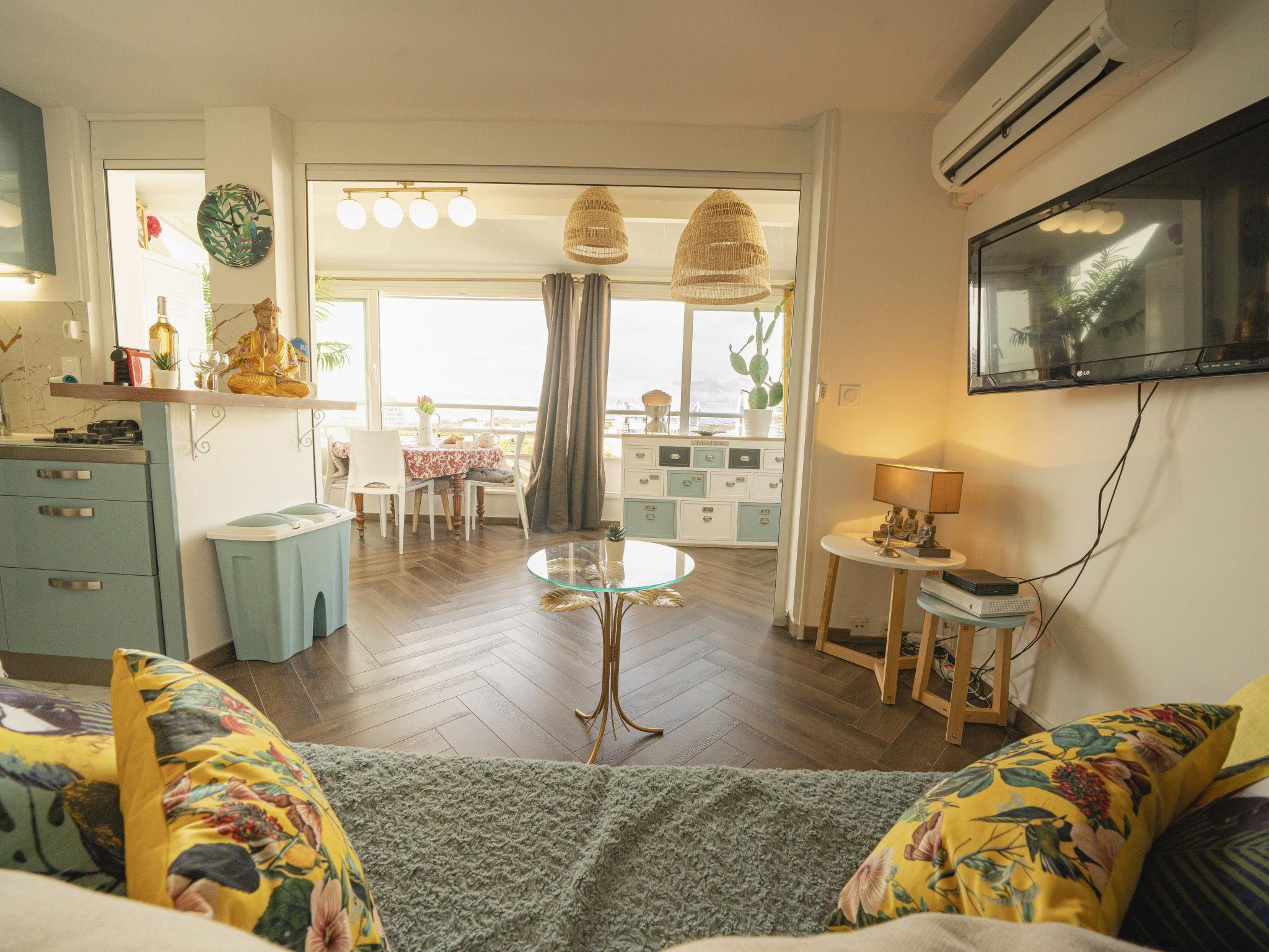 2-room apartment 45 m2 on 7th floor. Beautiful furnishings: living/dining room with TV (flat screen). 1 room, south facing position, window onto the living room with 1 french bed (1 x 140 cm, length 190 cm). Interconnecting room with 1 double sofabed (120 cm, length 190 cm). Kitchenette (oven, dishwasher, 4 gas rings, toaster, kettle, microwave, freezer, electric coffee machine, Capsules for coffee machine (NESPRESSO) extra). Shower, sep. WC. Air-conditioning, forced-air heating. Panoramic view of the sea. Facilities: washing machine. Internet (WiFi, free). Parking. Please note: smoke alarm. Offer by a private individual according to Art. 155, IV of CGI. 1630810061062