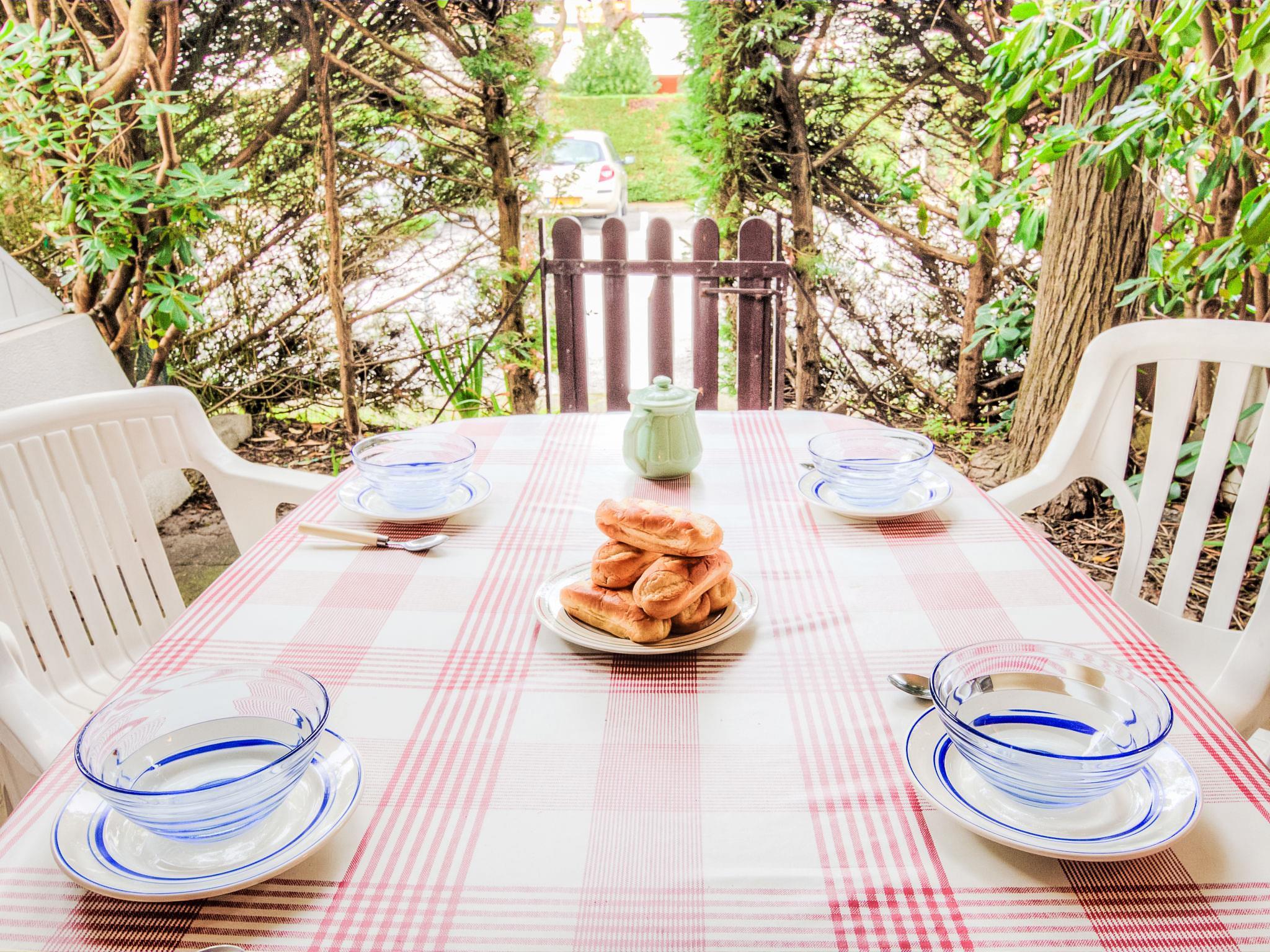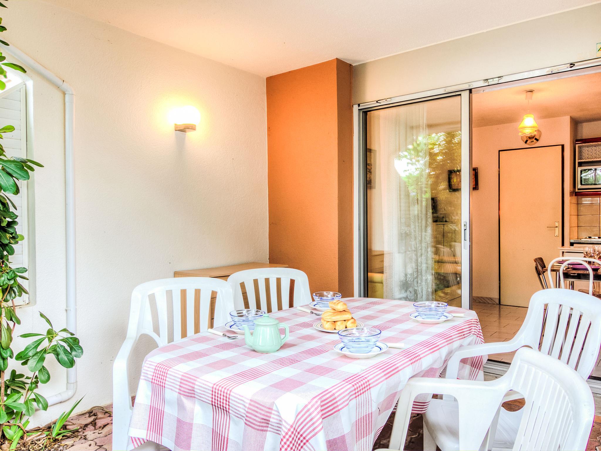 1-room studio 20 m2, on the ground floor. Living/dining room with 1 double sofabed (2 x 80 cm, length 190 cm), TV (flat screen). Entrance hall with 1 x 2 bunk beds (90 cm, length 190 cm). Kitchenette (2 hot plates, toaster, kettle, microwave, electric coffee machine). Bath/WC. Terrace 12 m2. Terrace furniture. Facilities: Internet (WiFi, extra). Parking. Please note: apartment carpark side. Smoke alarm.