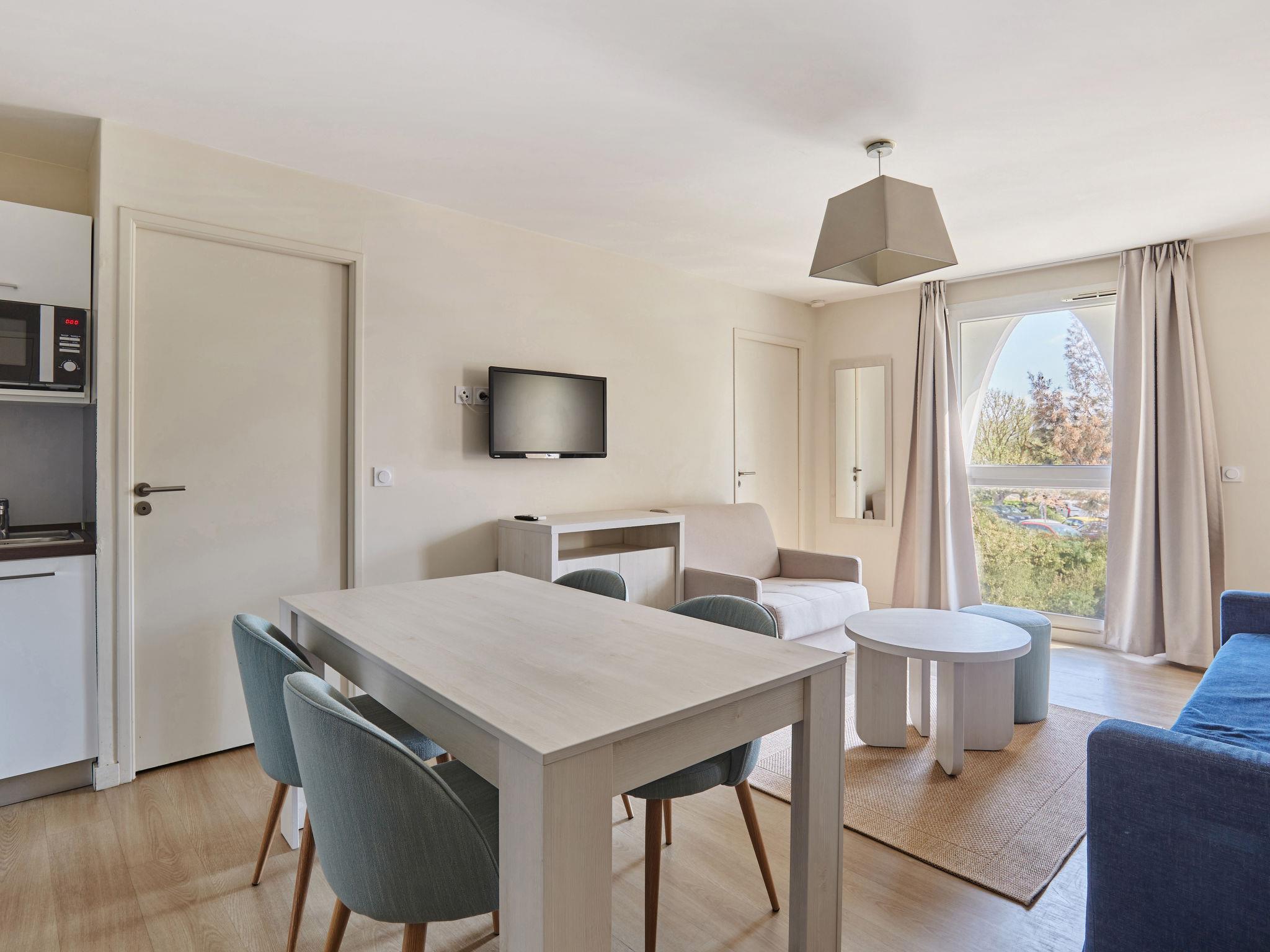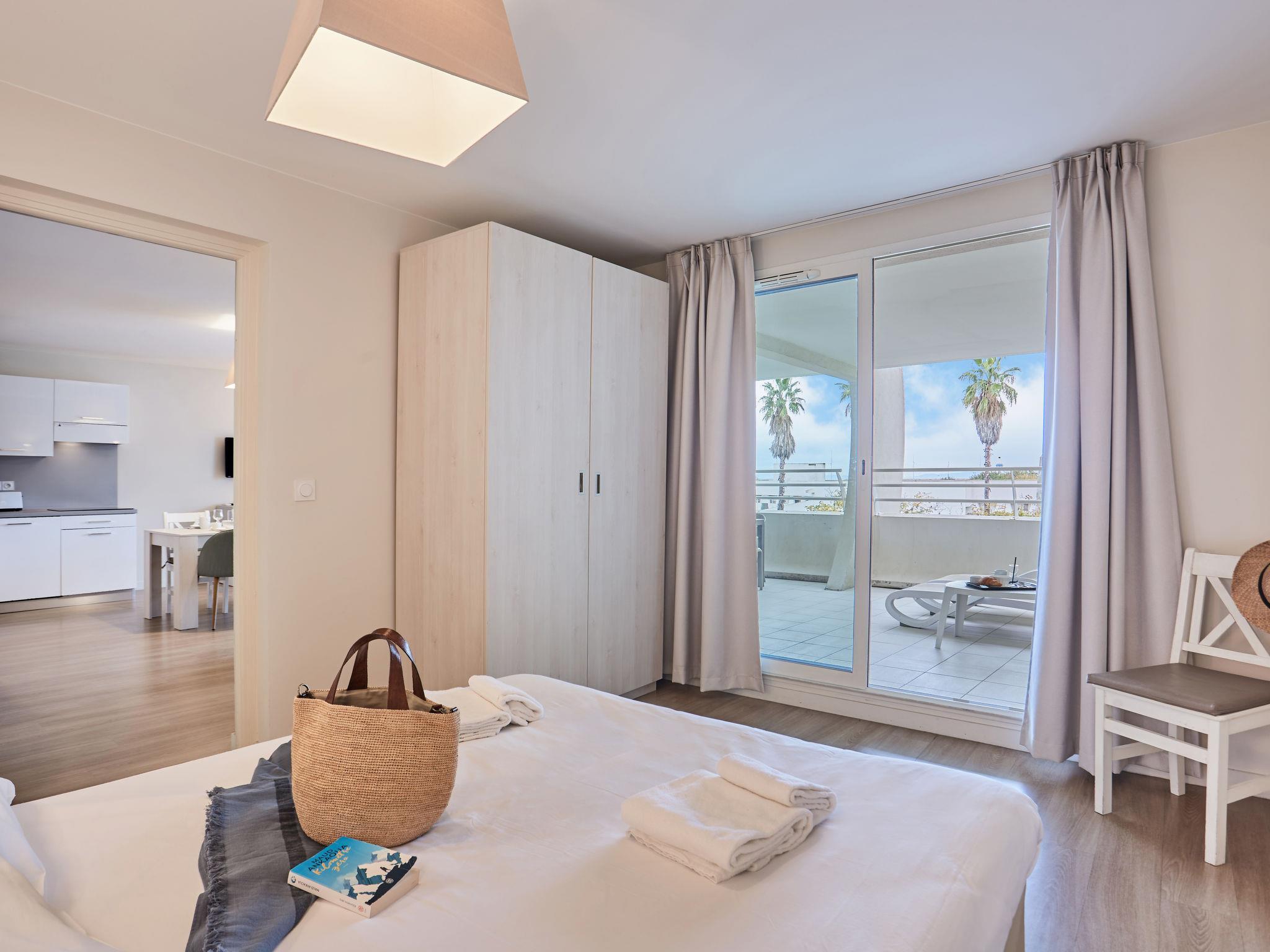 "Odalys Référence Les Dunes du Soleil", 3-room apartment 62 m2. Comfortable furnishings: living/sleeping room with 1 double sofabed, 1 sleeping facility, dining table, TV and air conditioning. Exit to the balcony, to the terrace. 1 room with 1 french bed (160 cm), shower/WC. 1 room, without window with 1 x 2 bunk beds. Small, open kitchen (dishwasher, 4 ceramic glass hob hotplates, kettle, microwave, electric coffee machine). Shower, sep. WC. Electric heating. Balcony. Balcony furniture. Facilities: children's high chair, baby cot, hair dryer. Internet (WiFi, free). Please note: non-smokers only. Maximum 1 pet/ dog allowed. Smoke alarm, fire extinguisher.