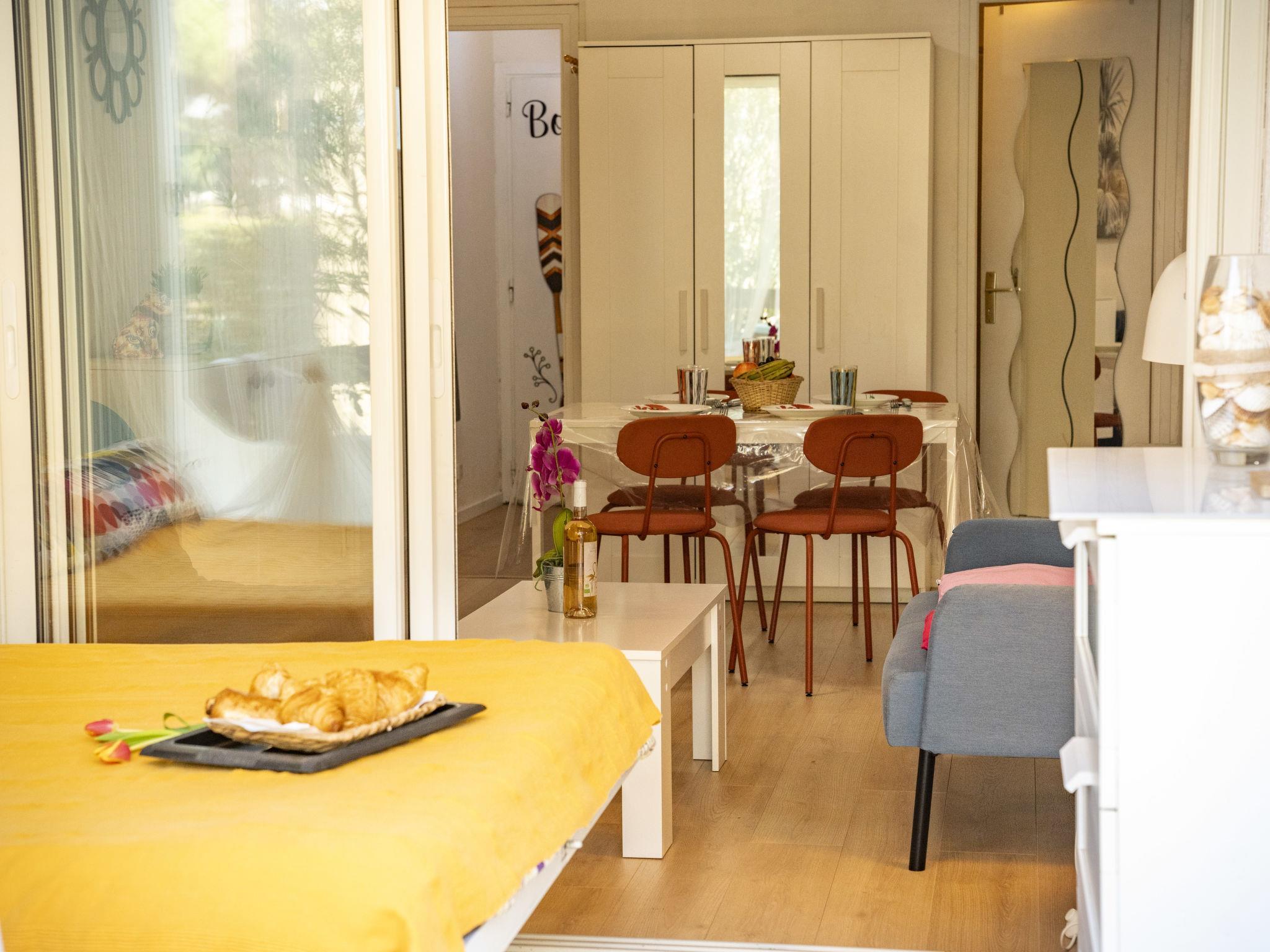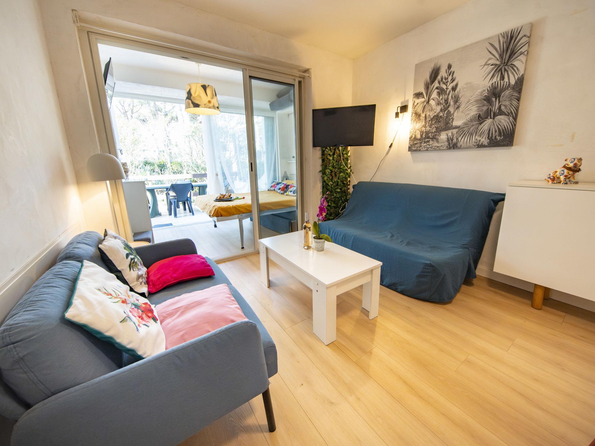 1-room studio 27 m2, on the ground floor. Beautiful furnishings: living/dining room with 1 double sofabed (140 cm, length 190 cm), TV (flat screen), heating stove, electric heating and fan. Small alcove, window onto the living room, window onto the courtyard with 1 double bed (140 cm, length 190 cm), TV (flat screen), fan. Kitchenette (2 induction hot plates, toaster, kettle, microwave, electric coffee machine). Shower/WC. Electric heating. Terrace 20 m2, south facing position. Terrace furniture, covered balcony. View of the garden. Facilities: Internet (WiFi, extra). Parking space n 110. Please note: smoke alarm. Offer by a private individual according to Art. 155, IV of CGI. 1282815224313