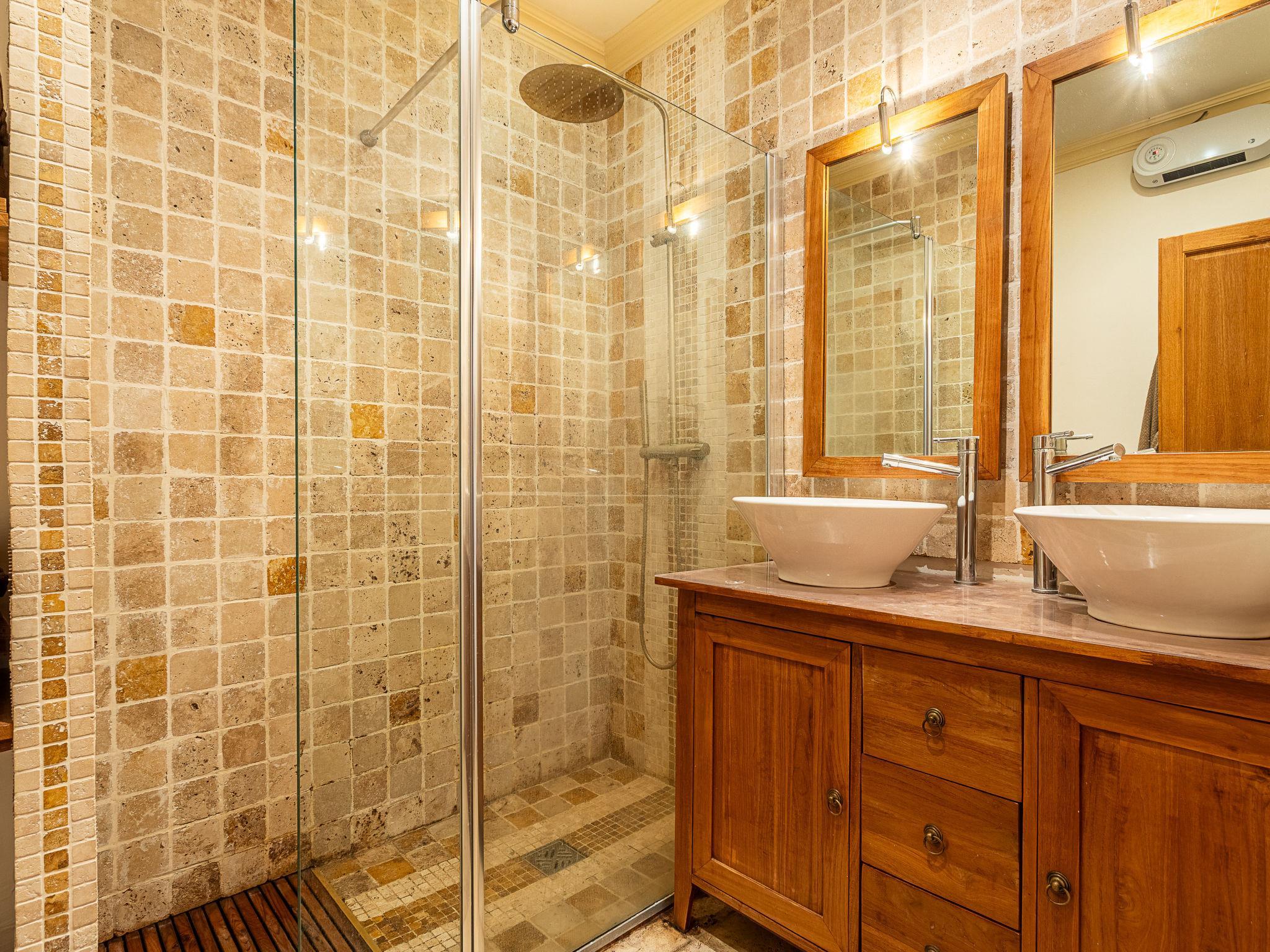 6-room villa 100 m2. Spacious and bright, beautiful furnishings: living/dining room with dining table and TV (flat screen). Exit to the terrace, to the swimming pool. Lounge with panoramic window with library. Exit to the terrace. 1 room with 1 double bed (2 x 90 cm, length 200 cm). 1 room with 1 french bed (160 cm, length 200 cm). Exit to the balcony. 1 room with 1 french bed (140 cm, length 190 cm). Exit to the terrace. 1 room with 2 x 2 bunk beds (90 cm, length 190 cm). Exit to the terrace. Kitchenette (oven, dishwasher, 4 ceramic glass hob hotplates, toaster, kettle, microwave, electric coffee machine). Bath/WC, shower, sep. WC, double hand-basin. Electric heating, air-conditioning. Natural stone floors. Large terrace, south facing position, large terrace, north facing position. Terrace furniture, deck chairs. View of the swimming pool. Facilities: washing machine, dryer, hair dryer. Internet (WiFi, free). Please note: suitable for families. Non-smokers only. 1 small pet/ dog allowed. TV only FR. Smoke alarm. Offer by a private individual according to Art. 155, IV of CGI. 83071000757AO
