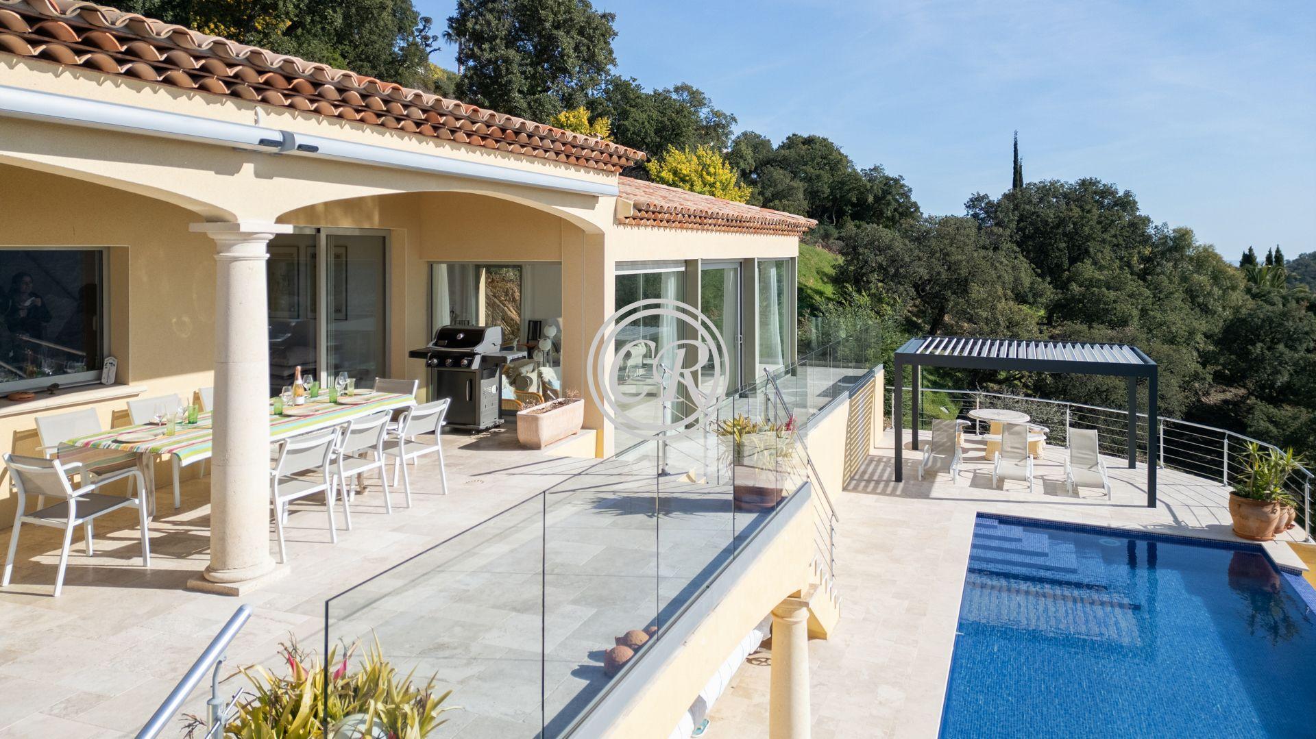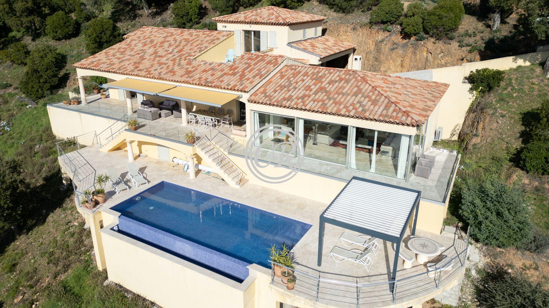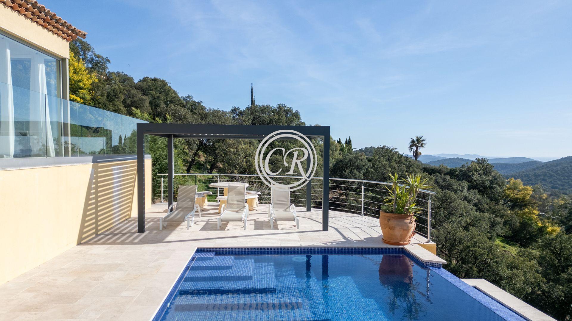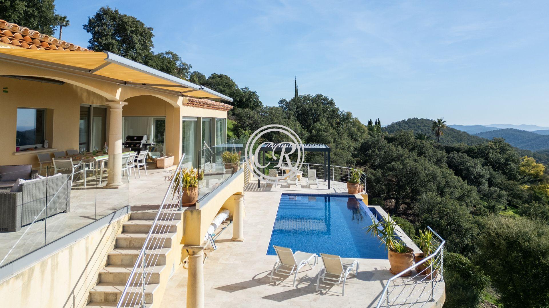 This superb villa on the Domaine de Val Cros in La Londe les Maures boasts panoramic sea views, an 80 m² living room decorated in contemporary style with bay windows offering breathtaking views, and a spacious, well-equipped kitchen.