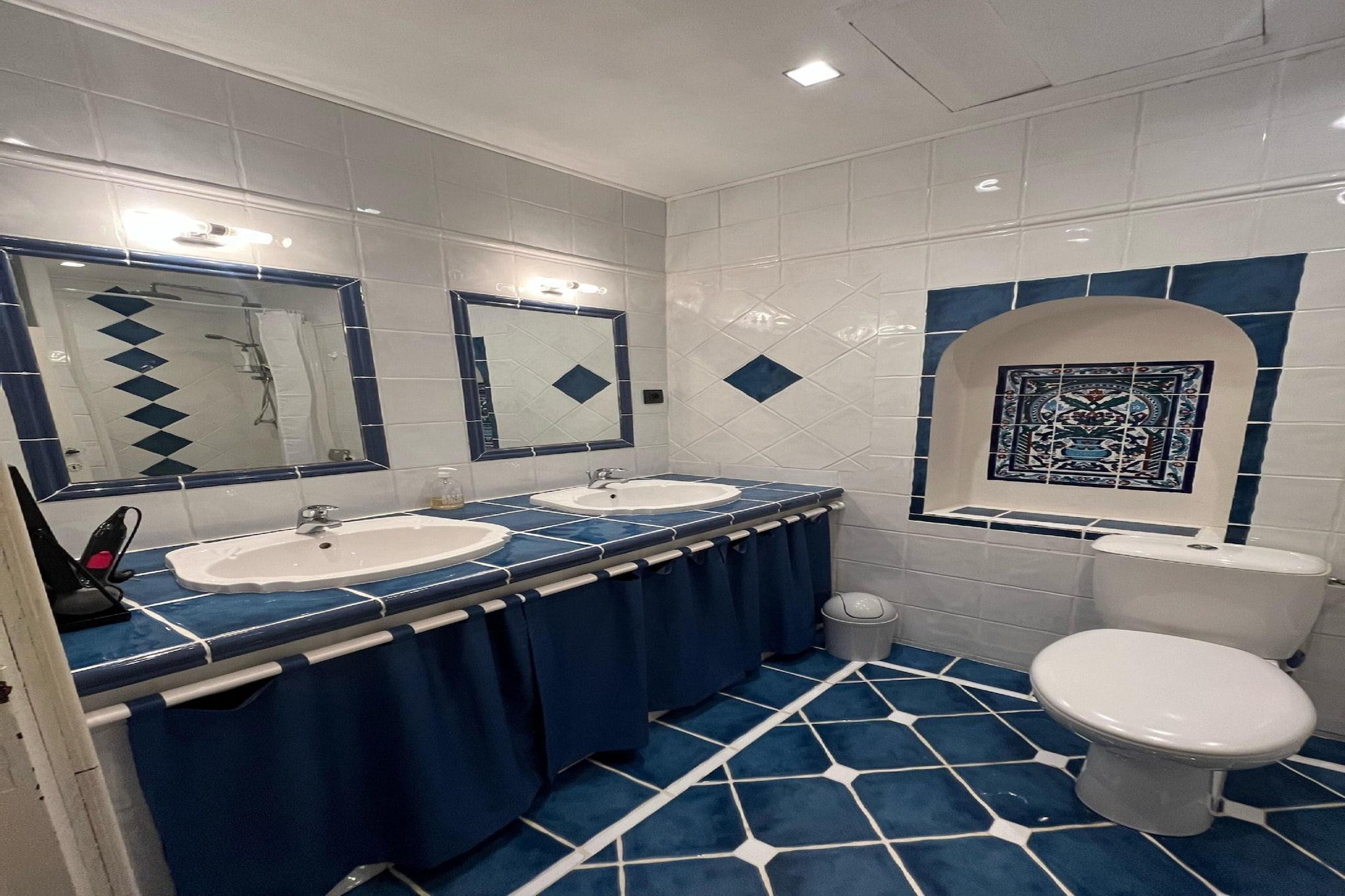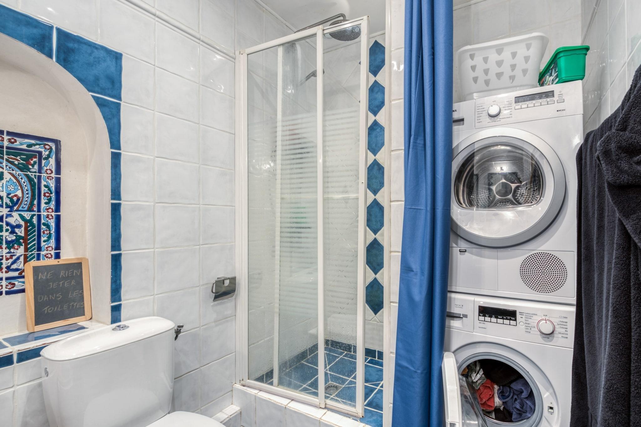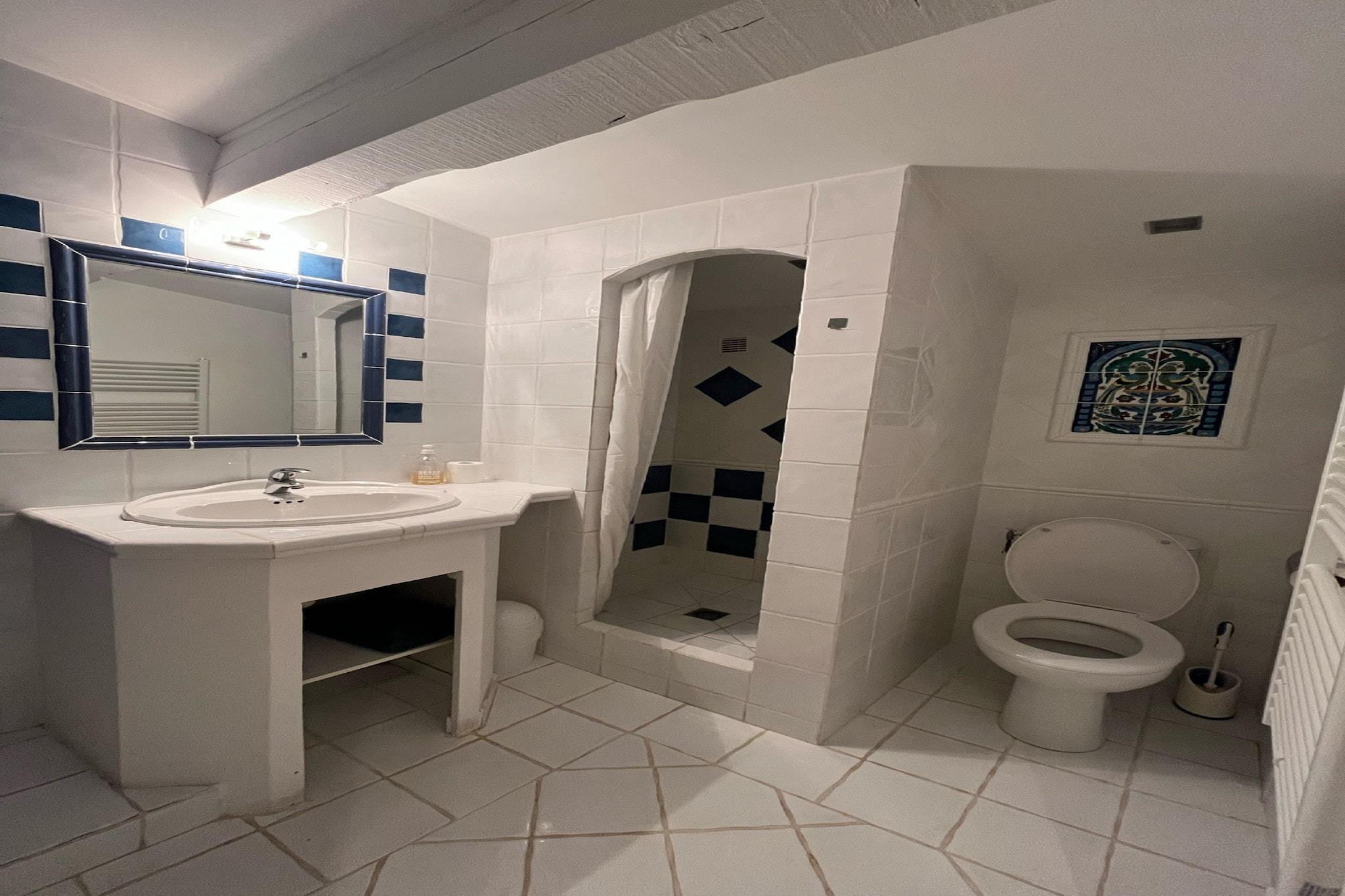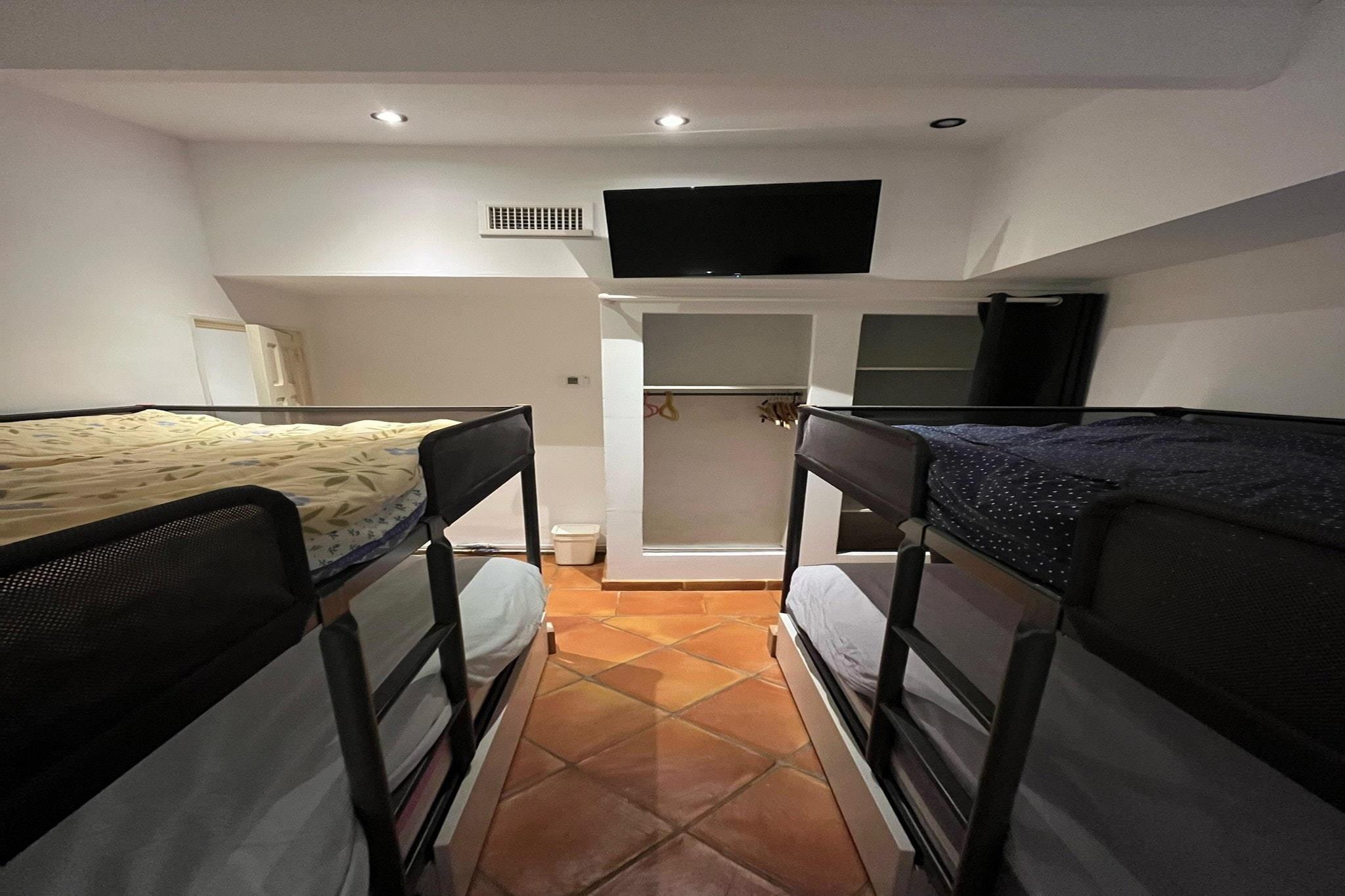 Ground floor: (hallway, Kitchen(hob(3 ring stoves, electric), electric kettle, coffee machine(cups), oven, microwave, dishwasher, fridge-freezer), Living/diningroom(TV, dining table, seating area), bedroom(bunk bed, bunk bed, TV), bedroom(double bed(150 x 200 cm), TV), Bedroom with bathroom(double bed(180 x 200 cm), TV, bath tub, washbasin, toilet, hairdryer), Bedroom with bathroom(bunk bed, TV, shower, washbasin, toilet), bathroom(tumble dryer, shower, 2x washbasin, toilet, washing machine)) terrace, garden, garden furniture, sun loungers, parking, parasol, swimming pool(private, cover, 9 x 5 m.), boules court, table tennis table, lounge set, plancha grill