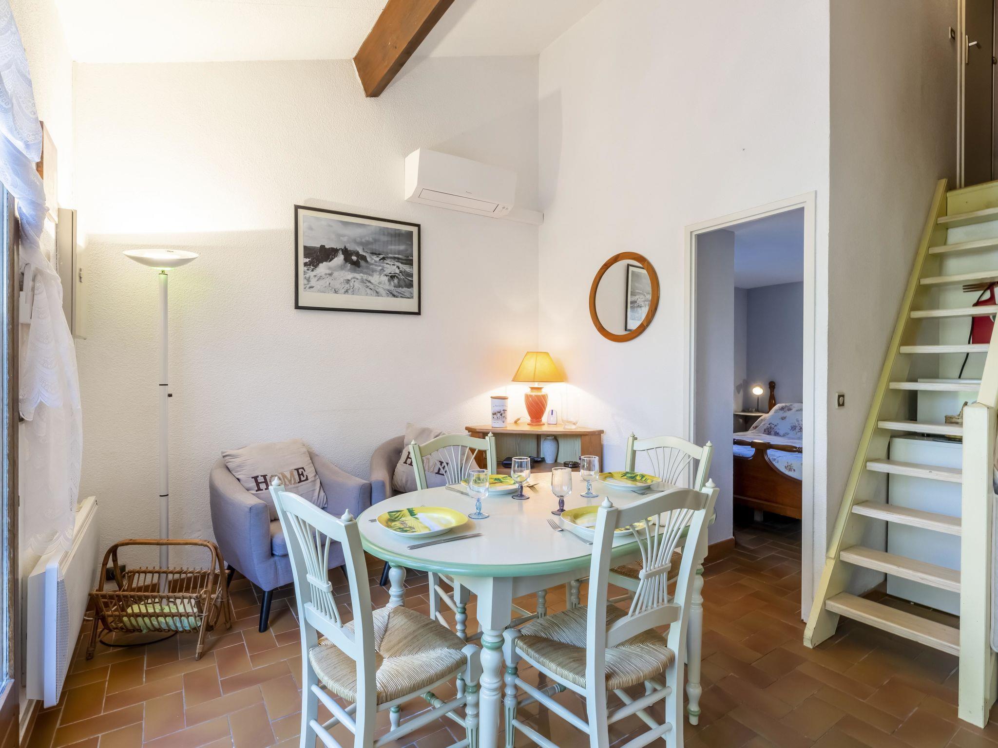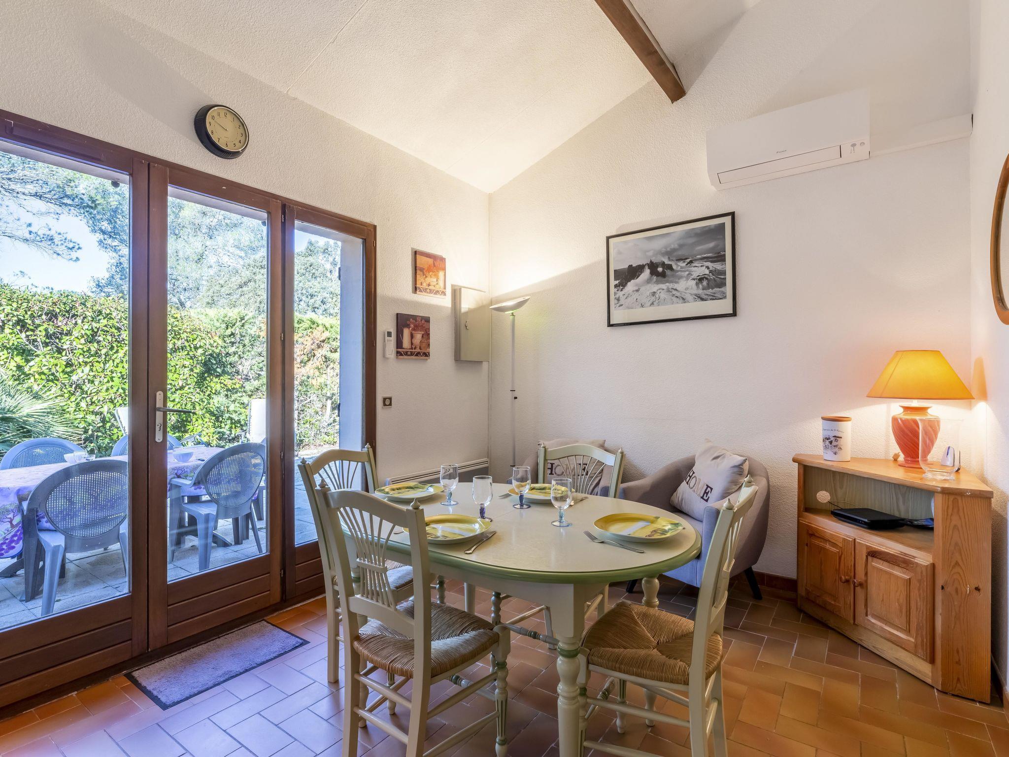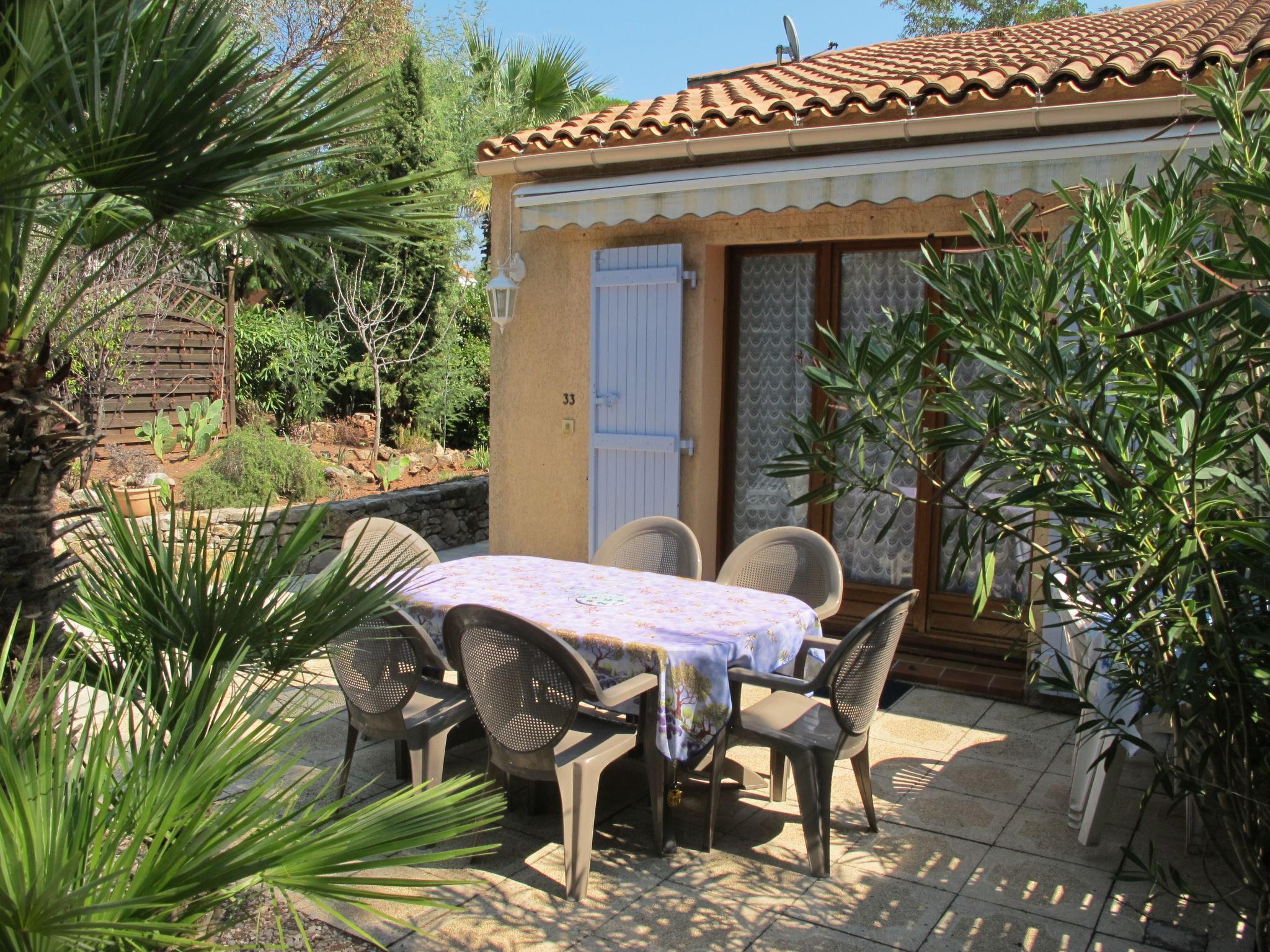 "Le Clos d'Azur 1", 3-room terraced house 35 m2 on 2 levels. Practical furnishings: small living/dining room with dining table, TV and air conditioning. Exit to the terrace. 1 small room with 1 french bed (140 cm, length 190 cm). Open kitchen (oven, 4 ceramic glass hob hotplates, toaster, kettle, microwave, freezer, electric coffee machine). Shower/WC. Upper floor: (steep stair) open gallery with sloping ceilings with 1 bed (90 cm, length 190 cm). 1 small room with 1 french bed (140 cm, length 190 cm), air conditioning. Electric heating. Terrace 15 m2. Terrace furniture, electric barbecue, deck chairs (2). Beautiful view of the forest. Facilities: washing machine, iron. Internet (WiFi, free). Parking (1 car) at 60 m. Please note: non-smoking house. Smoke alarm. Instead of an enclosed bedroom, some sleeping areas are located in an open-plan area (gallery, alcove, etc.).