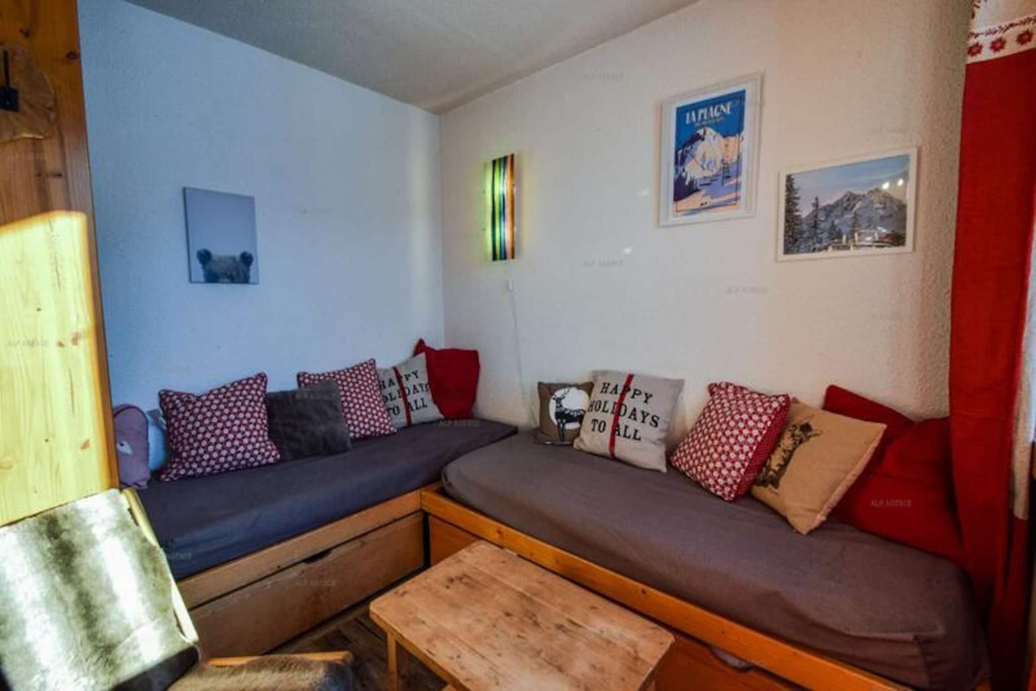 Bask in the serene beauty of the French Alps at this charming studio in the Les Gentianes Residence, located in the picturesque Plagne Villages. With its south-west facing balcony offering stunning views of the snow-covered slopes, this cozy retreat is the perfect escape for a couple or a small group of up to four people. Whether you're here to ski, relax, or simply enjoy the mountain air, this studio provides an inviting base for your alpine adventures. \n\nThe 22m² studio is thoughtfully designed to maximize comfort and functionality. The living area features two sofa beds and two trundle beds, ensuring flexible sleeping arrangements for guests. A well-equipped kitchenette includes ceramic hobs, an oven, a microwave, and a refrigerator, making it easy to prepare meals after a day on the slopes. The bathroom is fitted with a shower and toilet, and additional amenities such as a washing machine and a ski locker on the ground floor add to the convenience. \n\nSituated at the foot of the slopes, this residence offers unbeatable ski-in/ski-out access, allowing you to hit the pistes as soon as you step outside. For those looking to explore the area, Plagne Villages is connected to Plagne Centre by the TELEBUS, a pedestrian or ski cabin that makes getting around effortless. Shops, restaurants, and après-ski activities are just 500 meters away and easily accessible by shuttle. \n\nWhether you're drawn by the thrill of skiing, the charm of the alpine village, or the tranquility of the mountains, this studio offers a warm and welcoming haven. Create unforgettable memories in the heart of the French Alps, where every moment is framed by breathtaking landscapes and the promise of adventure.