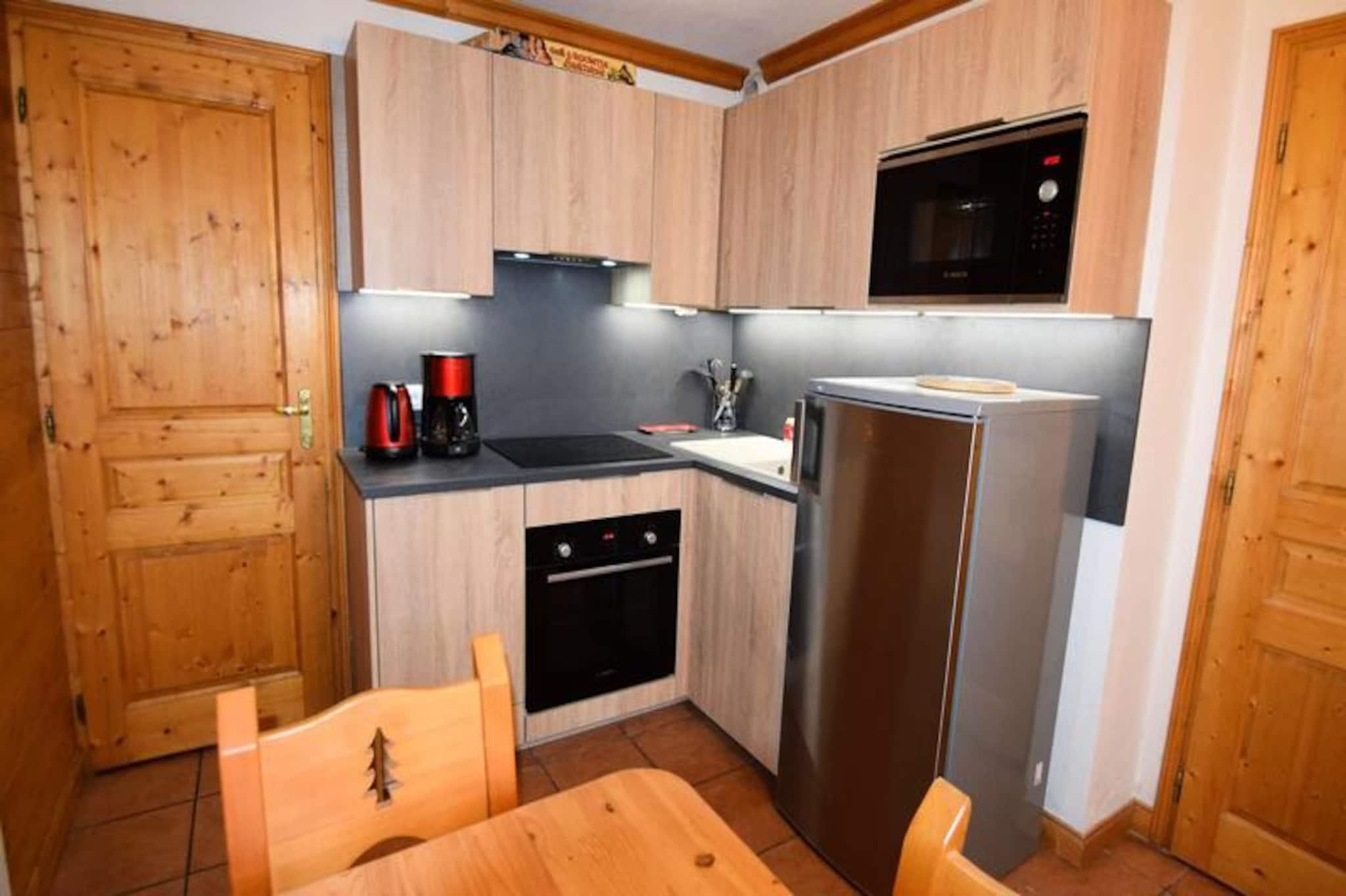 High above the picturesque slopes of Plagne Soleil, this charming alpine apartment invites you to experience the magic of the French Alps in every season. Imagine waking up to breathtaking views of the resort and surrounding peaks from your west-facing balcony, where the crisp mountain air sets the tone for a day of adventure. Whether you’re here for winter’s snow-covered pistes or summer’s sunlit trails, this cozy retreat offers the perfect blend of comfort and convenience. \n\nDesigned to accommodate up to six guests, the apartment features a well-equipped kitchen with ceramic hobs, a microwave, oven, refrigerator, and dishwasher, making it easy to prepare hearty meals after a day outdoors. The living area includes a dining space, lounge, television, and two bunk beds, while two inviting bedrooms offer double beds, one with an en-suite shower room. With tiled floors, ample bedding options, and modern amenities, you’ll feel right at home. Additional conveniences include a ski locker and free outdoor parking, ensuring a hassle-free stay. \n\nLocated just 50 meters from the slopes, the residence is perfectly positioned for ski enthusiasts and nature lovers alike. Nearby, you’ll find shops, a ski school, and shuttle connections to Plagne Villages and Center, making it easy to explore the wider area. In summer, the region transforms into a haven for hikers and cyclists, with trails and panoramic views that showcase the beauty of the Alps. \n\nWhether you’re seeking thrilling descents, tranquil hikes, or simply a peaceful escape surrounded by nature, this apartment in Les Lodges des Alpages is your gateway to unforgettable alpine memories.