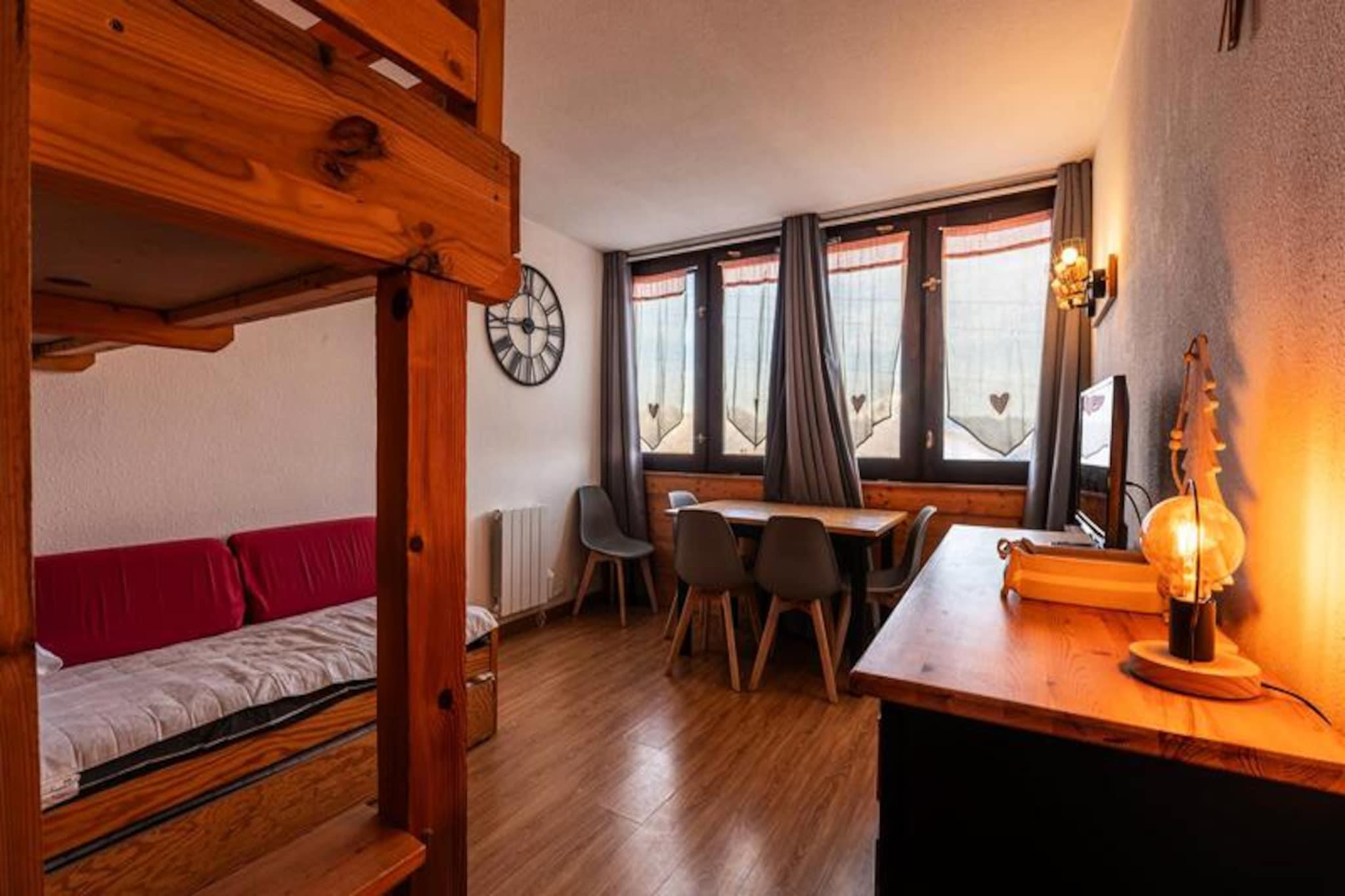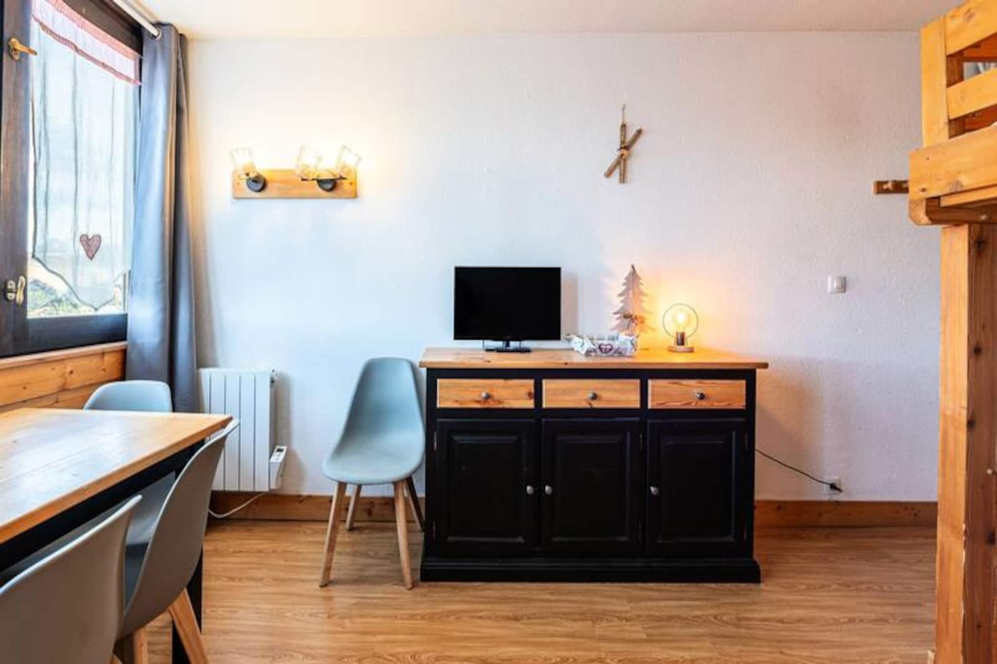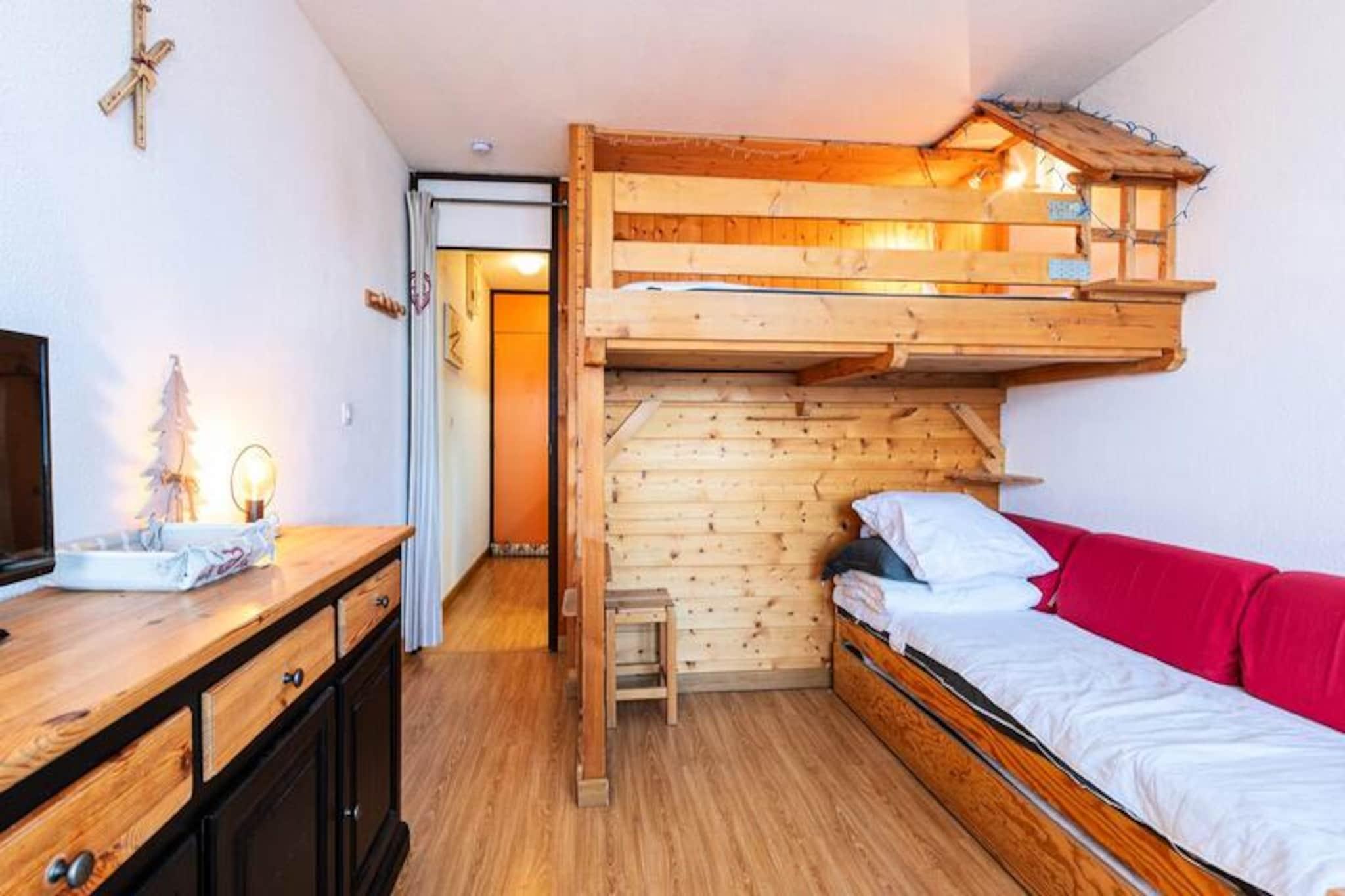 High above the Tarentaise Valley, where the majestic Mont Blanc dominates the horizon, this charming studio offers a cozy alpine retreat in the iconic Paquebot des Neiges residence at La Plagne Aime 2000. Imagine waking up to breathtaking views of snow-capped peaks and the serene valley below, with the convenience of ski-in/ski-out access just steps away. Designed for families and couples seeking both adventure and relaxation, this property combines modern comforts with the timeless beauty of the French Alps. \n\nThe studio, thoughtfully decorated with mountain-inspired touches, accommodates up to four guests. The living area features a pull-out sofa bed and mezzanine sleeping space, creating a warm and practical environment for restful nights. A fully equipped kitchen awaits culinary enthusiasts, complete with electric hobs, a combination oven/microwave, and even a raclette grill for authentic alpine dining experiences. Large windows flood the space with natural light, framing the stunning scenery outside. Additional amenities include a ski locker for effortless slope access and free above-ground parking nearby. \n\nStep outside and immerse yourself in the vibrant atmosphere of La Plagne Aime 2000. The residence boasts an indoor shopping gallery, ensuring that everything from groceries to ski rentals is within easy reach. For a change of pace, Plagne Centre is just minutes away via a free cable car ride, offering even more dining, shopping, and entertainment options. Whether you're skiing down pristine slopes, exploring mountain trails in summer, or simply soaking in the panoramic views, this location caters to every season and every traveler. \n\nChoose this delightful studio for your next alpine getaway and create unforgettable memories surrounded by the grandeur of Mont Blanc and the welcoming charm of La Plagne.