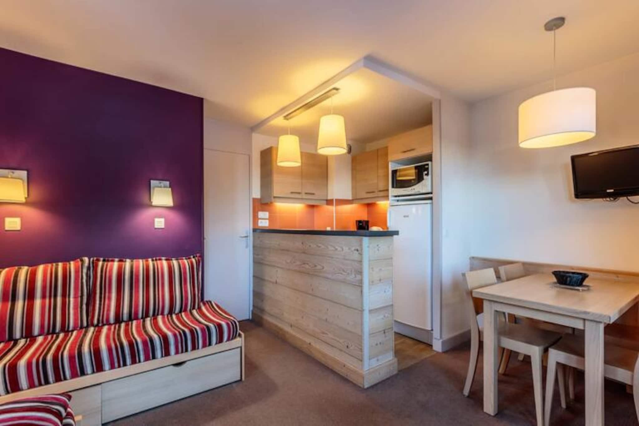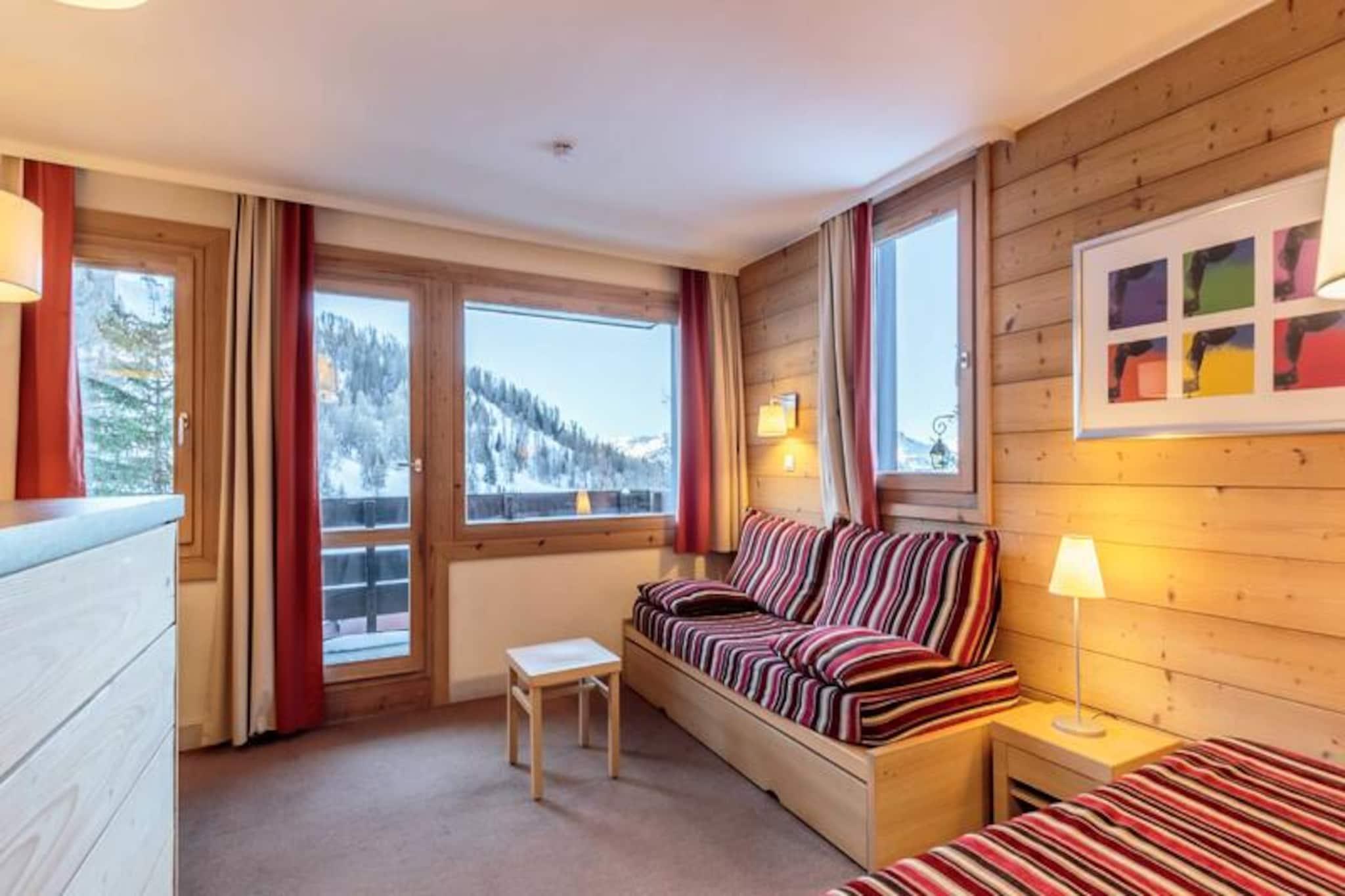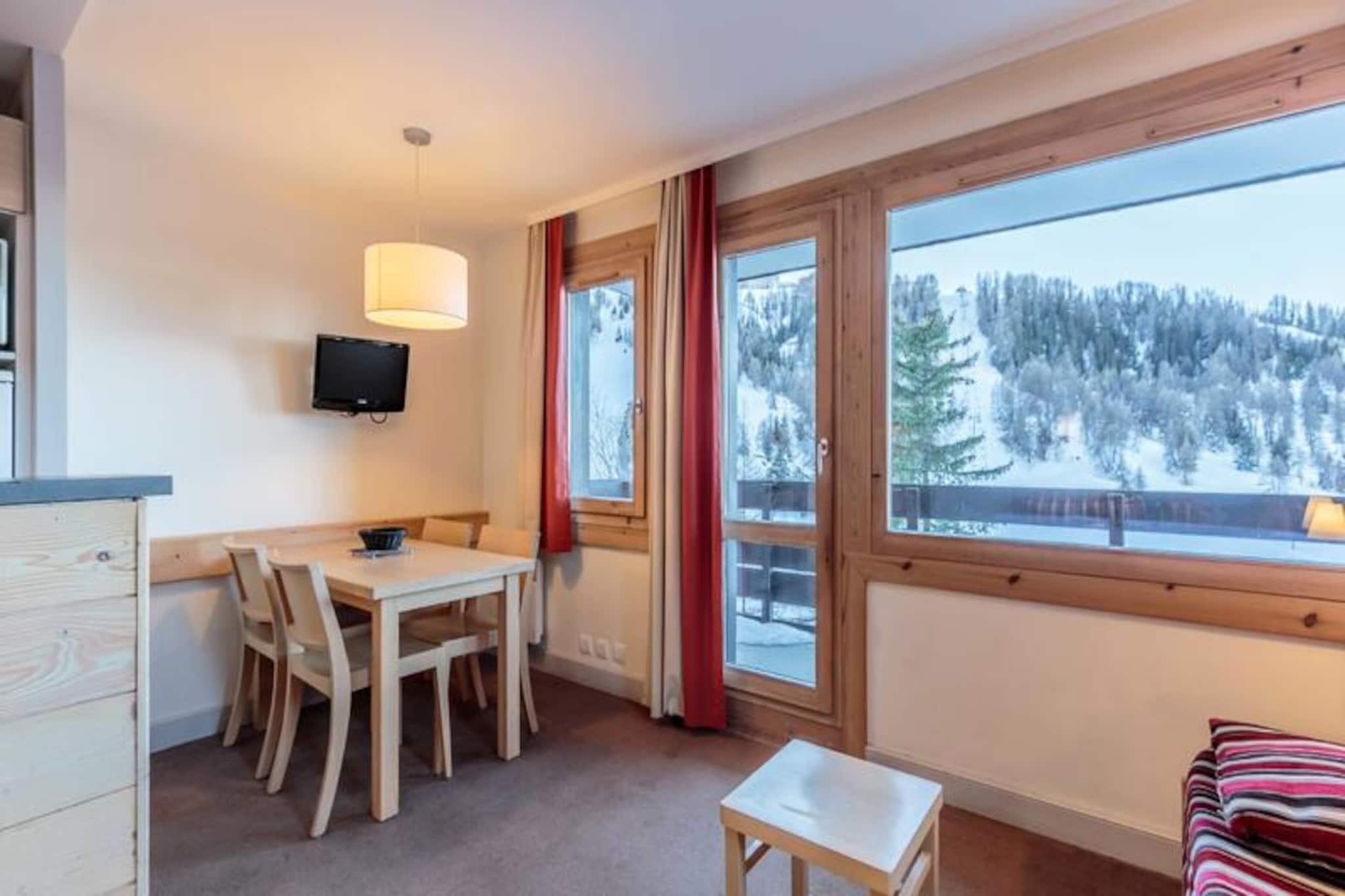 Bask in the golden glow of the French Alps from this charming 30m² apartment, perfectly situated on the first floor of a cozy residence in the heart of the forest. With a west-facing balcony, you’ll be treated to uninterrupted mountain views and abundant sunshine, creating the perfect backdrop for your alpine escape. Whether you're seeking adventure or tranquility, this property offers a warm and inviting retreat for couples or small families. Inside, the apartment is thoughtfully designed to maximize comfort and functionality. The bright living room features a seating area with two trundle beds and a sofa bed, ideal for relaxing after a day on the slopes. A fully equipped open kitchen invites you to prepare delicious meals with ease, complete with a microwave, ceramic hob, coffee maker, and more. The separate bedroom boasts a cozy double bed, while the bathroom includes a bathtub for a soothing soak. A separate toilet adds convenience. Additional amenities include a ski locker and a covered winter parking space, ensuring a hassle-free stay. The surrounding resort is a haven for families, offering a serene atmosphere nestled amidst lush forests. Shops are conveniently located nearby, and a shuttle service connects you to Plagne Centre until late at night, making it easy to explore the area. In winter, enjoy the thrill of skiing with easy access to the slopes, while summer brings opportunities for hiking and immersing yourself in nature. Whether you’re here to carve through fresh powder or unwind under the alpine sun, this apartment provides the perfect base for unforgettable memories in the French Alps. Don’t miss the chance to experience the charm and beauty of this idyllic mountain retreat.