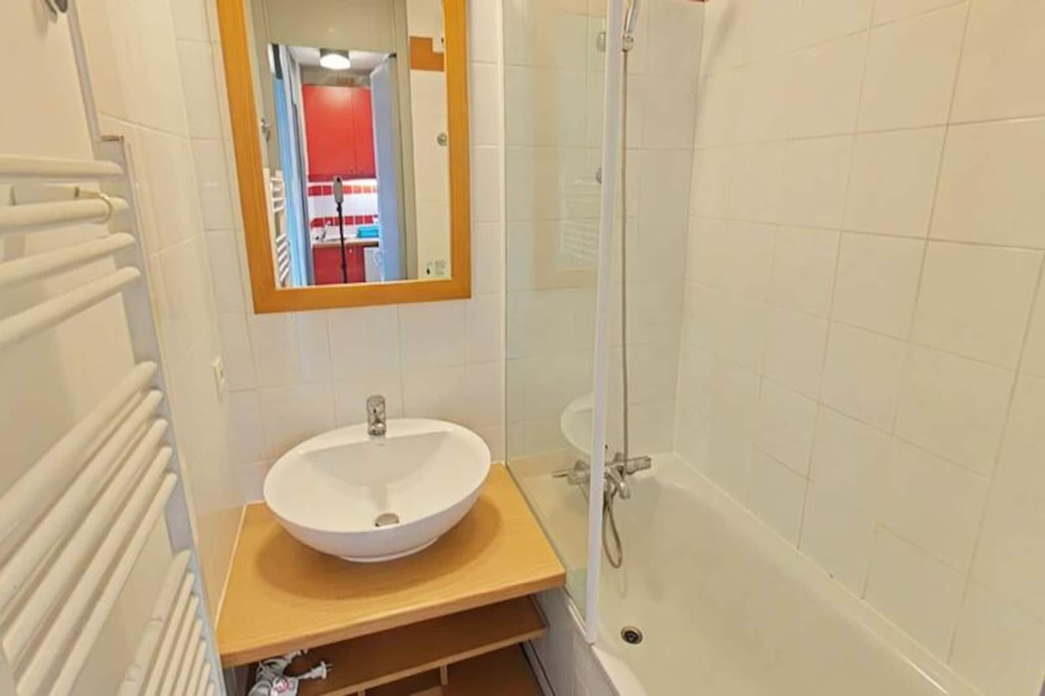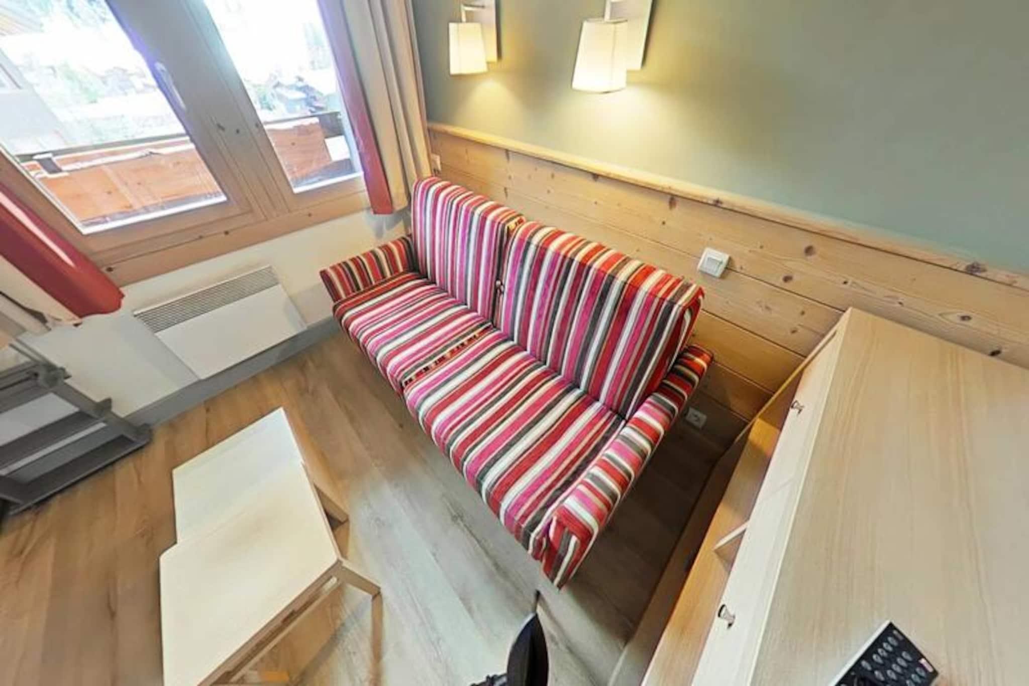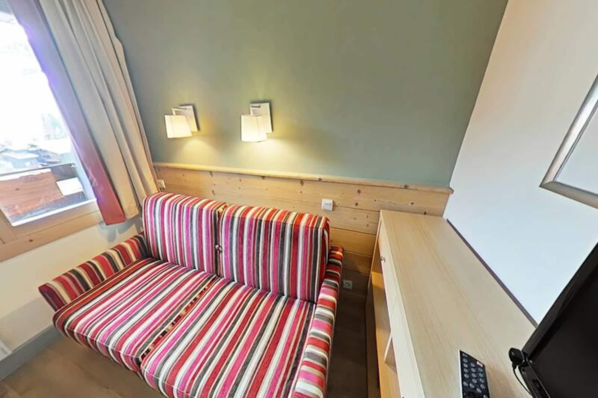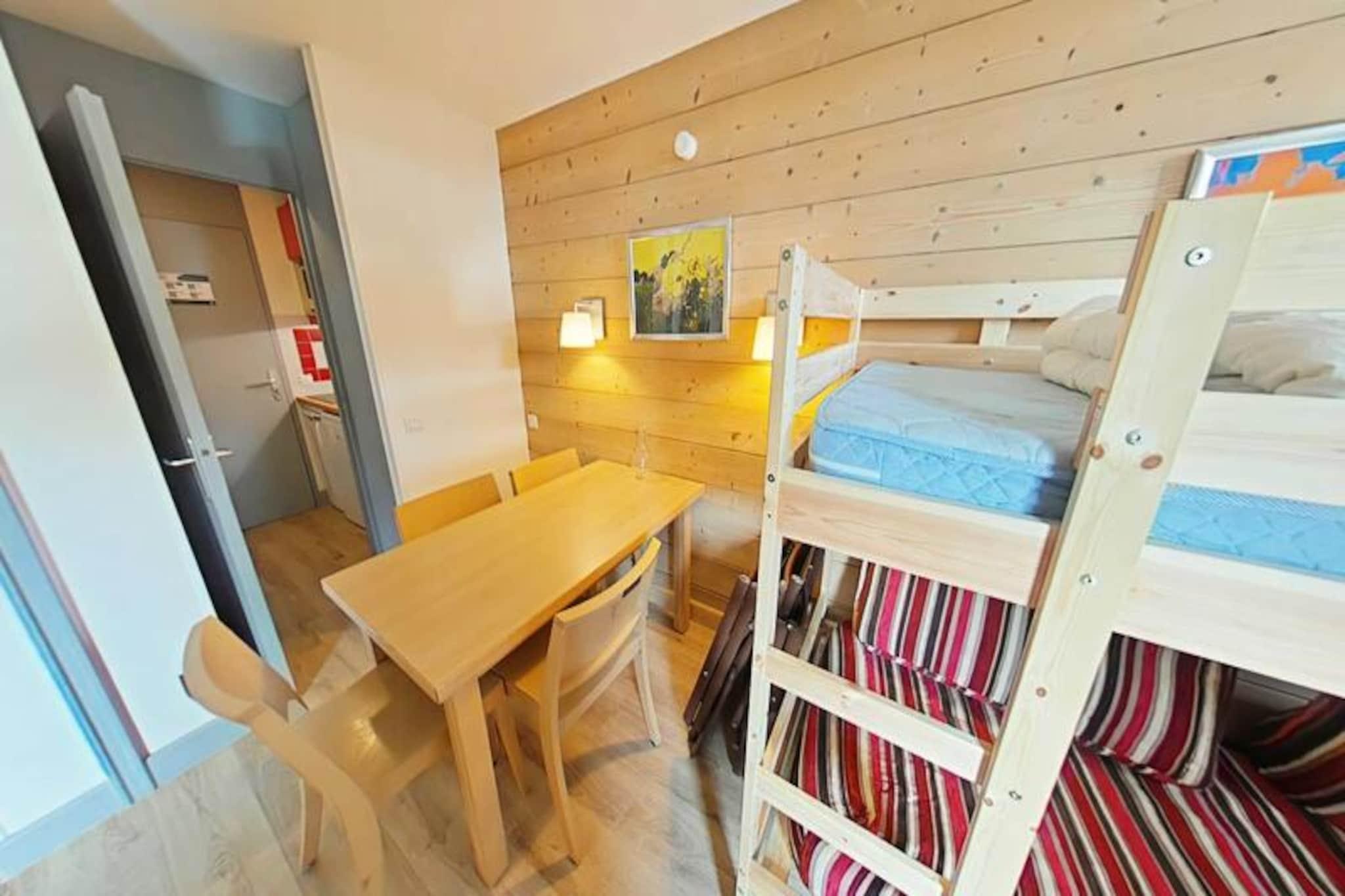 Imagine waking up to the golden rays of the sun streaming through your south-facing balcony, with panoramic views of the majestic French Alps stretching before you. This cozy 23m² apartment, located on the first floor of a charming residence in Plagne 1800, offers a serene alpine retreat perfect for couples or small families seeking both adventure and relaxation. With no elevator to distract from the peaceful ambiance, you'll feel truly immersed in the mountain atmosphere. Step inside to discover a bright and inviting living space cleverly divided by a sliding partition. The seating area features a comfortable sofa bed and television, while the sleeping nook is equipped with a bunk bed, making it ideal for up to four guests. The fully equipped kitchen includes everything you need for home-cooked meals, from a microwave to a coffee maker, while the bathroom offers a relaxing bathtub to unwind after a day on the slopes. Separate restrooms and included Wi-Fi add to the convenience. A ski locker at the entrance and a nearby covered parking space ensure hassle-free logistics for your stay. Plagne 1800 is a family-friendly resort nestled in the heart of a tranquil forest, offering a perfect blend of natural beauty and modern amenities. Shops and restaurants are just a short stroll away, and a convenient bus service connects you to Plagne Centre until late at night. Guests also enjoy access to the Plagne Lauzes wellness area, featuring a heated outdoor pool, sauna, and squash court—perfect for unwinding after a day of skiing or hiking. Whether you're here to carve through pristine slopes, explore scenic trails, or simply bask in the alpine serenity, this apartment is your gateway to unforgettable memories in the French Alps. Book your stay now and experience the magic of Plagne 1800.