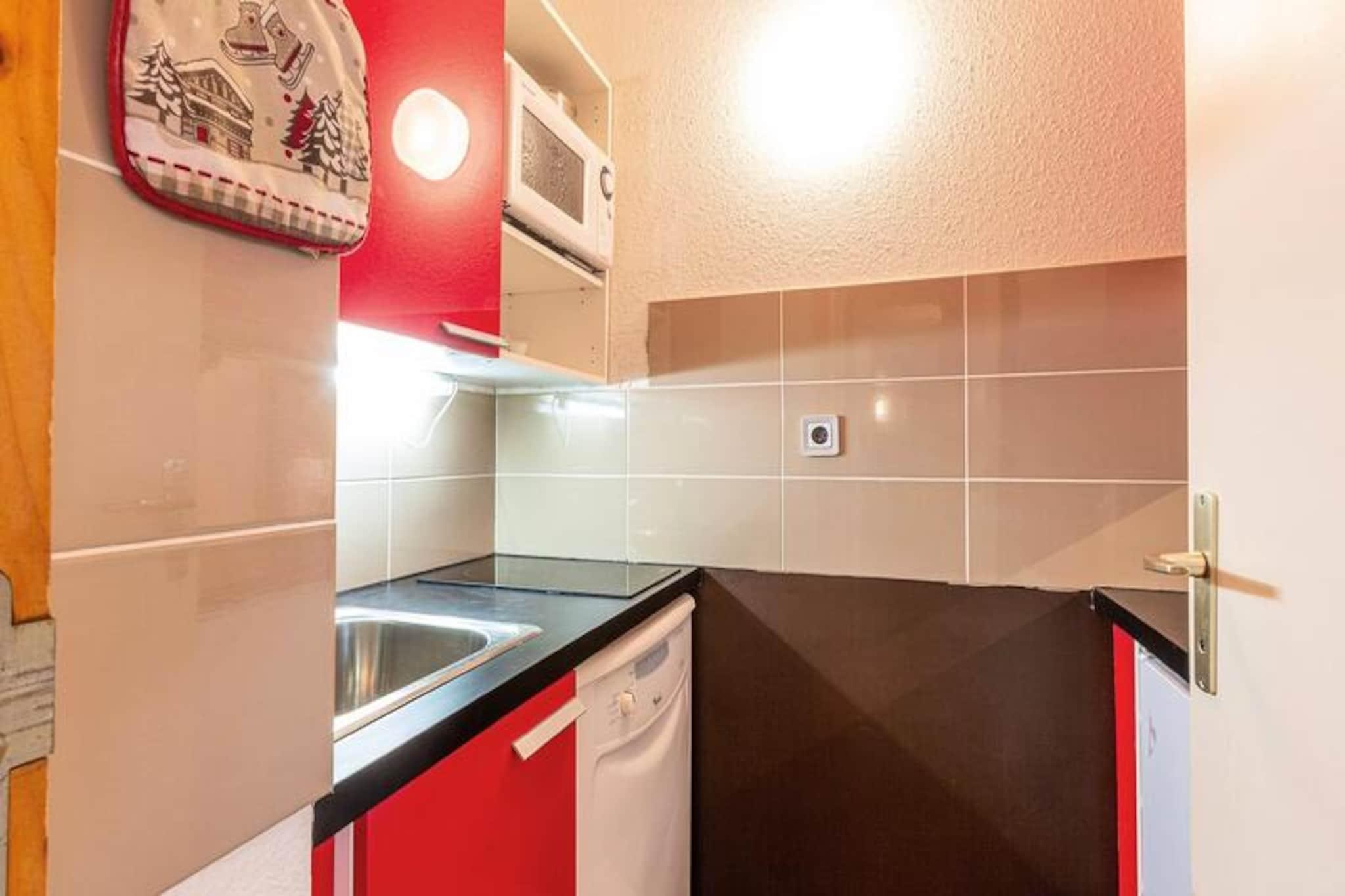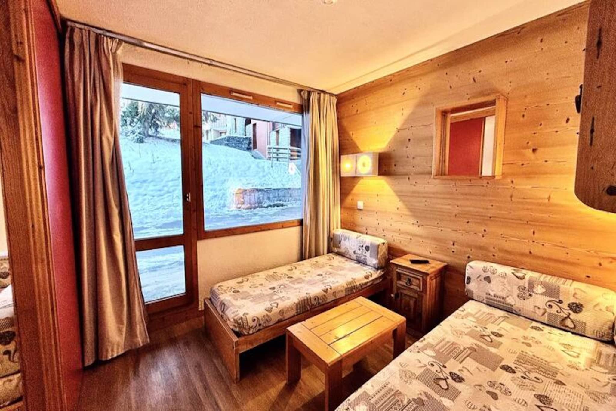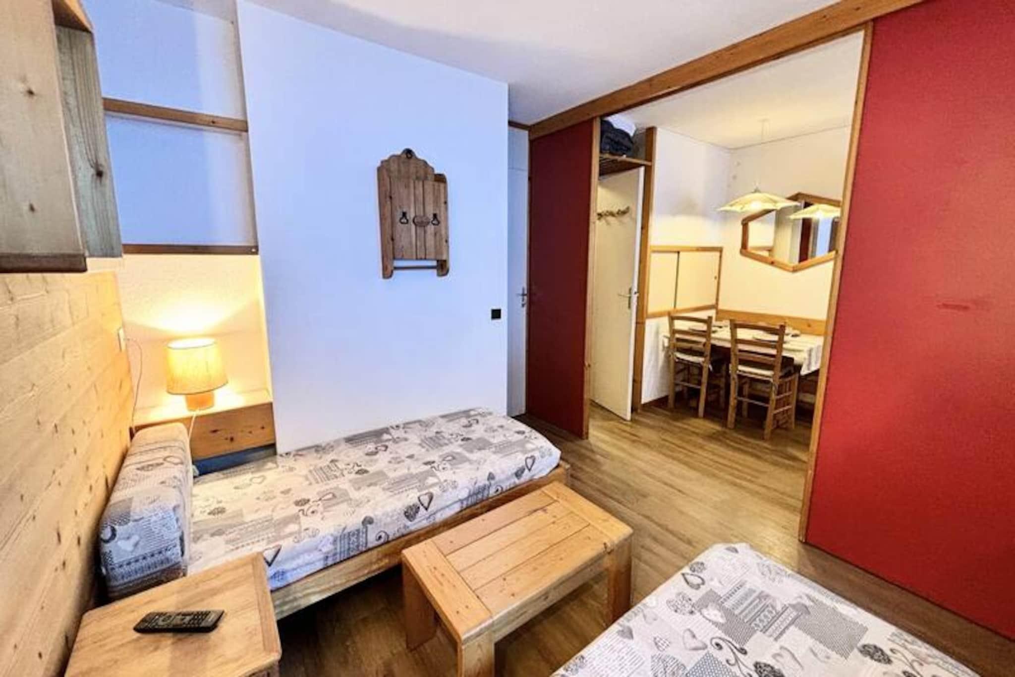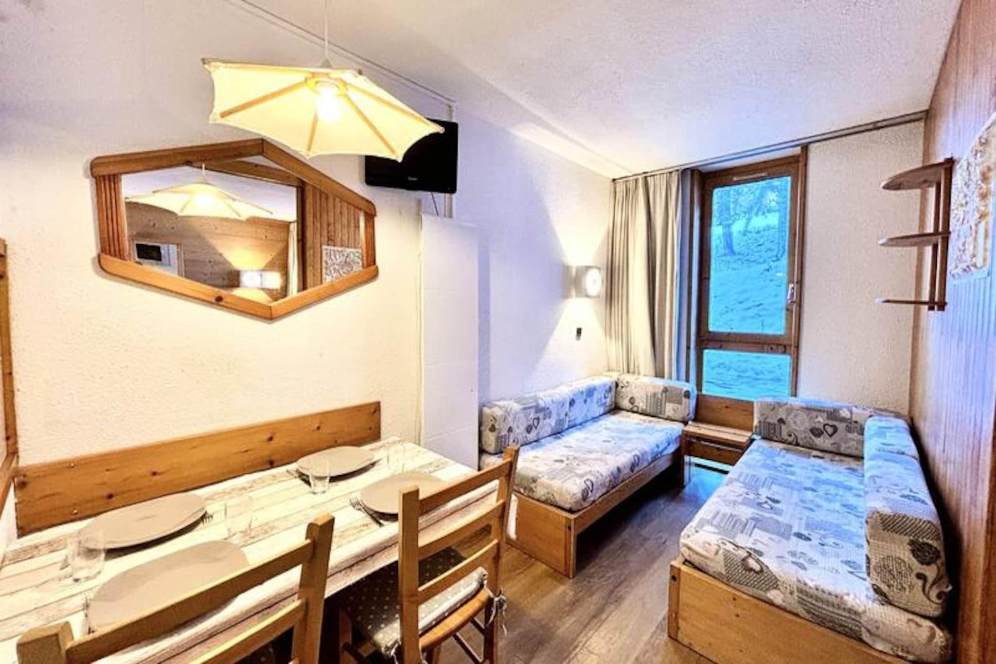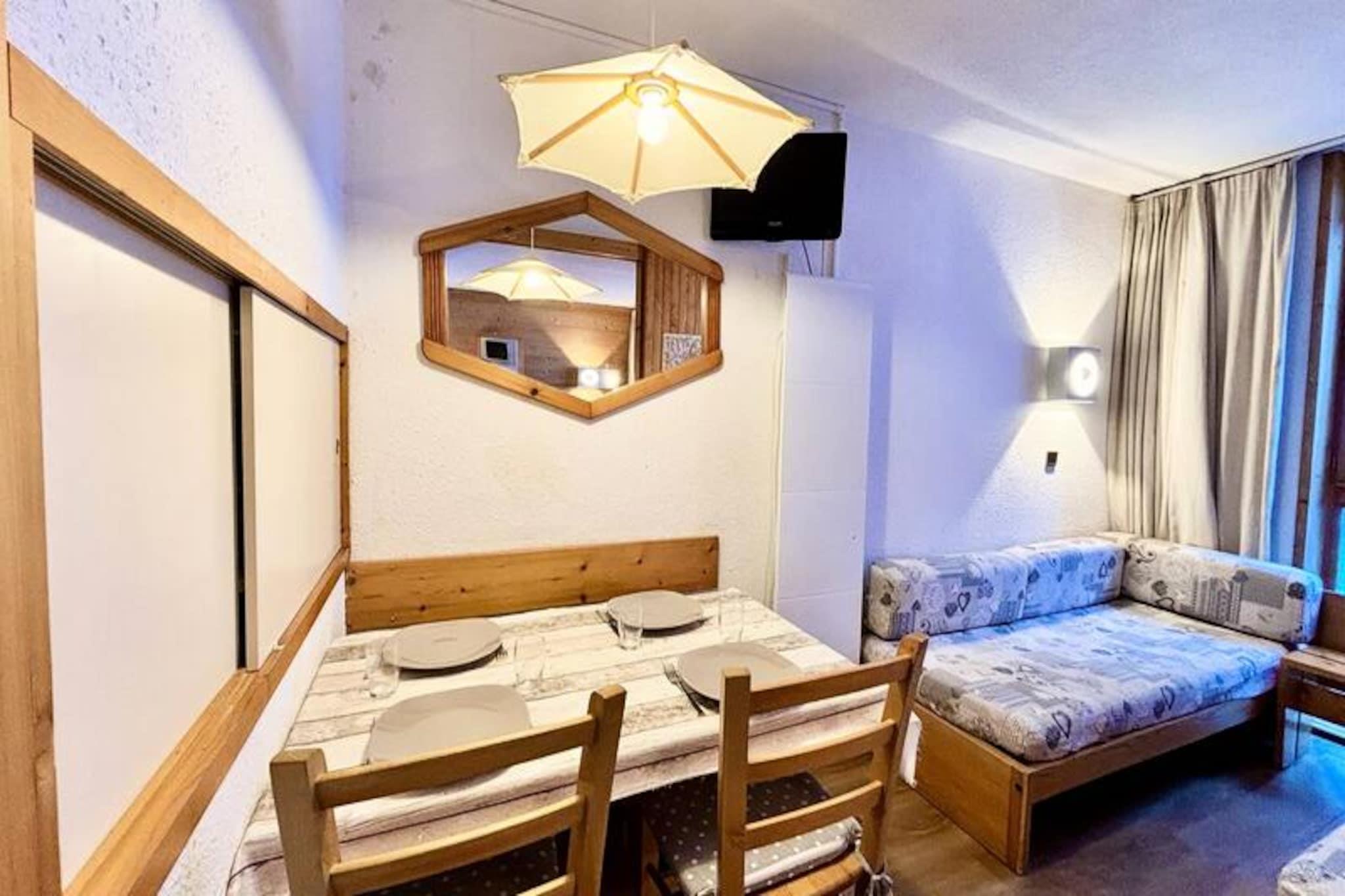 Amidst the serene beauty of Les Coches, this charming 27 m² studio offers a cozy alpine retreat for up to four guests. With its ground-floor location and south-facing terrace overlooking the enchanting fir trees, it’s the perfect spot to unwind after a day of mountain adventures. The studio’s clever design includes a movable partition to create a flexible living space, ensuring both comfort and privacy during your stay. \n\nInside, you’ll find a well-equipped kitchenette featuring a microwave, dishwasher, ceramic hobs, refrigerator, electric coffee maker, toaster, and even a raclette set for a true taste of the Alps. The living area includes four single beds and a TV, while the bathroom and separate toilet add convenience. The apartment is non-smoking, pet-free, and comes with cozy duvets for a restful night’s sleep. A ski locker is provided within the residence for easy access to the slopes.\n\nThe residence itself is a blend of traditional wood and stone architecture, seamlessly connected to nearby buildings for added convenience. Located in the heart of Les Coches, you’ll be steps away from shops, restaurants, and the lively Place du Carreau, where seasonal activities bring the village to life. Families will appreciate the proximity to the daycare and ESF ski school, while underground parking ensures hassle-free arrivals.\n\nWhether you’re here to carve through the Paradiski slopes or explore the summer trails, this studio offers a welcoming base for your alpine escape. Book now and immerse yourself in the charm and adventure of the French Alps.