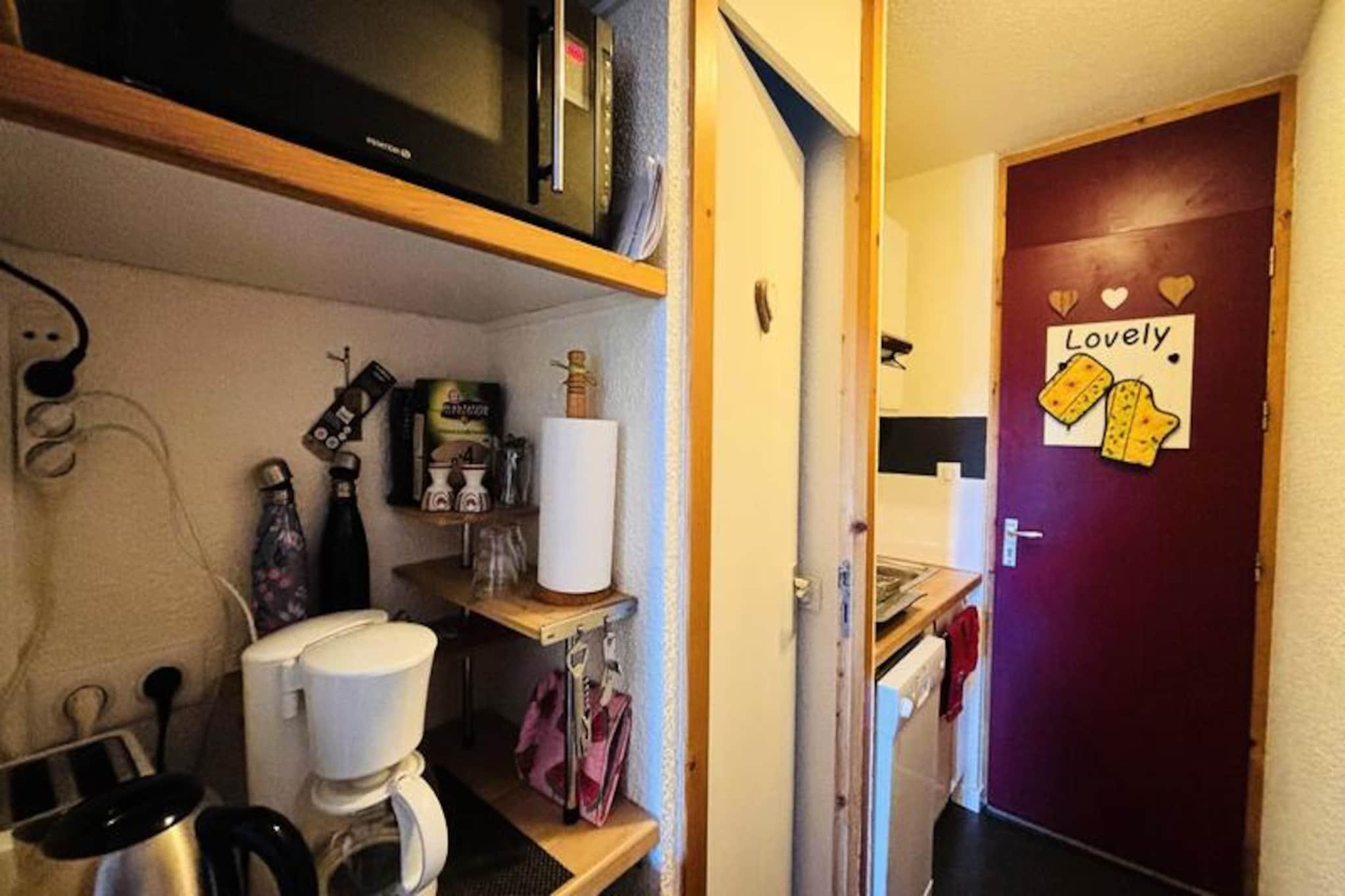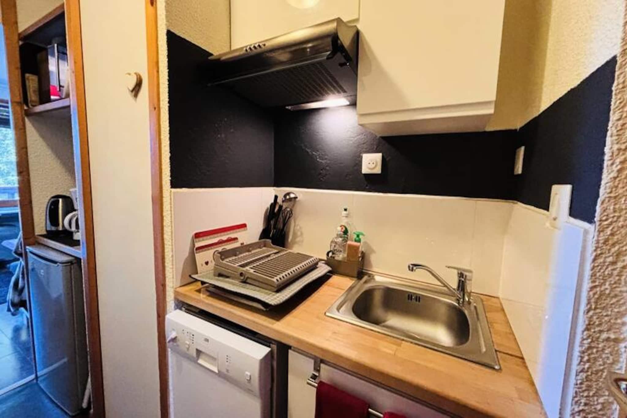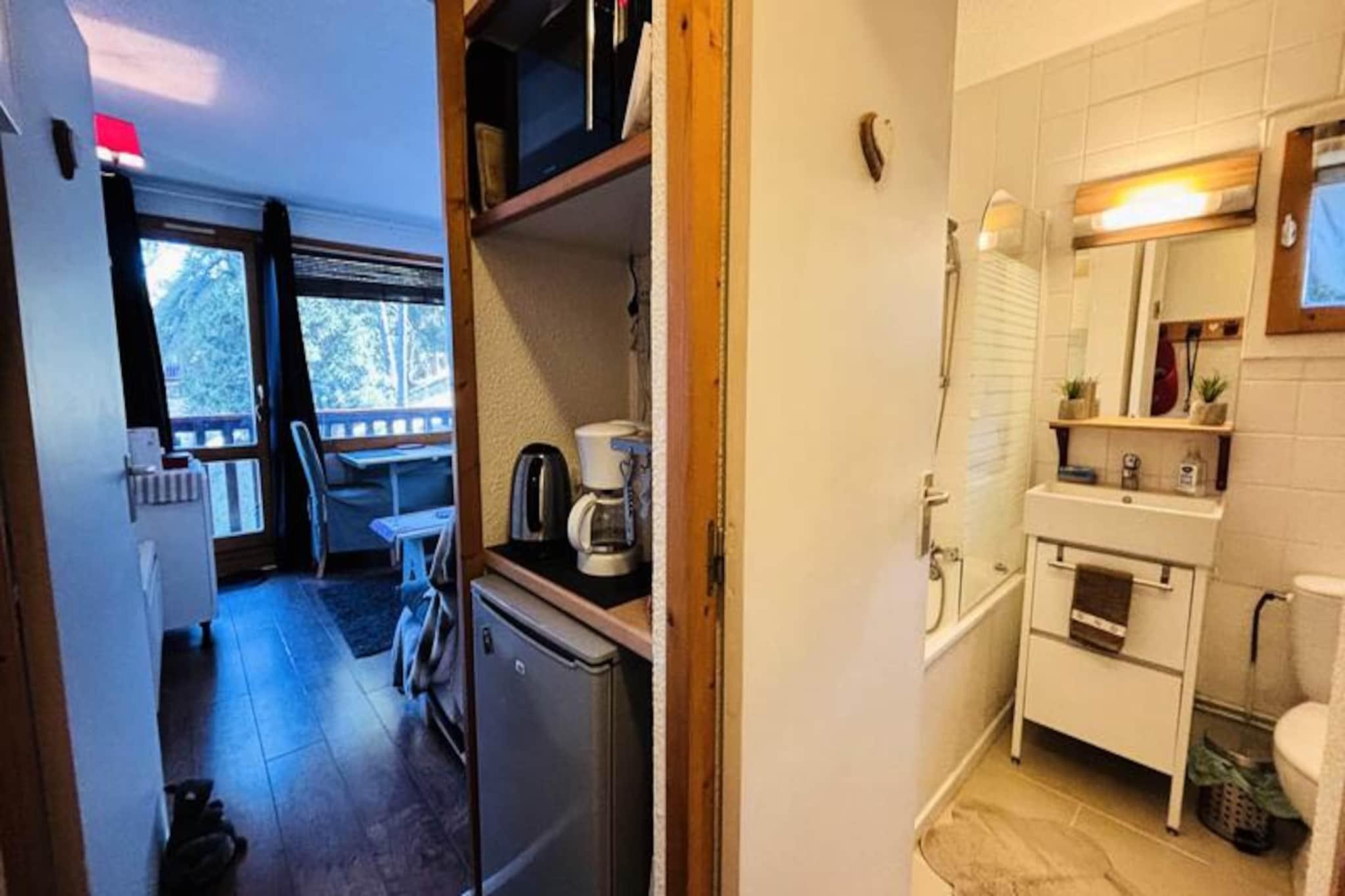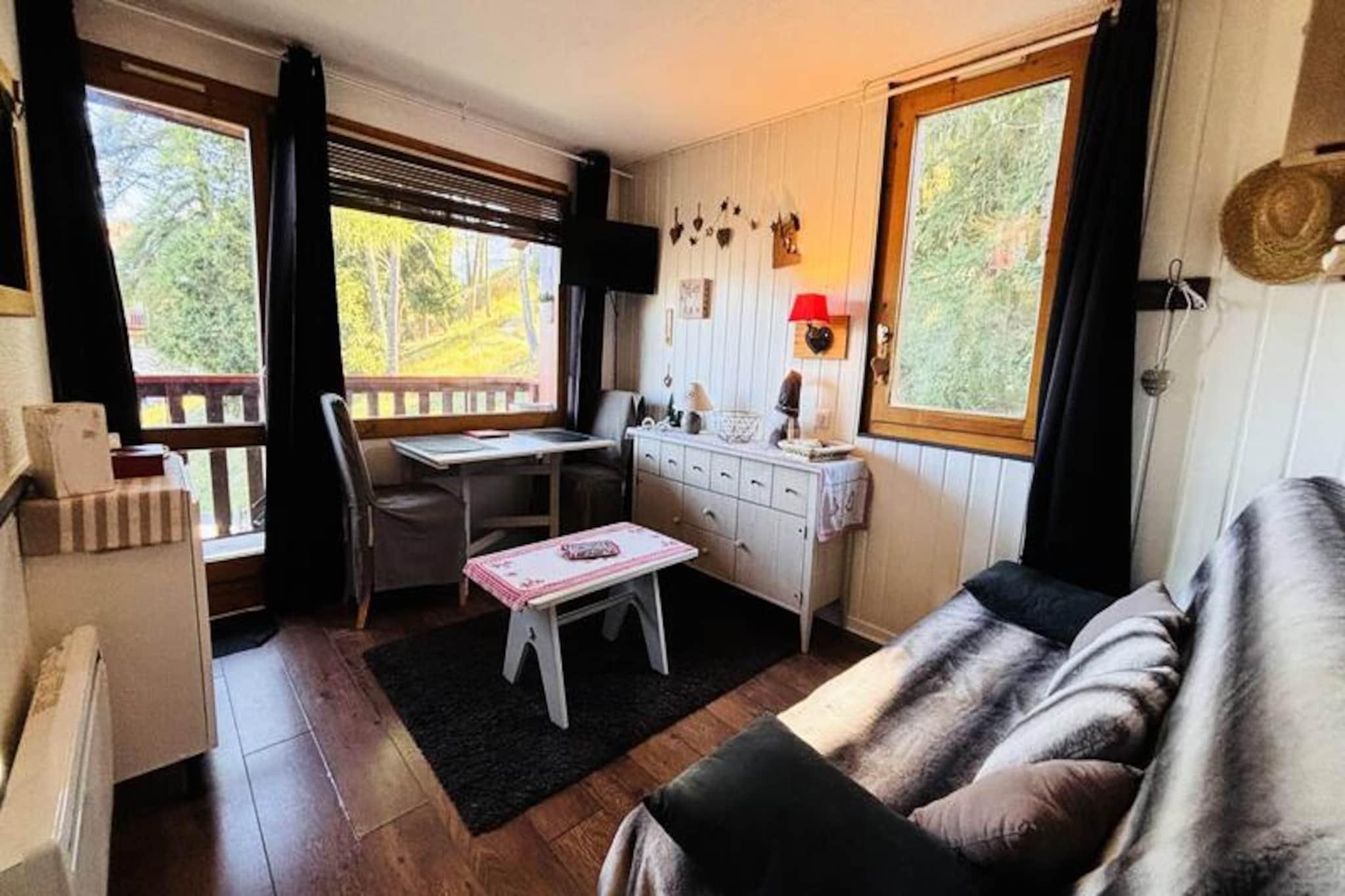 Surrounded by the serene beauty of the French Alps, this charming 17 m² studio offers a cozy retreat for two in the heart of the picturesque Le Hameau du Sauget. Wake up to the crisp mountain air and stunning northeast-facing views from your private balcony, where the majestic peaks and lush forests create a tranquil backdrop for your alpine escape. Perfectly situated on the edge of the forest, this studio blends traditional alpine architecture with modern comforts, making it an ideal haven for couples seeking a peaceful getaway. Step inside to find a thoughtfully designed space featuring a comfortable sofa bed, a flat-screen TV, and a well-equipped kitchenette complete with a combi oven, dishwasher, electric hotplates, and all the essentials for preparing delicious meals. The bathroom, with its clean and functional layout, ensures a refreshing start or end to your day. While the apartment does not include Wi-Fi, its cozy ambiance and breathtaking surroundings encourage you to disconnect and immerse yourself in the natural beauty of the region. Le Dé 2 residence boasts a prime location just 150 meters from the ski lifts, offering ski-in/ski-out convenience for winter sports enthusiasts. The nearby ESF ski school and kindergarten, along with shops just 200 meters away, ensure everything you need is within easy reach. In summer, the area transforms into a haven for hikers and nature lovers, with trails winding through the enchanting forest and beyond. Whether you’re here to carve through pristine slopes in winter or explore the vibrant alpine meadows in summer, this studio offers a warm and inviting base for your adventures. With its blend of comfort, charm, and unbeatable location, it’s the perfect choice for a memorable mountain getaway.